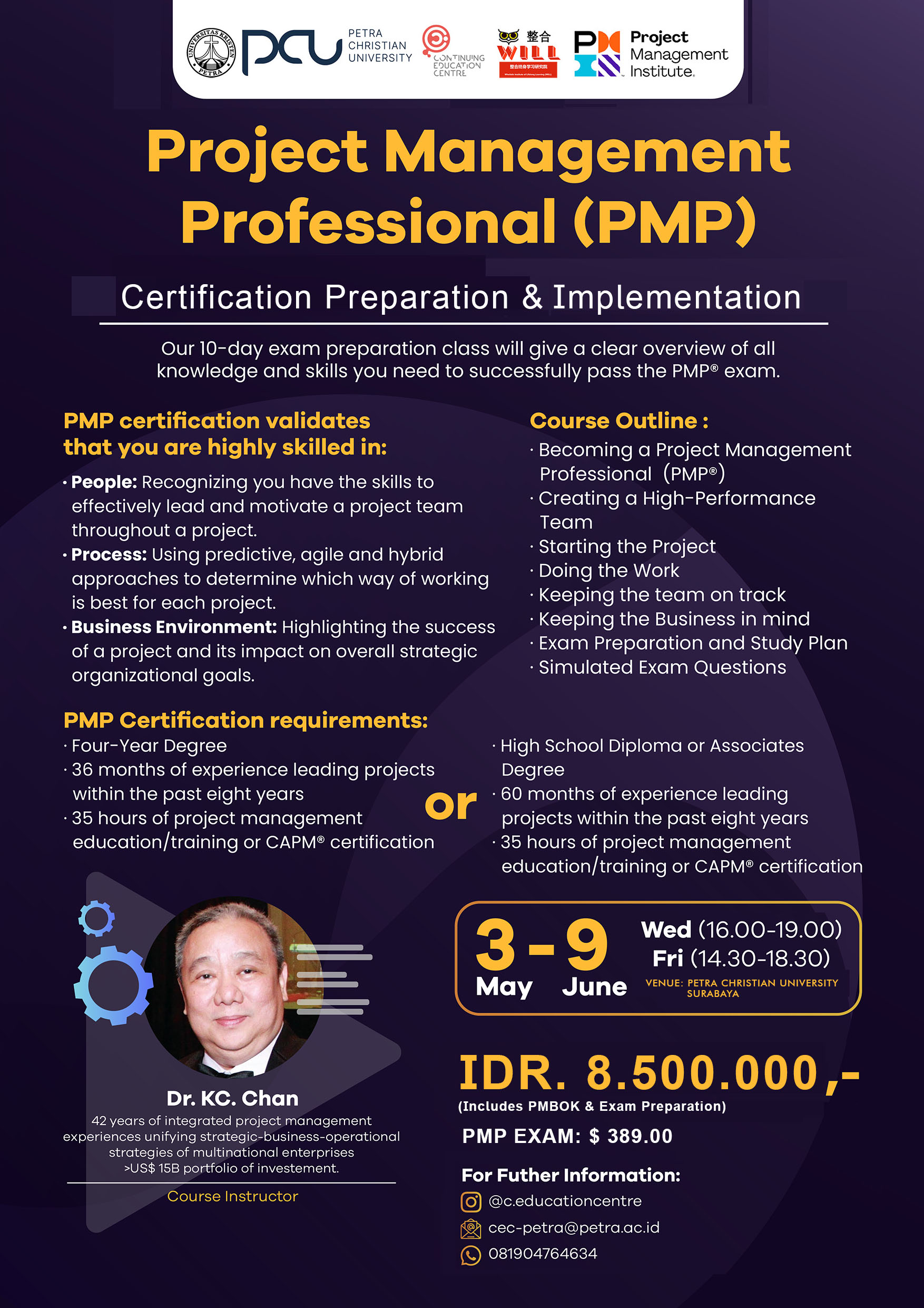 Program Pendidikan Berkelanjutan Universitas Kristen Petra Surabaya, mengadakan training sertifikasi Project Management Professional (PMP). Dengan instruktur Dr. KC. Chan. diadakan pada tanggal 3 Mei - 9 Juni 2023 dengan biaya 8.5 juta rupiah.