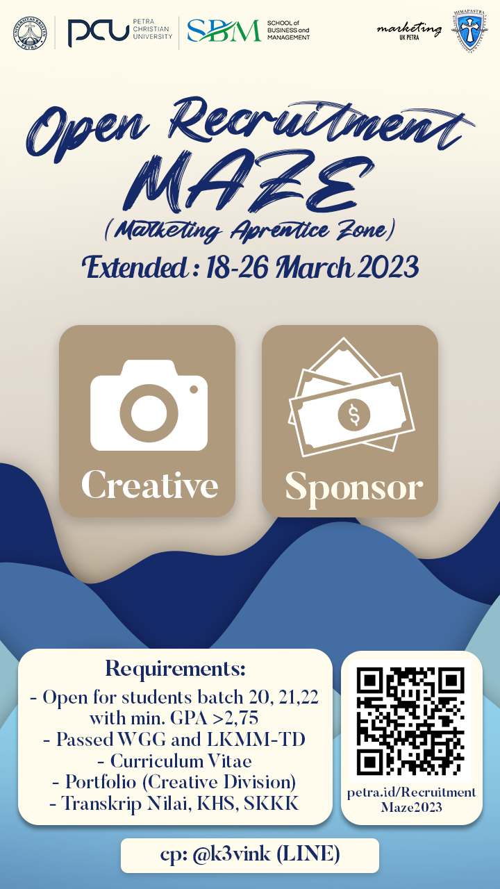 Program Studi Manajemen Universitas Kristen Petra Surabaya membuka kesempatan bagi mahasiswa UK Petra Untuk menjadi panitia dalamn acara MAZE ( Marketing Apprentice Zone). MAZE adalah kegiatan berbentuk rally games dan lomba yang diadakan oleh program marketing universitas kristen petra dan ditujukan kepada anak-anak sma di surabaya raya. Pendaftaran panitia dibuka pada tanggal 18-26 Maret 2023.