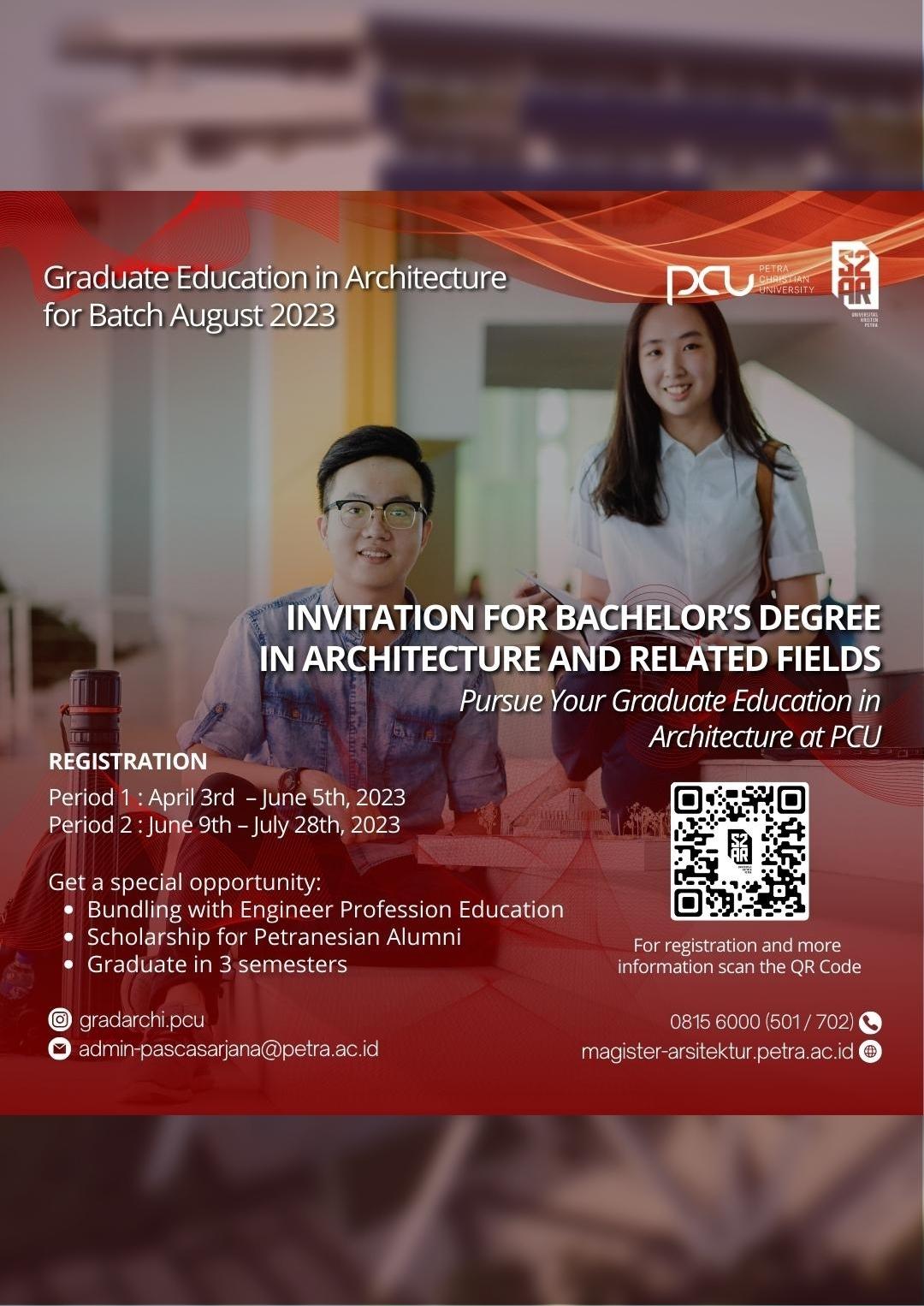 Program Studi Magister Arsitektur UK Petra Surabaya, membuka pendaftaran mahasiswa baru tahun 2023. Pendaftaran dibuka hingga tanggal 28 Juli 2023.