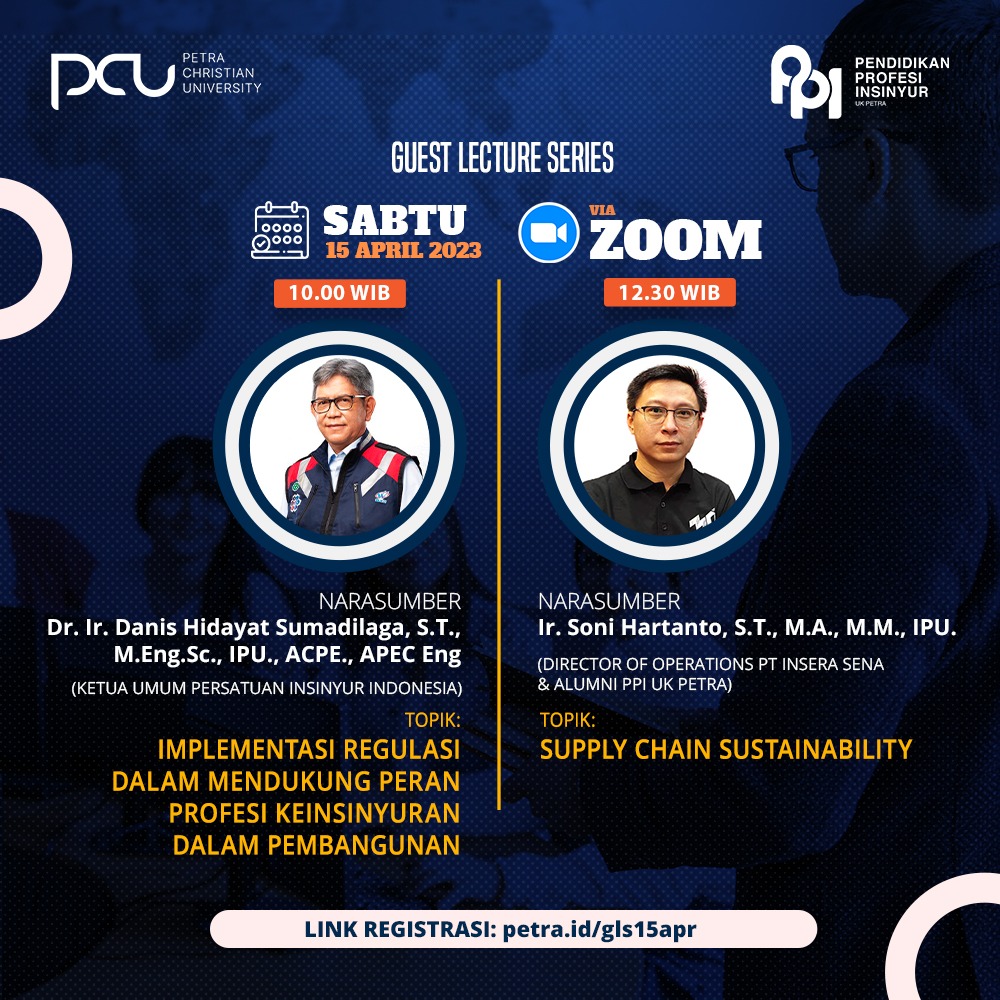 Pada tanggal 15 April 2023 Program Pendidikan Profesi Insinyur UK Petra Surabaya, mengadakan kuliah tamu dengan narasumber Dr. Danis Hidayat Sumadilaga dan Ir. Soni Hartanto. Acara ini ditayangkan melalui aplikasi Zoom.