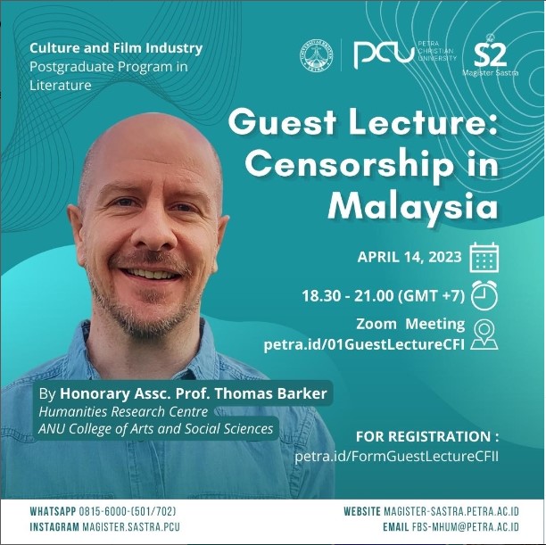 Program Studi Magister Sastra Universitas Kristen Petra Surabaya, pada 14 April 2023 jam 18.30 - 21.00 WIB mengadakan acara kuliah tamu. Dengan narasumber Thomas Barker. Acara ini diselenggarakan secara online dengan aplikasi Zoom.