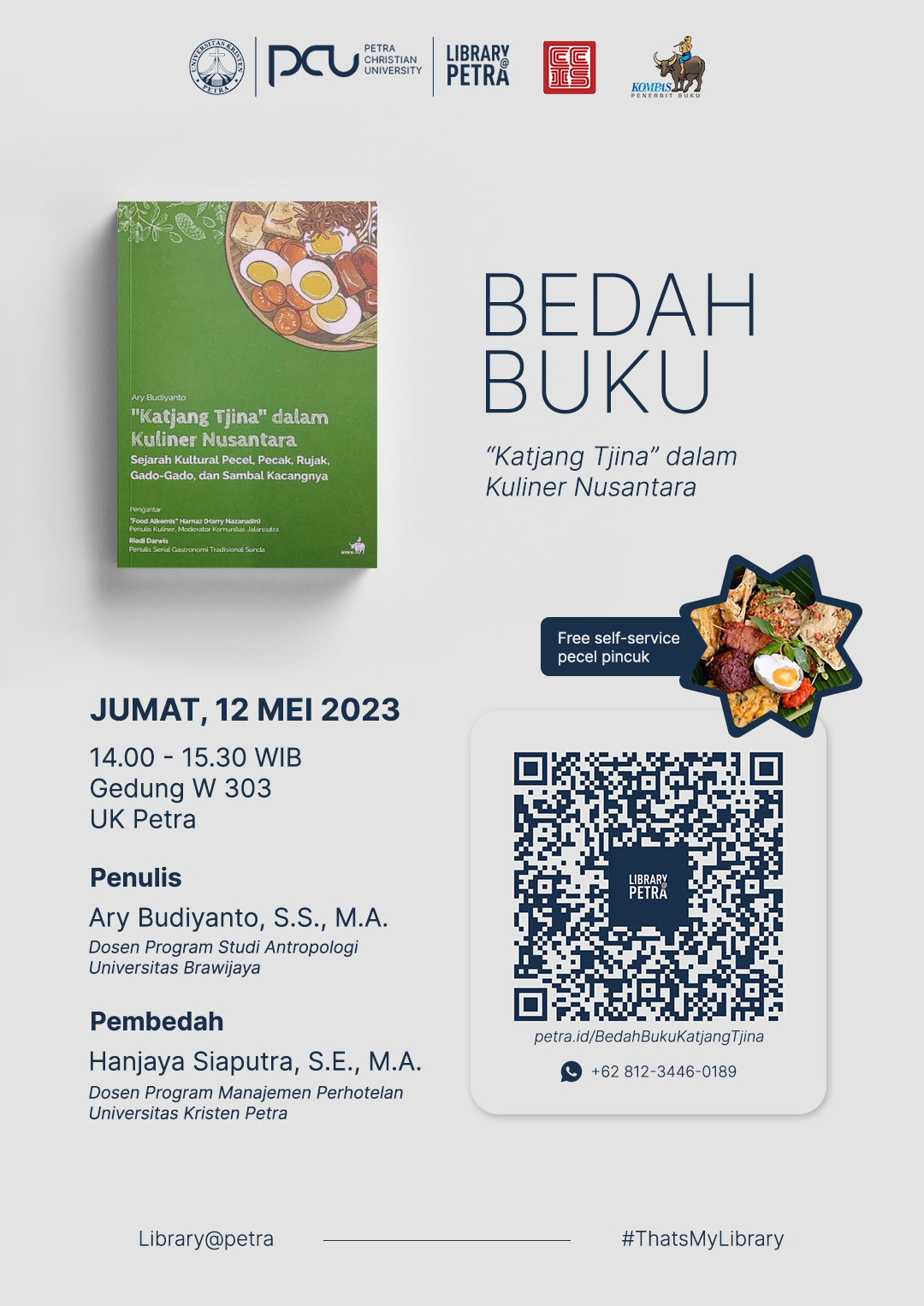 PCU Library kembali mengadakan bedah buku. Kali ini buku yang akan dibahas adalah "Katjang Tjina" dalam Kuliner Nusantara yang ditulis oleh Ary Budiyanto. Buku ini membahas tentang sejarah kultural pecel, pecak, rujak, gado-gado, dan sambal kacangnya yang disertai dengan sejarah keberadaan kacang sebagai bumbu utamanya. Acara ini diselenggarakan pada Jumat 12 Mei 2023 jam 14.00 - 15.30 WIB bertempat di gedung W.303.