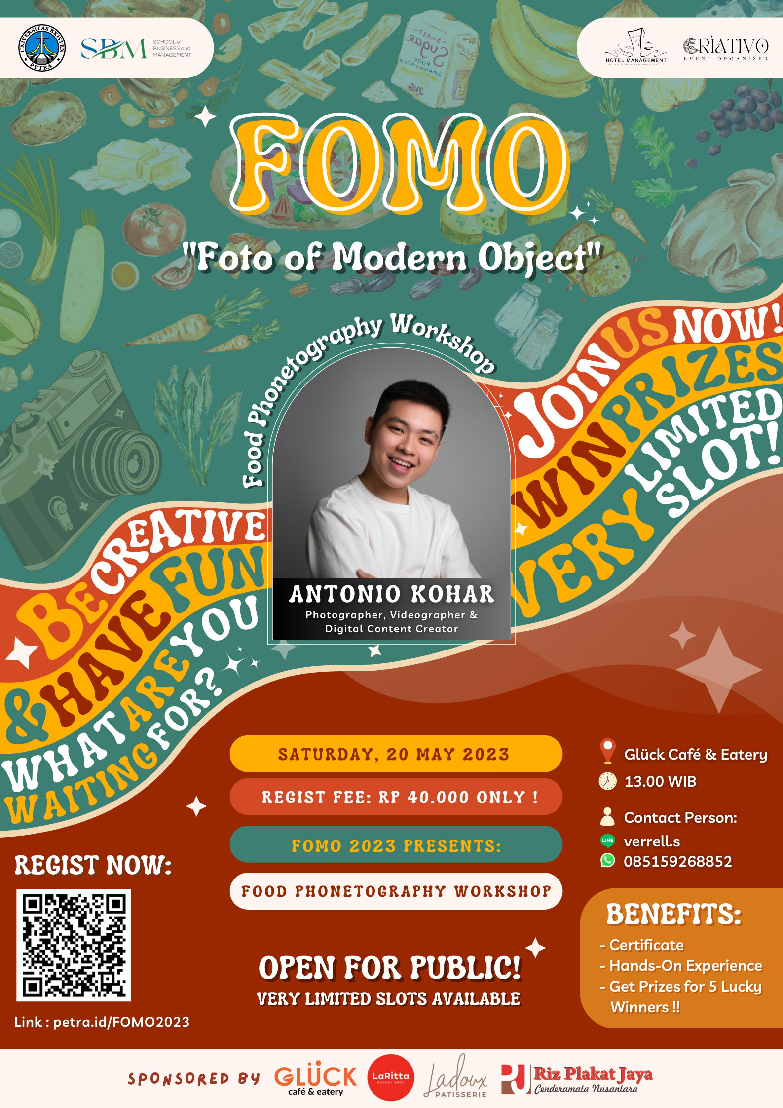 Punya ketertarikan di bidang fotografi, tapi gak punya kamera? Siapa bilang pakai handphone gak bisa bikin foto bagus? Untuk itu Program Manajemen Perhotelan UK Petra mengadakan pelatihan fotograpi. Dengan narasumber Antonio Kohar pada tanggal 20 Mei 2023.