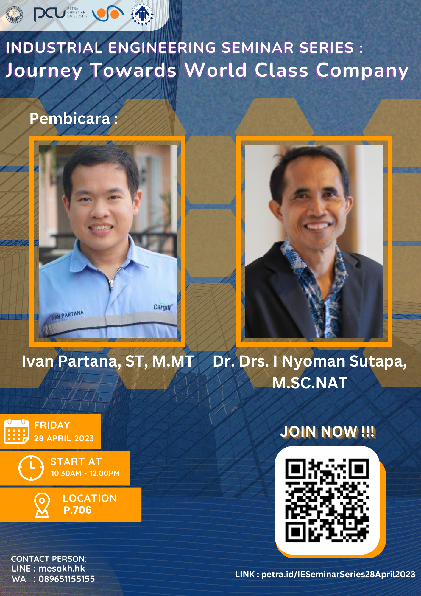 Industrial Engineering Seminar Series: Journey Towards World Class Company merupakan salah satu seri dari seminar rutin yang diadakan oleh Fakultas Teknik Industri untuk memenuhi kebutuhan mahasiswa/i, dengan mendatangkan pembicara yang berpengalaman. Yaitu Ivan Partana, S.T., M.Mt. serta Dr. Drs., I Nyoman Sutapa, M.Sc.Nat. Acara ini diselenggarakan pada 28 April 2023 jam 10.30 - 12.00 WIB.