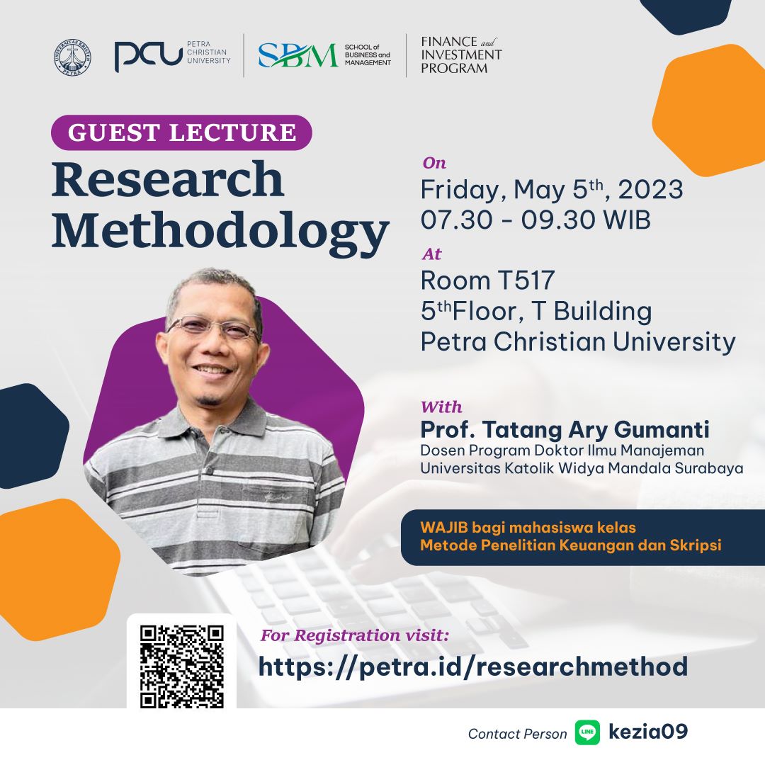 Kuliah Tamu tentang Metode Riset khusus bagi Mahasiswa Program Finest yang mengambil kelas Metode Penelitian Keuangan (MPK) dan Skripsi. Acara ini diadakan pada Jumat, 05 Mei 2023 jam 07.30 - 09.30 WIB bertempat di gedung T.517 dengan narasumber Prof. Tatang Ary Gumanti.