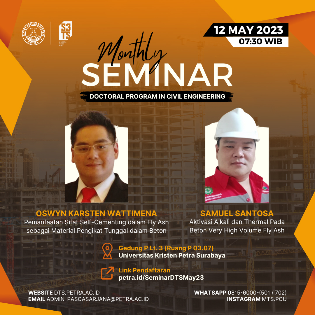 Program Studi Doktor Teknik Sipil UK Petra mengadakan acara seminar pada Jumat, 12 Mei 2023 jam 07.30 WIB Gedung P Lt. 3 (Ruang P 03.07) Universitas Kristen Petra Surabaya
