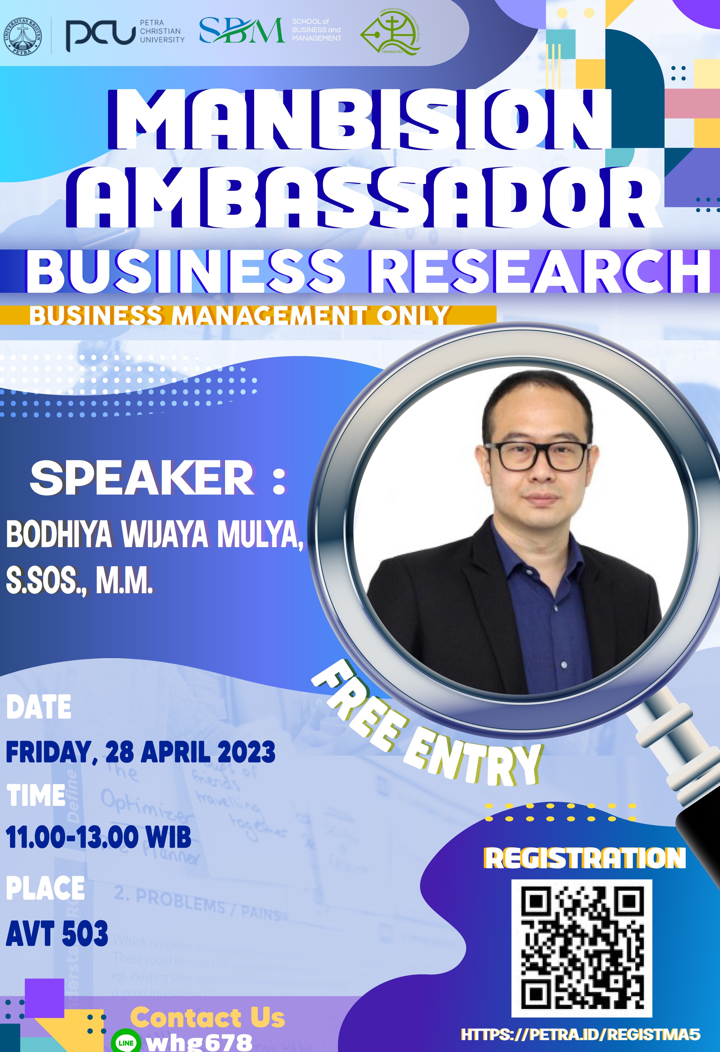 Pada tanggal 28 April 2023 Program Manajemen Bisnis Universitas Kristen Petra Surabaya mengadakan acara Manbission Ambassador. Dengan narasumber Bodhiya Wijaya Mulya, M.M