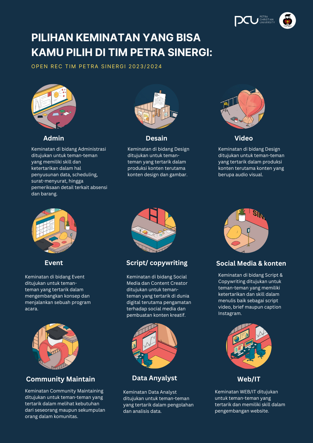 Beberapa posisi yang dibutuhkan oleh Tim Petra Sinergi Universitas Kristen Petra Surabaya.