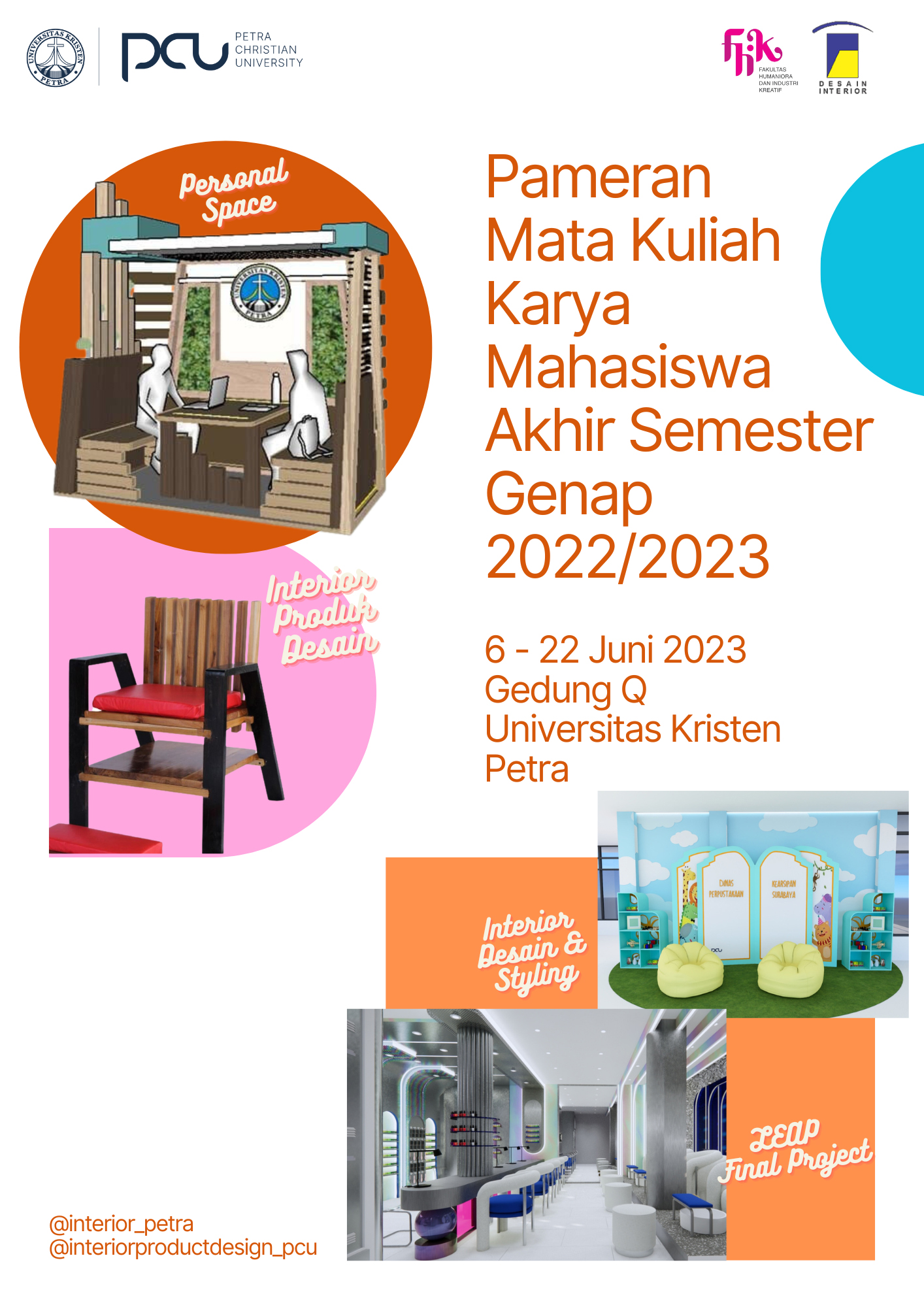 Pameran Mata Kuliah Karya Mahasiswa di Akhir Semester merupakan pameran kolaborasi dari beberapa mata kuliah dari semester 2 hingga semester akhir yang mengambil Tugas Akhir diadakan oleh Program Studi Desain Interior Universitas Kristen Petra Surabaya pada tanggal 06-22 Juni 2023, bertempat di gedung Q.
