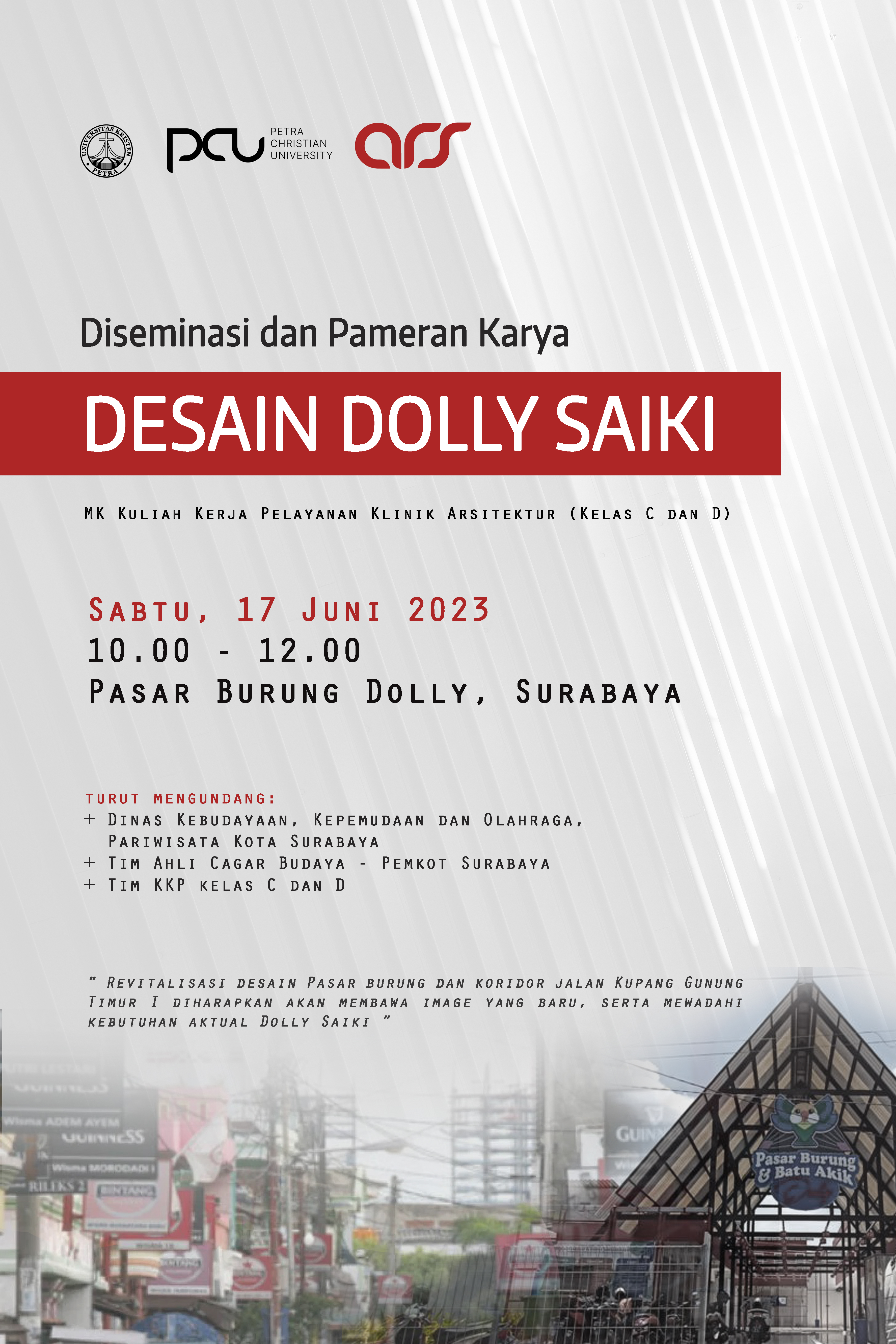 Diseminasi dan pameran karya dari mahasiswa Program Studi Teknik Arsitektur Universitas Kristen Petra Surabaya. Dengan mengangkat tema redesain kawasan Dolly. Acara ini diadakan pada Sabtu, 17 Juni 2023 jam 10.00 - 12.00 WIB bertempat di Pasar Burung Dolly, Surabaya.