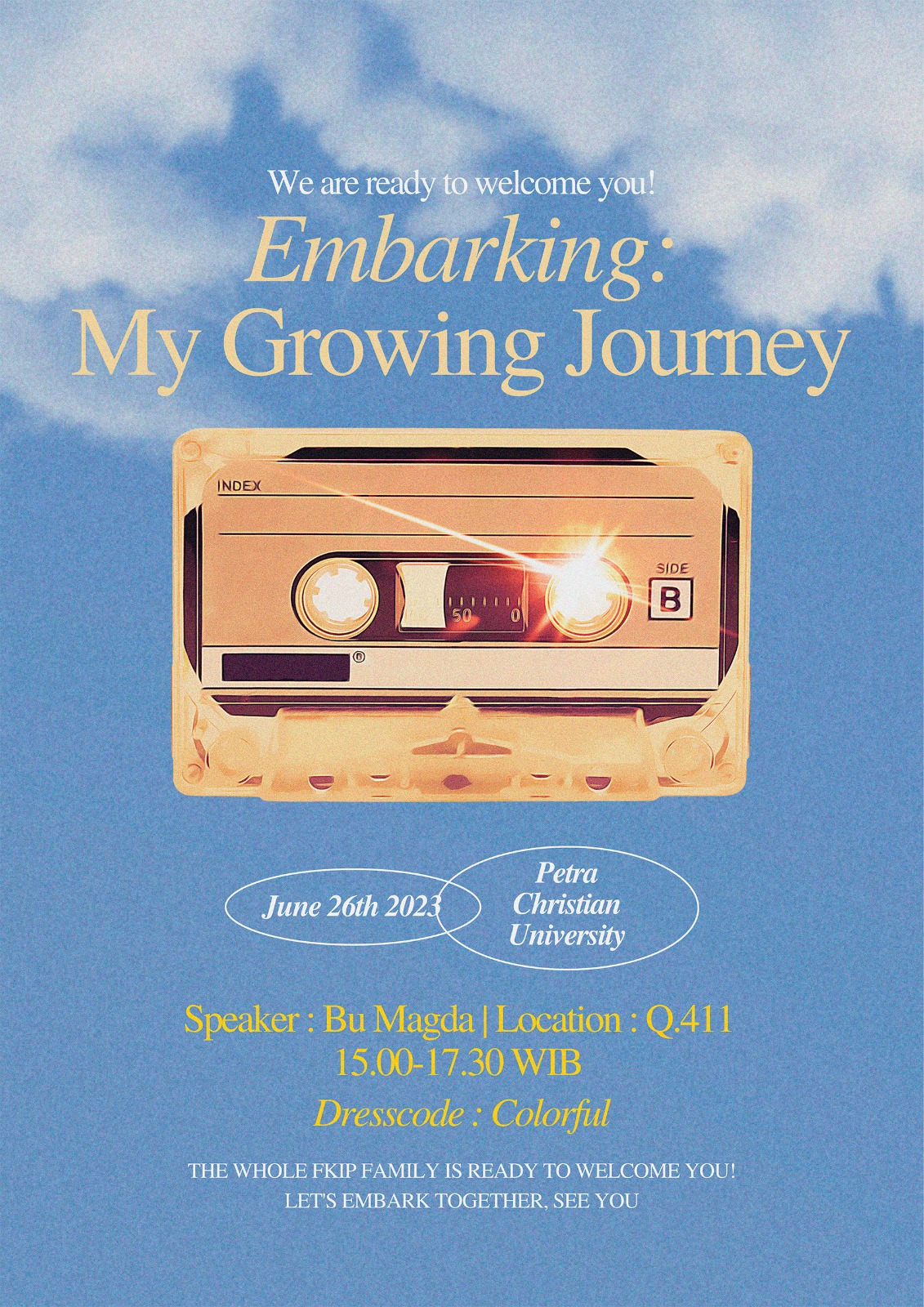 Welcome fellowship merupakan acara penyambutan adik-adik angkatan 2020 fakultas keguruan dan ilmu pendidikan. Acara ini diselenggarakan pada 26 Juni 2023 jam 15.00 - 17.30 WIB bertempat di gedung Q.411 dengan narasumber ibu Magdalena Pranata