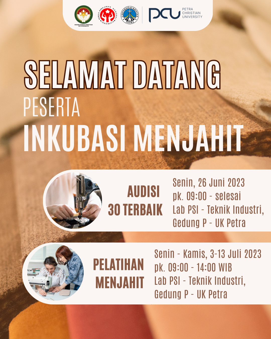Inkubasi menjahit ini merupakan kolaborasi antara Universitas Kristen Petra dengan Dharma Wanita Persatuan (DWP) Kota Surabaya dan Dewan Kerajinan Nasional Daerah (Dekranasda) Kota Surabaya. Pelatihan menjahit ini dilaksakan pada 3-13 Juli 2023 di Lab PSI Teknik Industri UK Petra.
