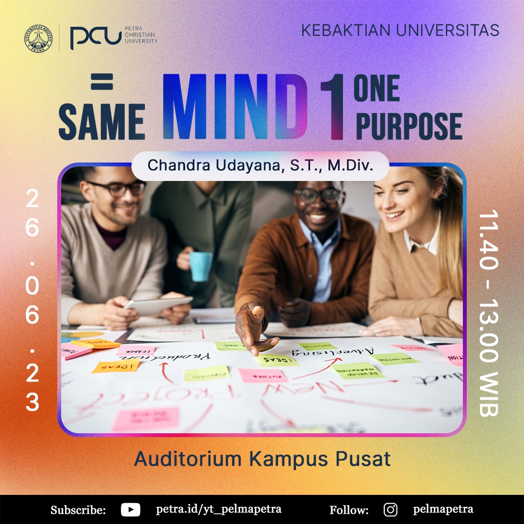 Kebaktian Universitas setiap hari Senin, diadakan pada tanggal 26 Juni 2023 jam 11.40 - 13.00 WIB bertempat di Auditorium kampus pusat Universitas Kristen Petra Surabaya. Pada kebaktian ini mengangkat tema "same mind one purpose" dengan pengkhotbah bapak Chandra Udayana, S.T.,M.Div.
