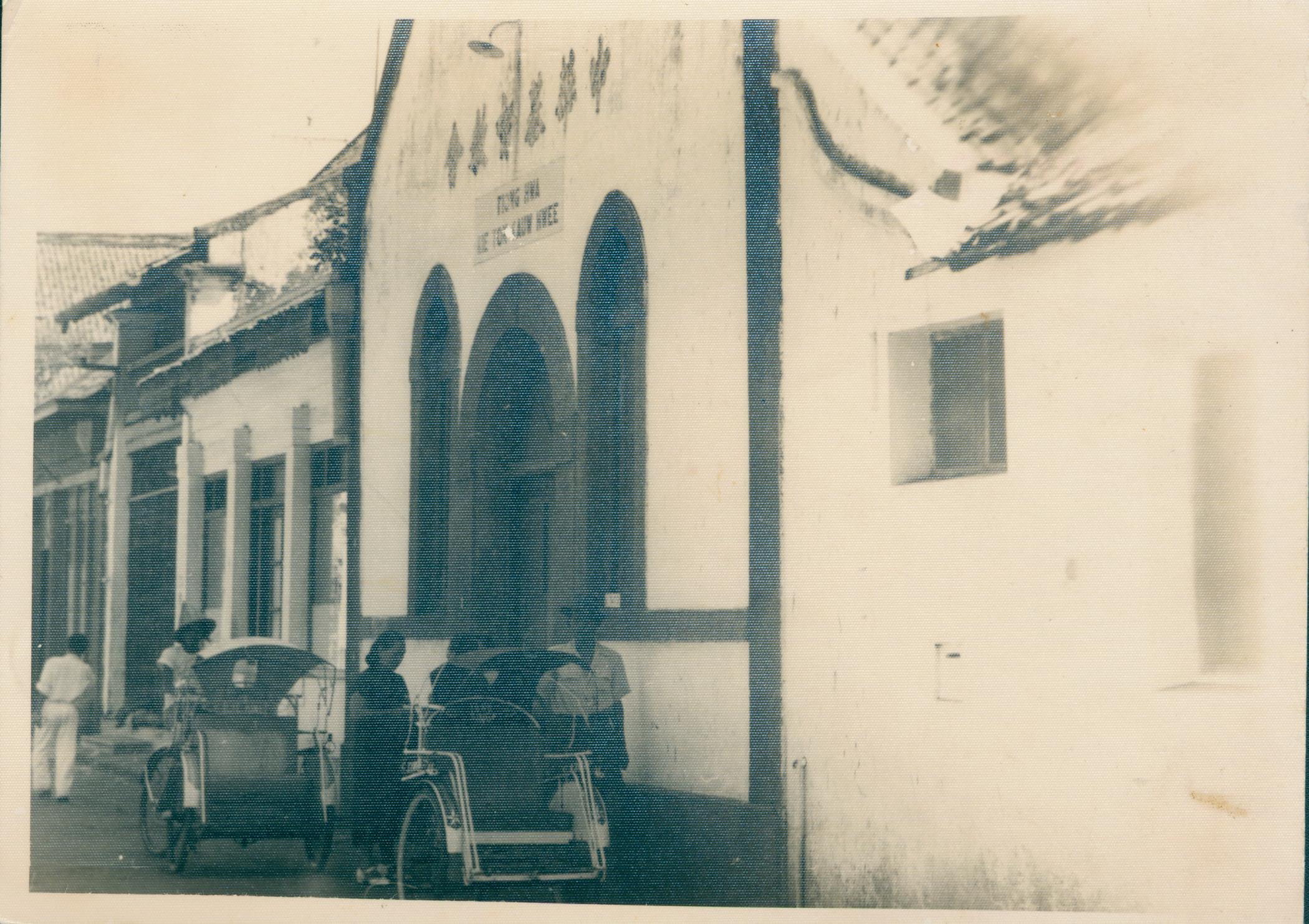 Pintu masuk gedung gereja Tiong Hoa Kie Tok Kauw Hwee (THKTKH) Surabaya yang juga dikenal dengan nama Gereja Sambongan, Gereja Bakmi atau sekarang Gereja Samudra. Gereja sebelum dibongkar menghadap Jalan Tjaipo No. 2 (sekarang Jalan Kopi) (Foto diambil tanggal 25 Juni 1952)