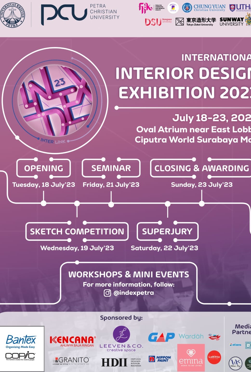 Program Studi Desain Interior UK Petra, mengadakan acara Interior Design Exhibition 2023. Acara ini digelar pada 18-23 Juli 2023 bertempat di Ciputra World Mall Surabaya. Banyak ragam acara yang dilaksanakan, seminar, workshop, lomba-lomba.