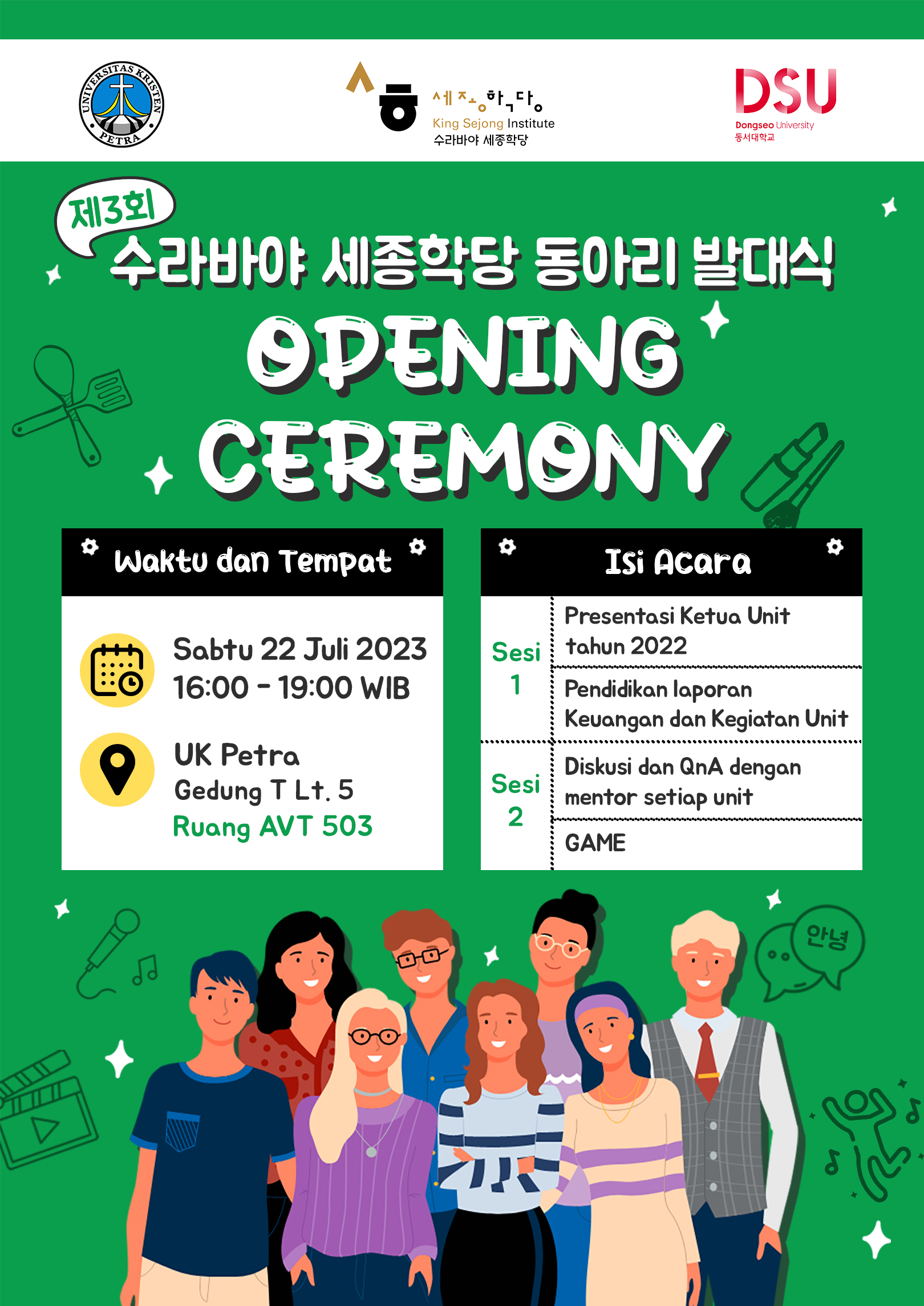 King Sejong Institute mengadakan acara pembukaan program kerja KSI yang ke-3. Acara ini digelar pada tanggal 22 Juli 2023, jam 16.00 - 19.00 WIB bertempat di Ruang AV.T.503.