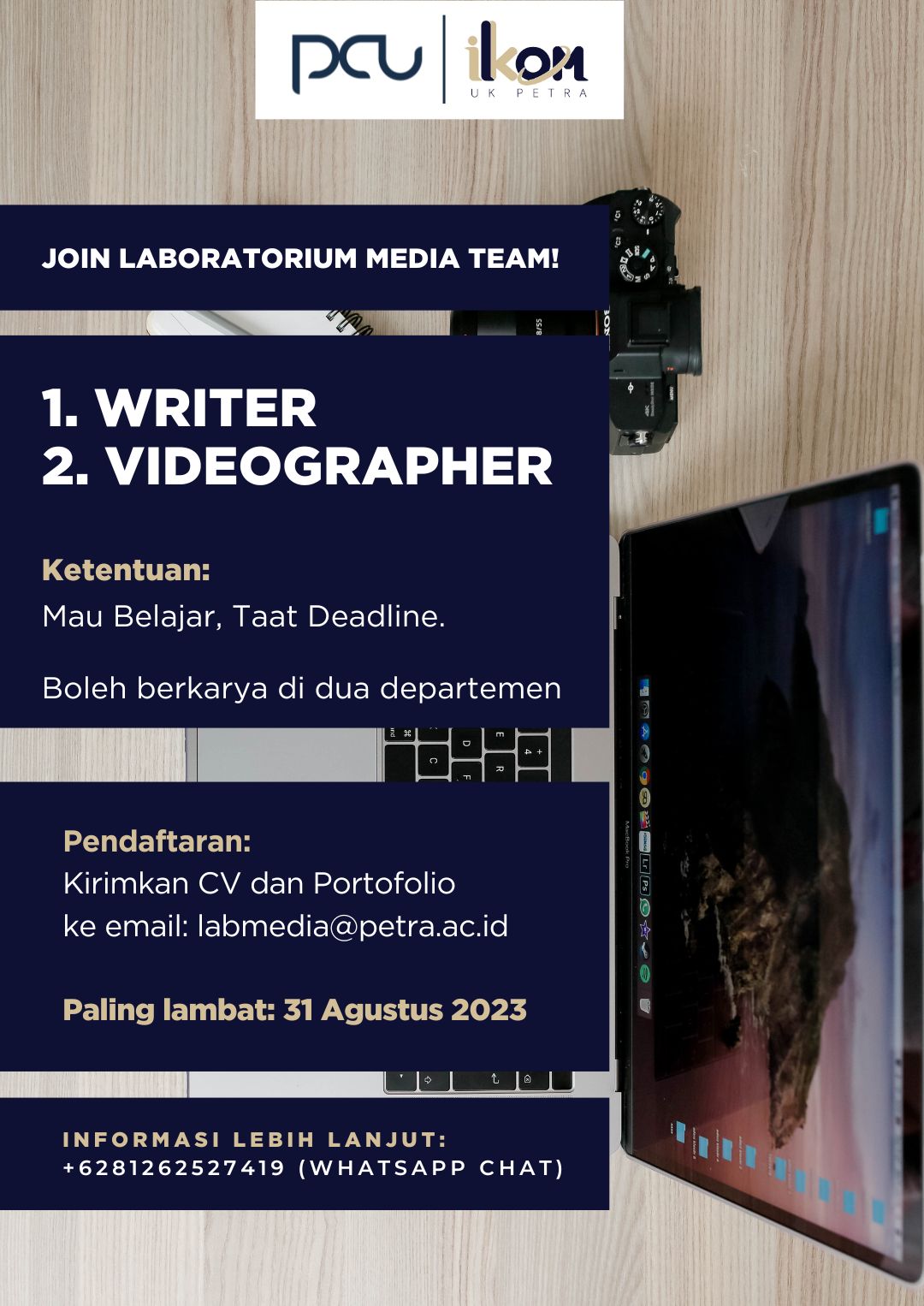 Tim laboratorium media UK Petra Surabaya, membuka kesempatan bagi mahasiswa Ilmu Komunikasi UK Petra Surabaya untuk bergabung dalam tim. Dibutuhkan tenaga untuk penulis dan videografer. Kesempatan ini ditutup pada tanggal 15 Agustus 2023.