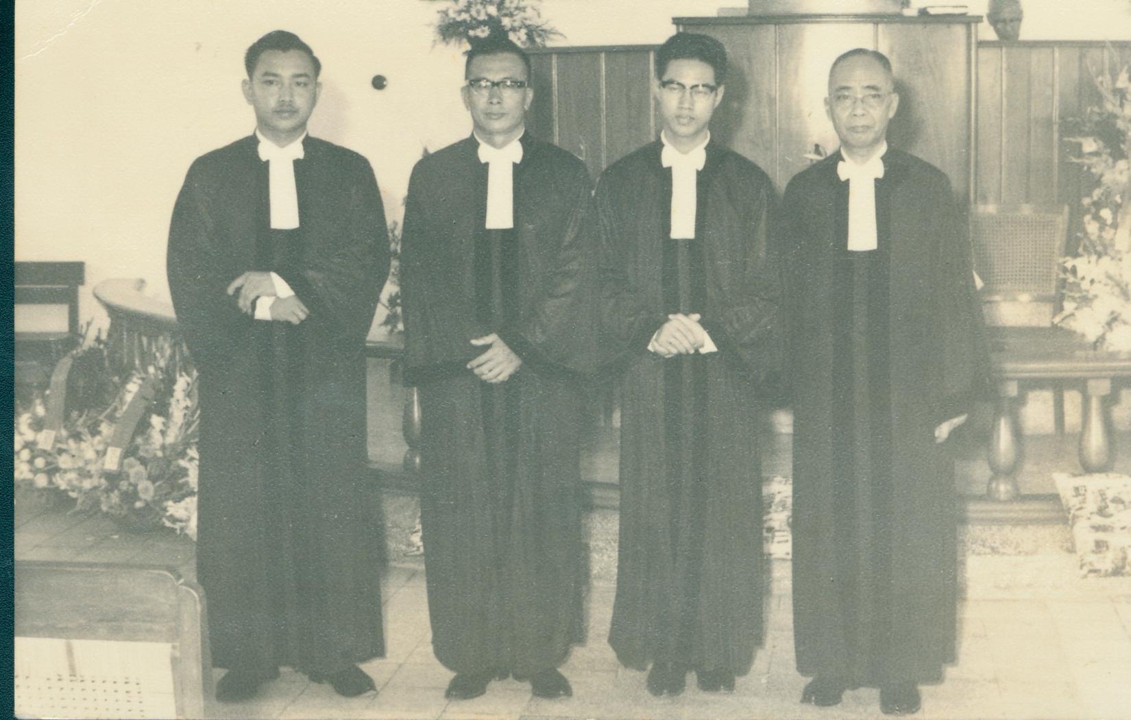 Dari kiri ke kanan Petrus Praseteya (Lauw Siok Ling), Philip Wangsa (Ong Beng Bian), Joseph Tong (Tong Tjong Huai), Pdt. Baring L. Yang. Pentahbisan Pendeta Joseph Tong, Philip Wangsa, dan Petrus Praseteya oleh Pdt. Baring L. Yang tanggal 16 Februari 1966 di gereja Jalan Samudra (dulu masih menggunakan Jalan Bakmi)