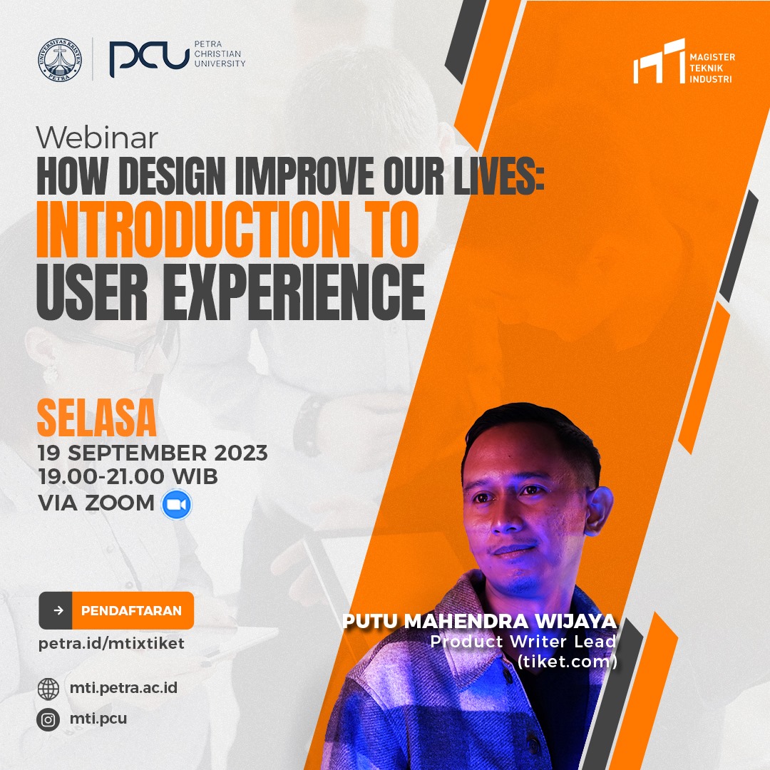Webinar dengan tema: How design improve our lives: introduction to user experience diselenggarakan oleh Magister Teknik Industri Universitas Kristen Petra Surabaya. Dengan menghadirkan Putu Mahendra Wijaya sebagai narasumber, webinar ini dilaksanakan pada Selasa, 19 September 2023 jam 19.00 - 21.00 WIB. Via Zoom meeting.