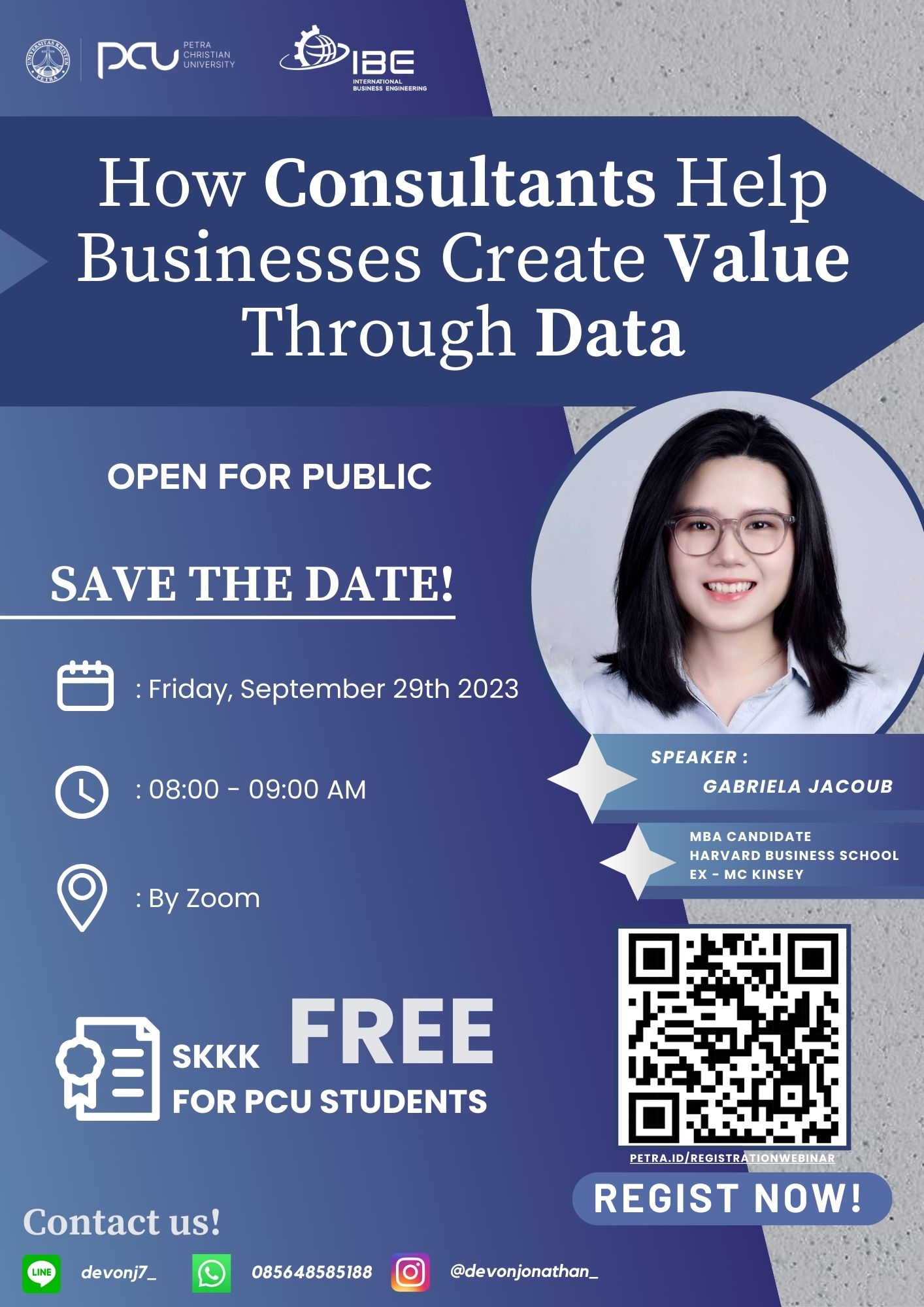 Rasa penasaran Anda akan terjawab oleh pembicara ahli kami, Ibu Gabriela Jacoub, lulusan Akuntansi Universitas Indonesia dan saat ini sedang mengejar gelar MBA di Harvard Business School. Ini akan membantu Anda untuk mempelajari lebih dalam dunia konsultasi dengan menggunakan data.