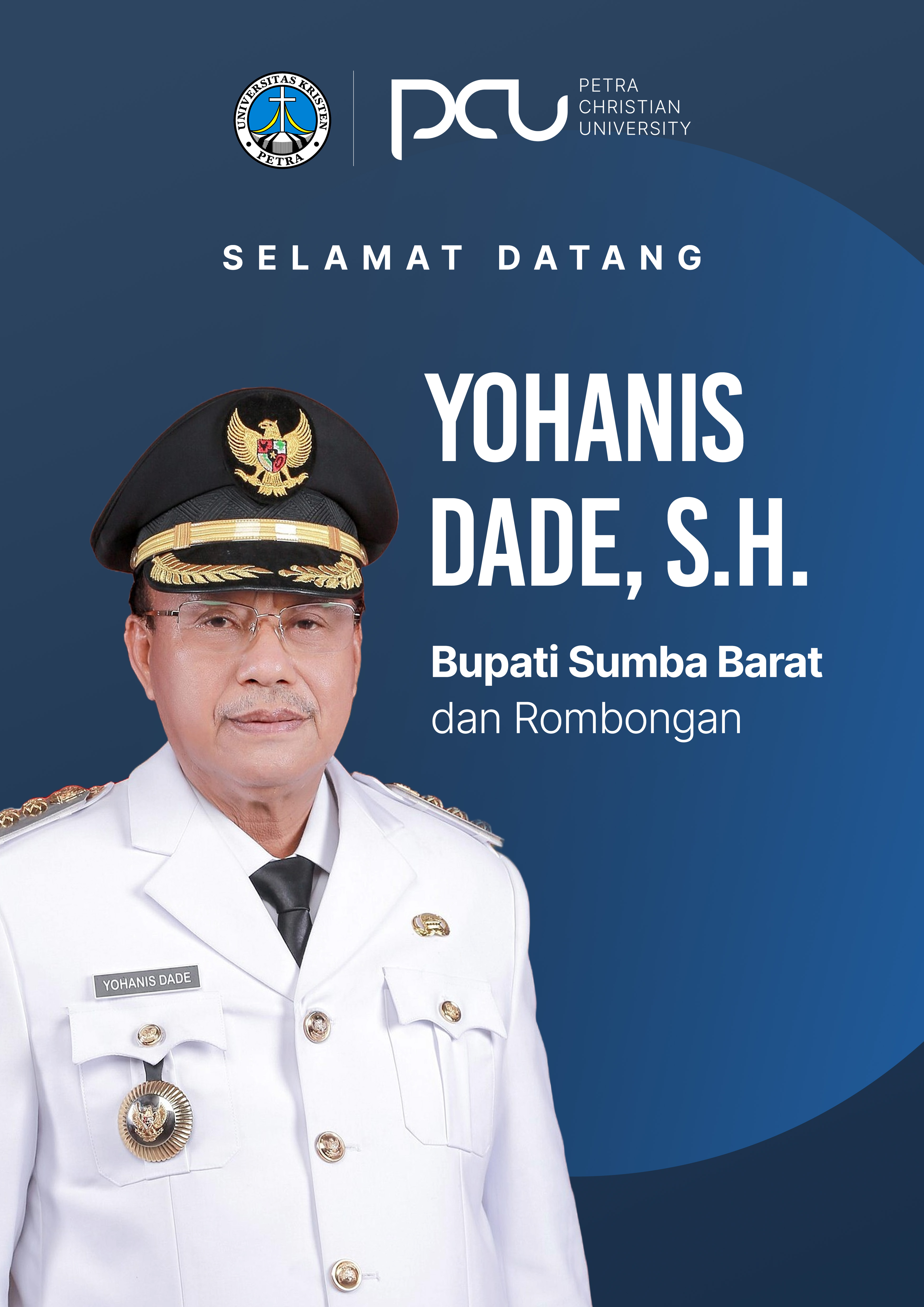 Ucapan selamat datang Yohanis Dade bupati Sumba Barat NTT beserta rombongan pada tanggal 27 September 2023, di kampus Universitas Kristen Petra Surabaya