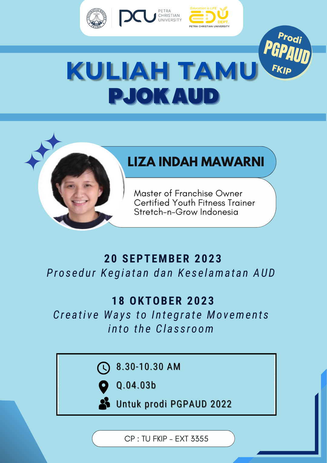 Kuliah tamu di kelas PJOK untuk PGPAUD angkatan 2022. Kuliah tamu ini dilaksanakan 2 hari yaitu di 20 September dan 18 Oktober 2023. Pembicaranya adalah Bu Liza Indah Mawarni.