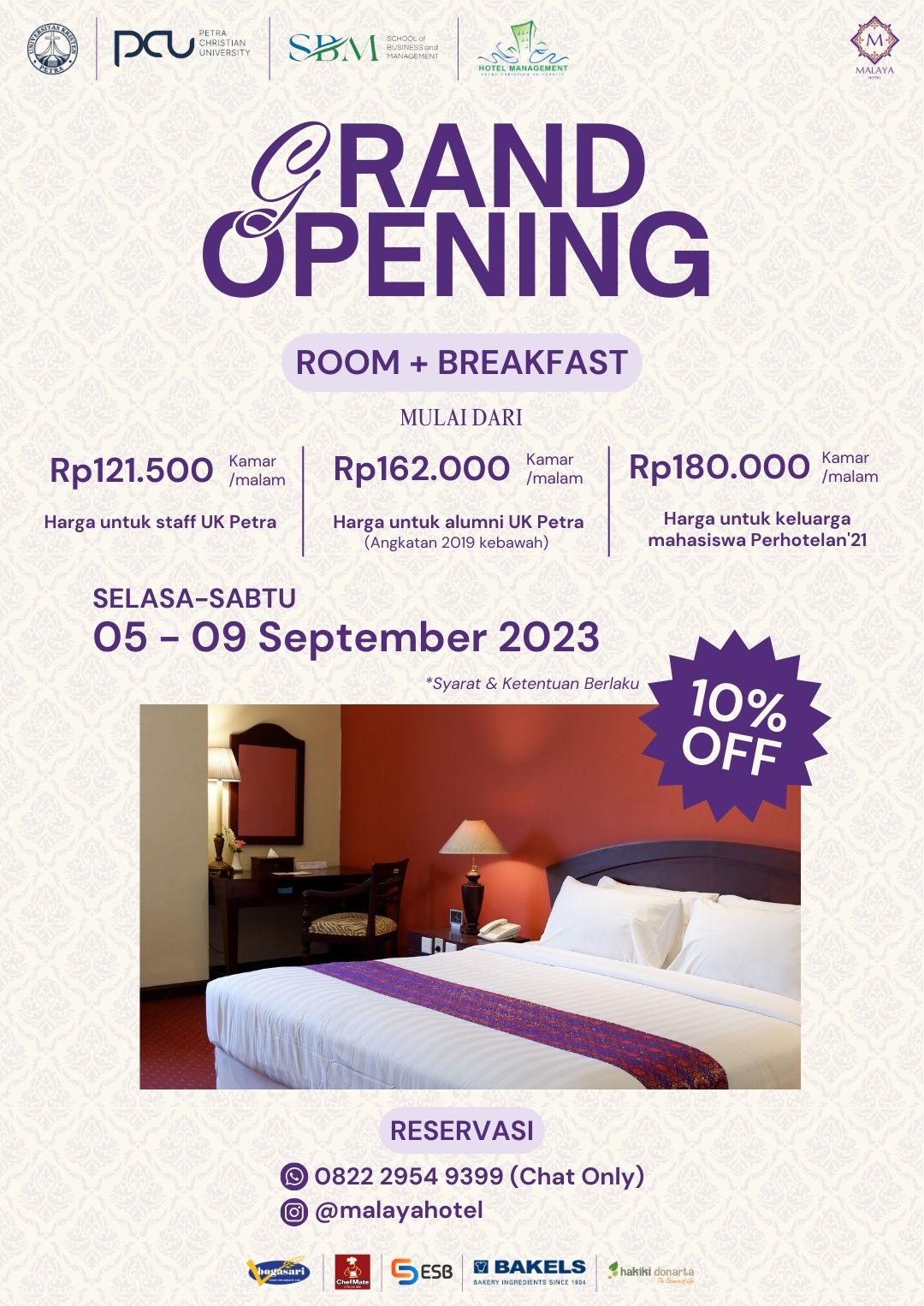 Dalam rangka mengasah ketrampilan dan kecapakan di bidang pelayanan perhotelan, Program Manajemen Perhotelan UK Petra mengadakan kegiatan praktikum pelayanan hotel. Malaya Hotel yang dikelola oleh para mahasiswa Manajemen Perhotelan telah dibuka dengan menawarkan berbagai macam layanan hotel.