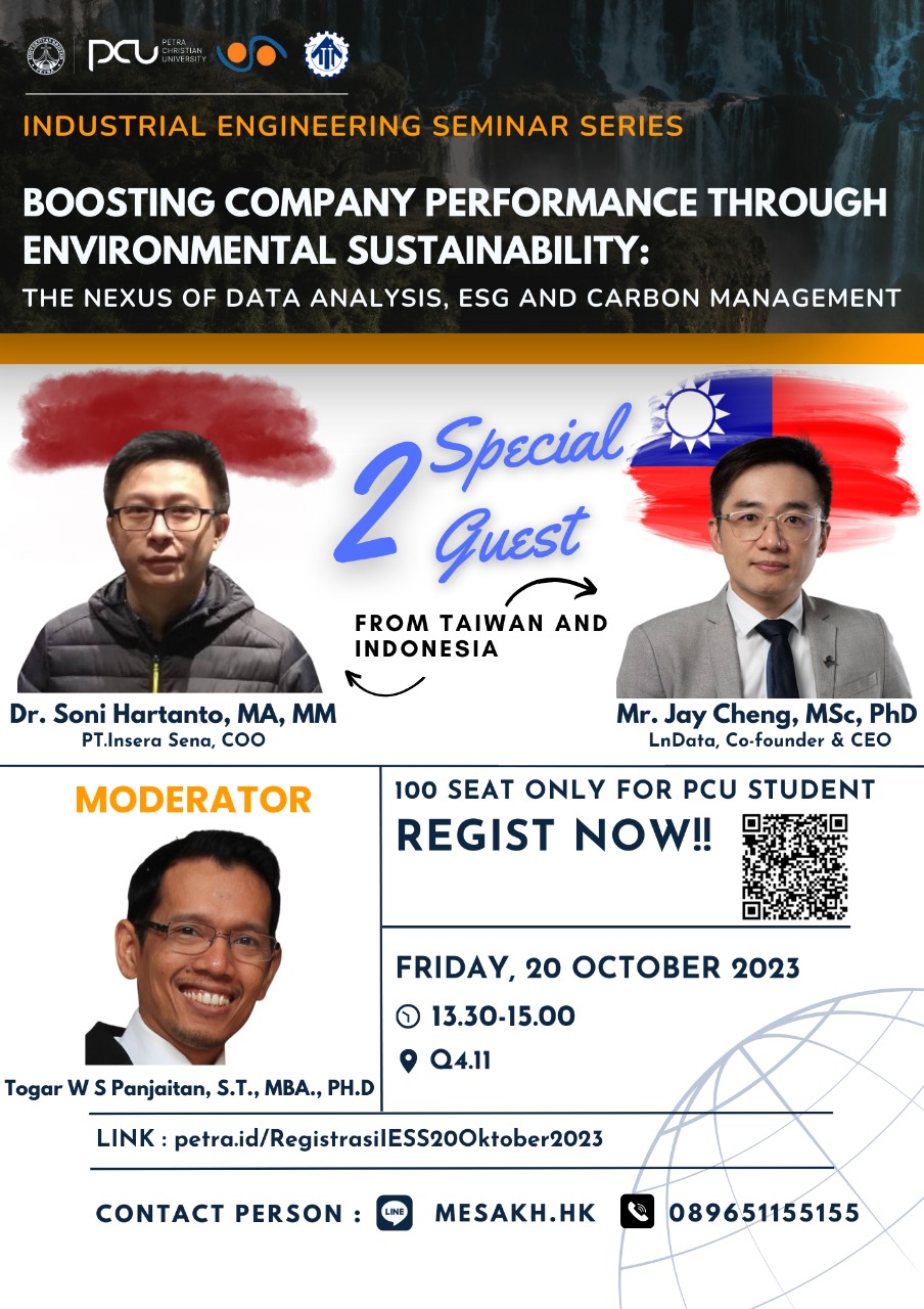 Pada IESS kali ini akan membahas secara luas mengenai bagaimana data analisis, ESG, dan carbon management dapat menumbuhkan performa suatu perusahaan. Seminar ini diadakan 20 Oktober 2023 jam 13.30 - 15.00 dengan mengundang Dr. Soni Hartanto, M.A., M.M., dan Jay Cheng, M.Sc., Ph.D.