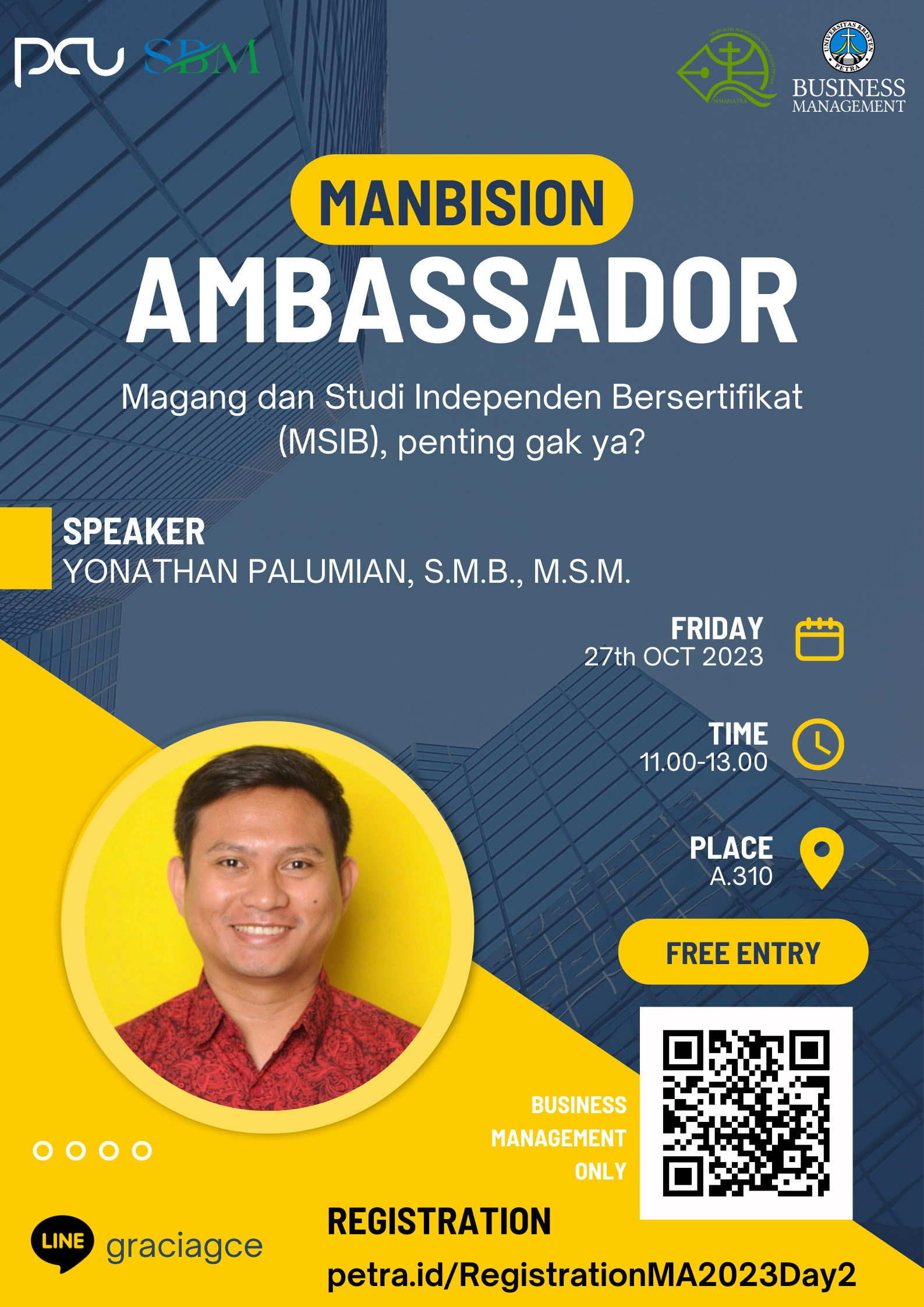 Magang dan Studi Independen Bersertifikat (MSIB), penting gak ya? Itulah topik bahasan yang akan diangkat dalam acara Manbision Ambassador yang diadakan oleh Program Manajemen Bisnis UK Petra pada tanggal 27 Oktober 2023 jam 11.00 - 13.00 WIB bertempat di gedung A.310 UK Petra dengan narasumber Yonathan Palumian M.SM.