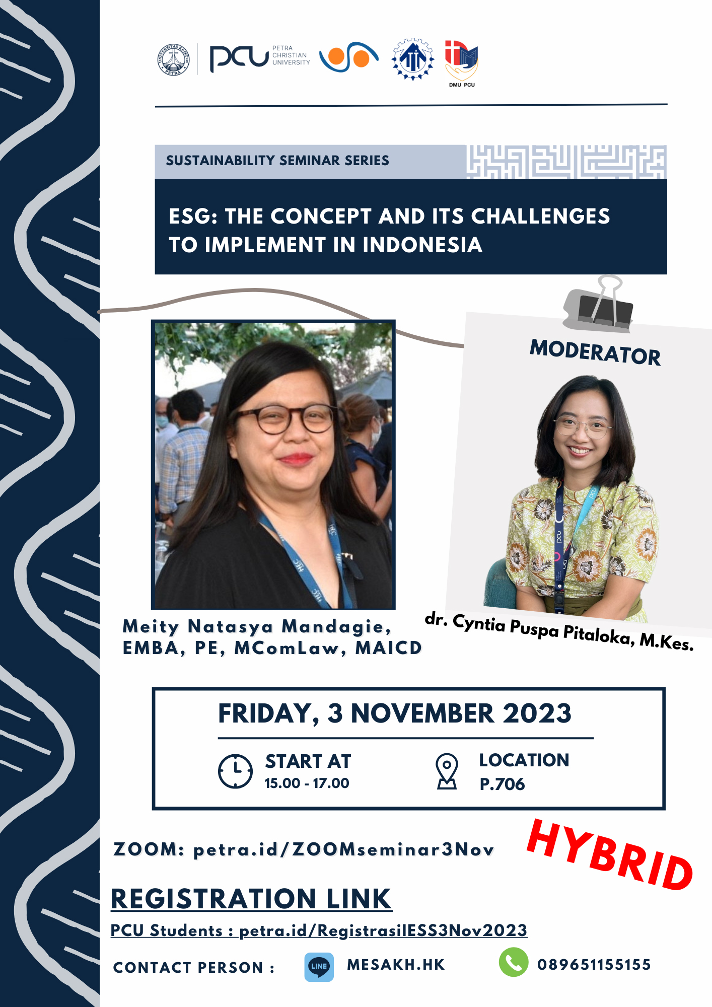 Fakultas Teknologi Industri dan Departemen Mata Kuliah Umum Universitas Kristen Petra Surabaya, pada tanggal 03 November 29023 mengadakan Sustainability seminar series: ESG the concept and its challenges to implement in Indonesia. Dengan narasumber Meity Natasya Mandagie dan sebagai moderator Cyntia Puspa Pitaloka.
