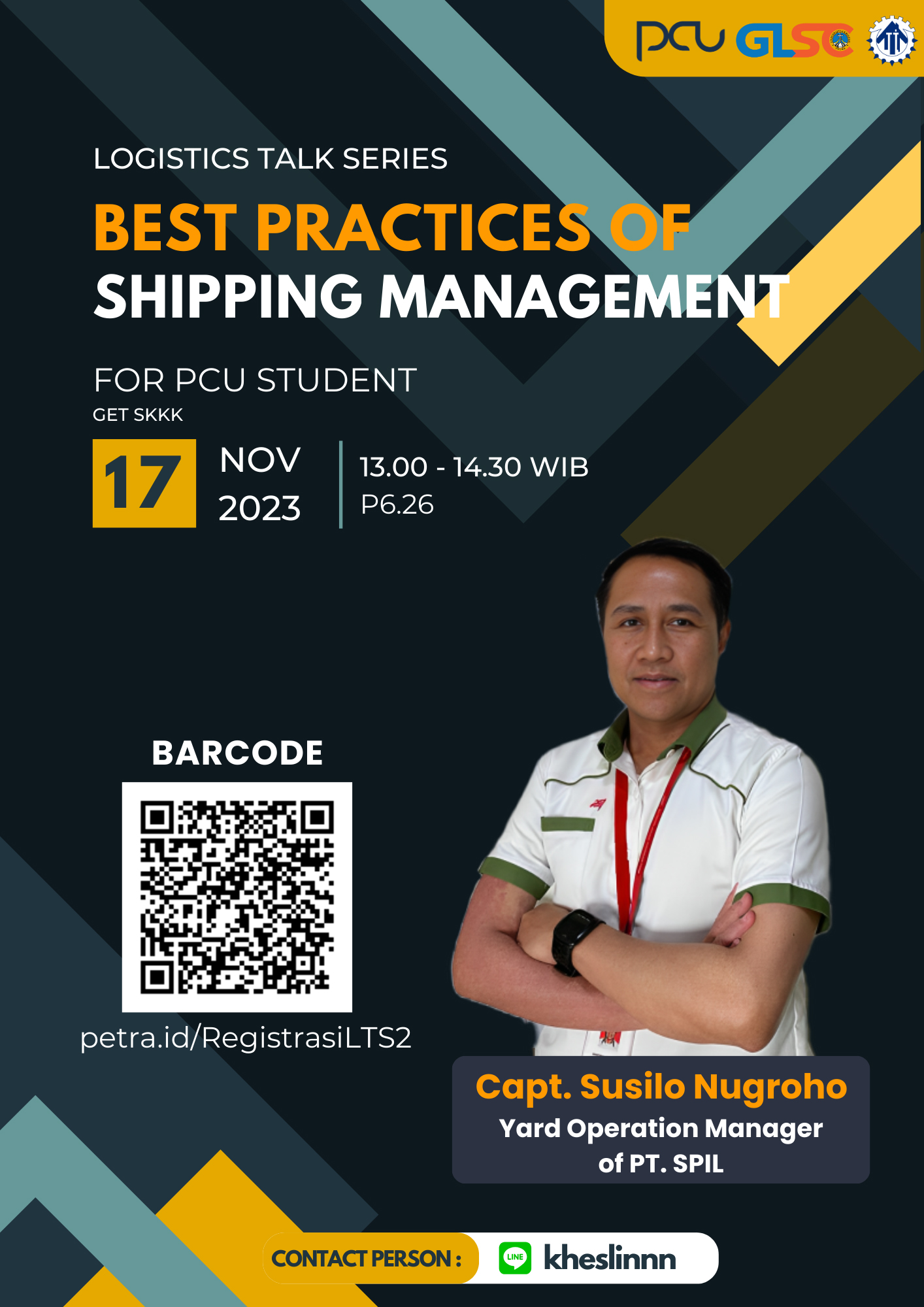 Logistics Talk Series:Best Practices of Shipping Management : kegiatan yang membahas mengenai alur pengiriman barang dari depo ke pelabuhan dan sebaliknya, serta implementasi continuous improvement pada Yard Operational dan dampaknya terhadap bisnis. Acara ini diselenggarakan pada 17 November 2023 jam 13.00 - 14.30 WIB dengan narasumber Capt. Susilo Nugroho.