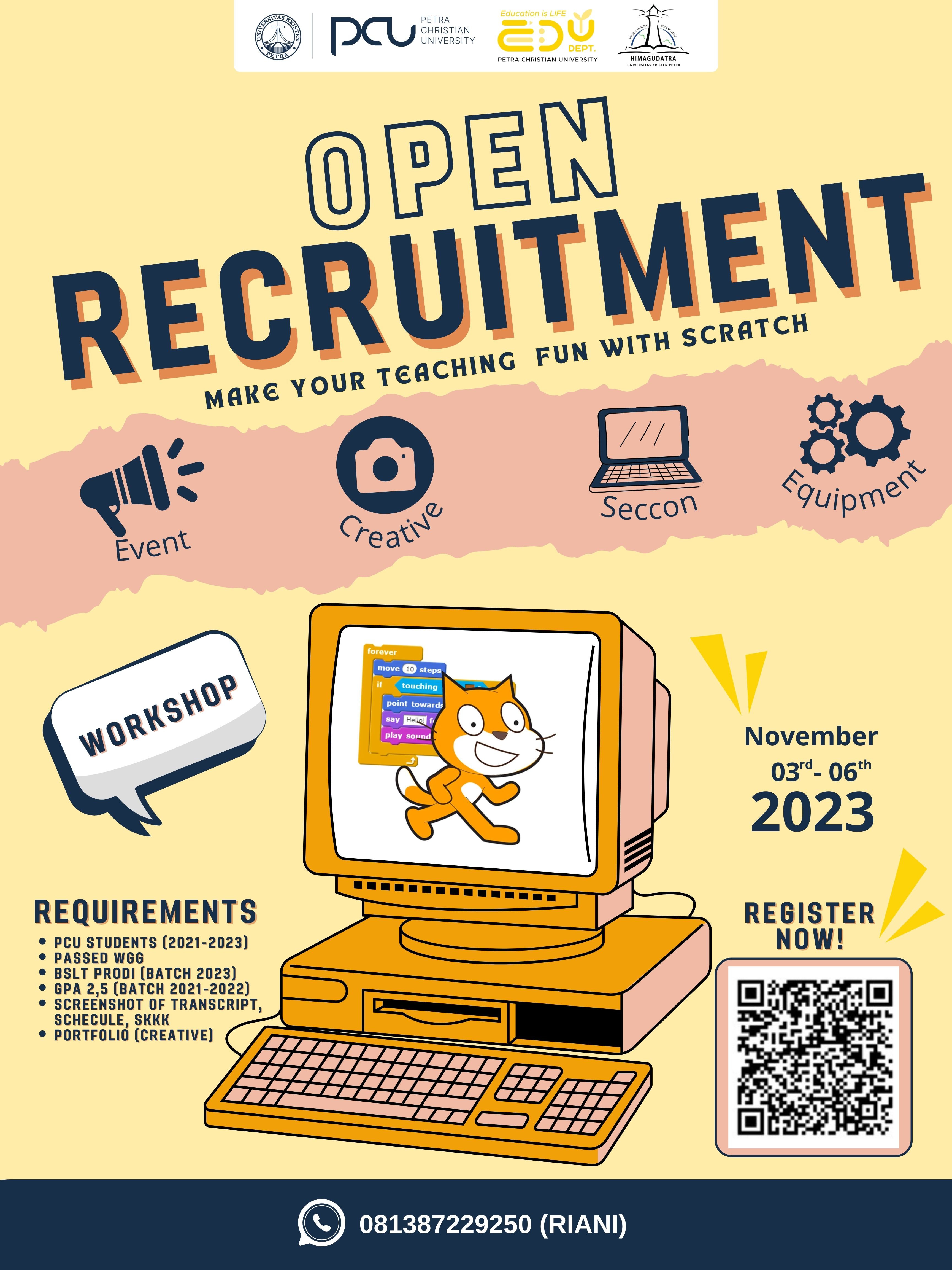 Workshop Scratch merupakan workshop yang diadakan oleh HIMAGUDATRA. Membuka rekrutmen panitia yang ingin melatih dan mengembang skill. Divisi yang dibuka adalah Acara, PDD, Sekkon dan Perkap. Pendaftaran dibuka dari tanggal 03-06 November 2023