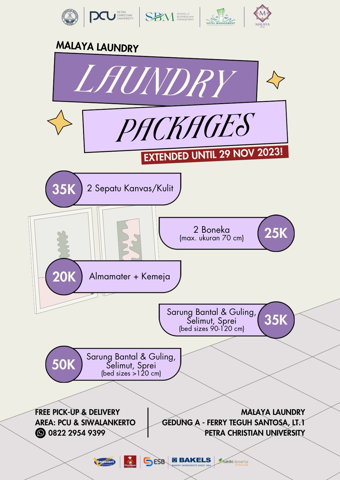 Our special laundry bundling packages are extended until 29th November 2023! Paket laundry dari Program Manajemen Perhotelan UK Petra.