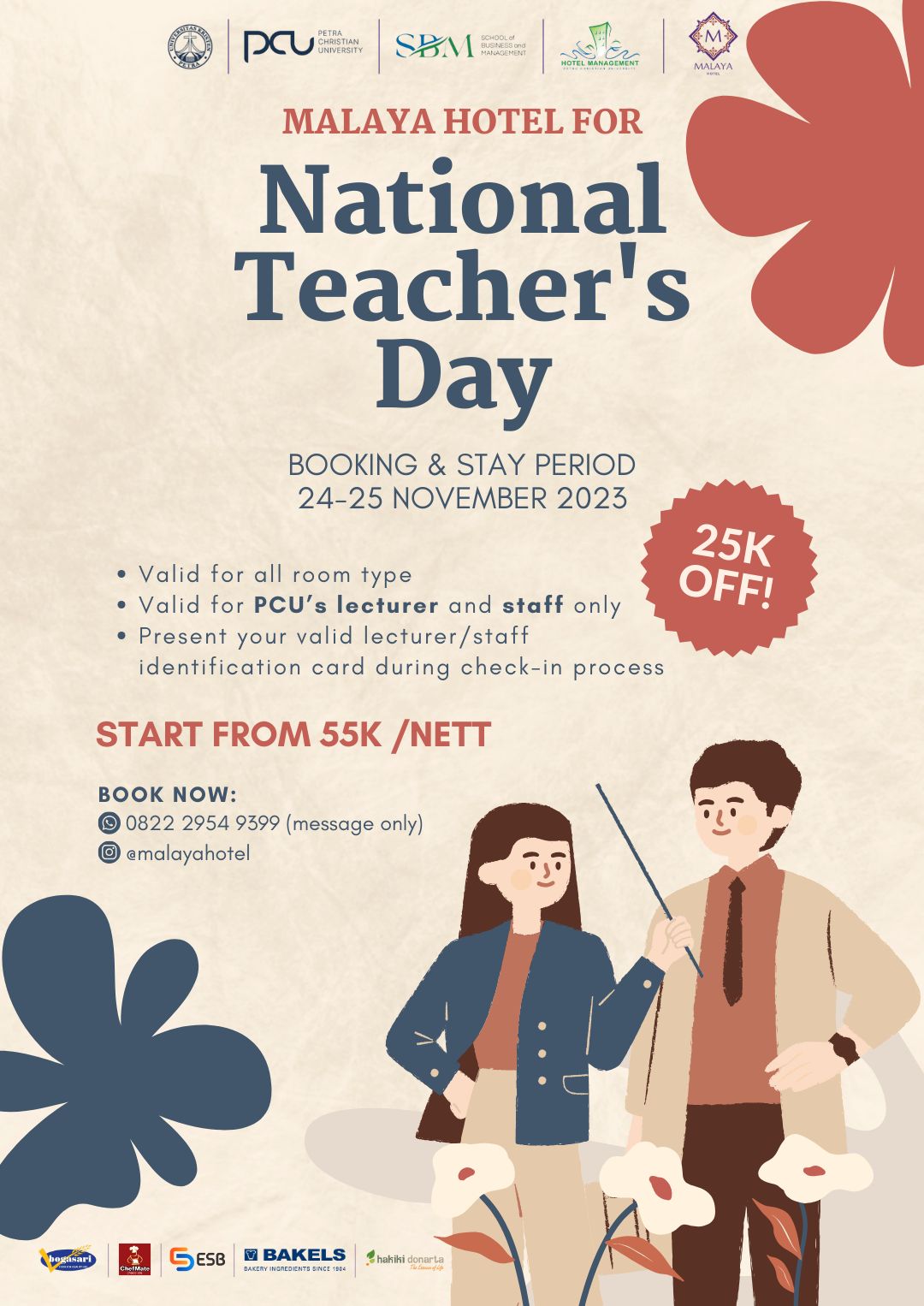 Dalam menyambut hari guru 2023, Malaya Hotel UK Petra memberikan discount khusus disaat menginap pada tanggal 24-25 November 2023.