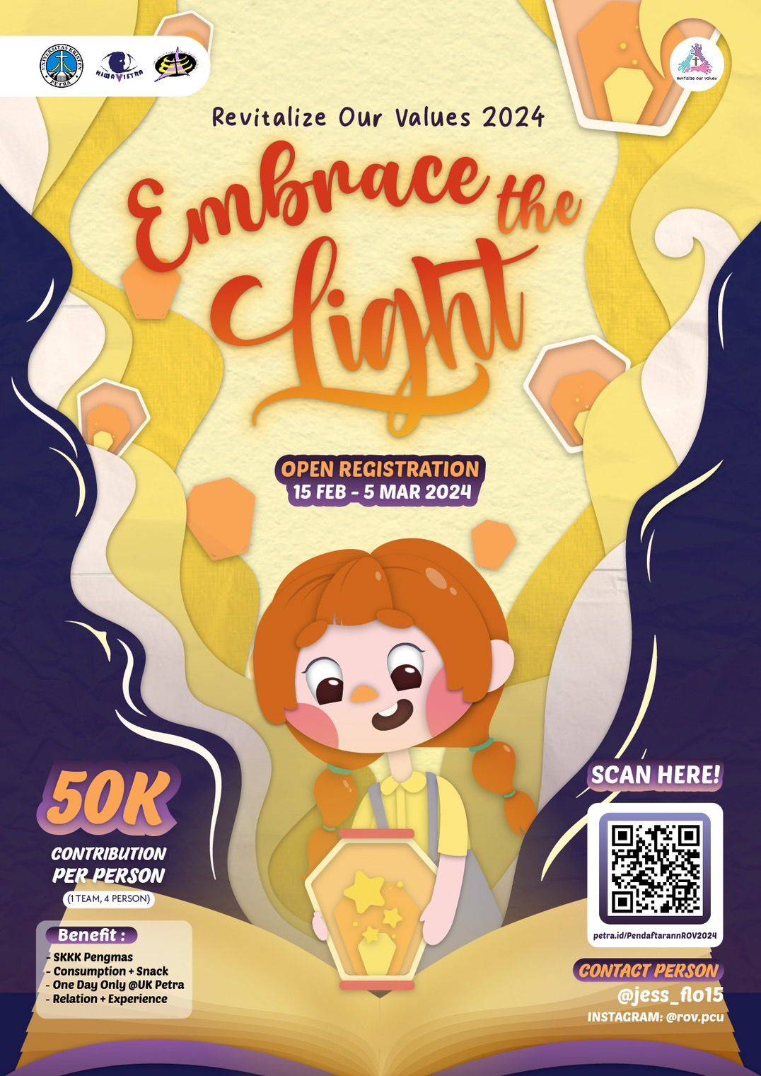 Tahun ini ROV mengangkat tema "Embrace The Light" dimana nantinya kita akan berpartisipasi untuk menyalurkan kreativitas sekaligus dapat menjadi berkat bagi anak-anak