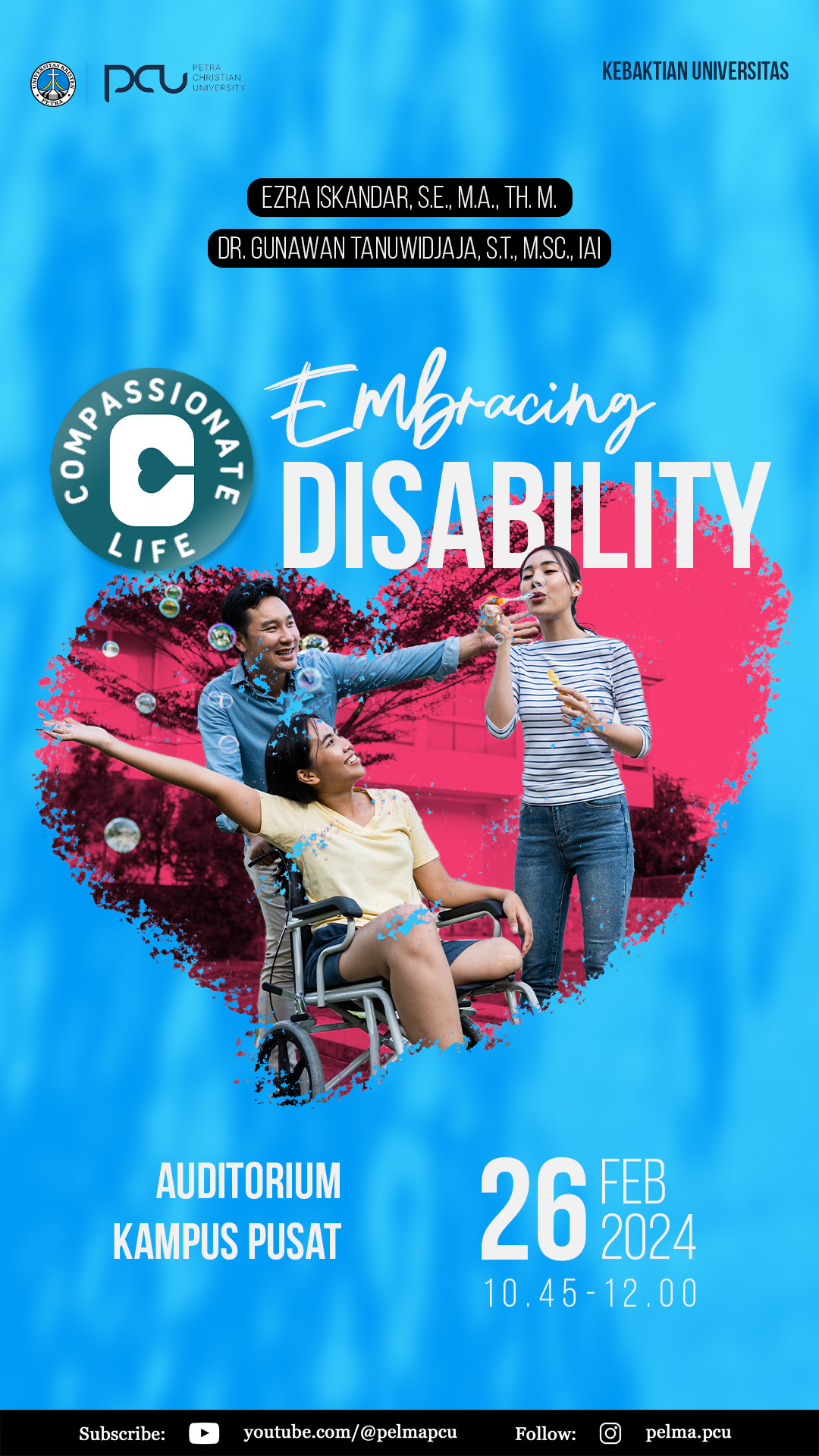 Kebaktian Universitas setiap Senin, kembali diadakan. Pada hari Senin, 26 Februari 2024 bertempat di Auditorium kampus Pusat dengan tema Kebaktian universitas: compassionate life: embracing disability. Dengan pembicara Ezra Iskandar, MA., Th.M. dan Dr. Gunawan Tanuwidjaya, M.Sc.