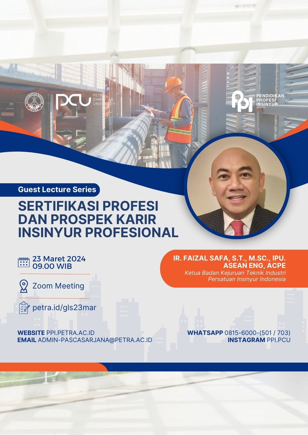 dengan narasumber Ir. Faizal Safa, S.T., M.Sc., IPU. ASEAN Eng, ACPE. Ketua Badan Kejuruan Teknik Industri - Persatuan Insinyur Indonesia, akan diselenggarakan oleh Pendidikan Profesi Insinyur UK Petra Surabaya pada: Sabtu, 23 Maret 2024 jam 09.00 WIB secara onlie melalui aplikasi Zoom Meeting