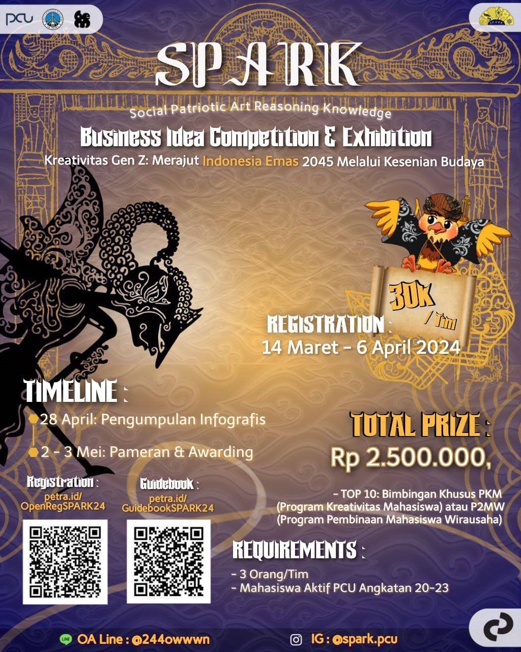 SPARK adalah lomba Business Idea Competition & Exhibition yang mengambil ide bisnis ekonomi kreatif. Indonesia kini mengalami digitalisasi yang makin berkembang dan kebudayaan Indonesia yang pudar, maka SPARK ingin membangun kesadaran kebudayaan dengan menggabungkan aspek ekonomi, mengingat bahwa pada tahun 2045, tepat 100 tahun kemerdekaan Indonesia akan mendapatkan bonus demografi yang berperan dalam visi Indonesia. Untuk pendaftaran lomba dibuka pada tanggal 14 Maret - 06 April 2024.