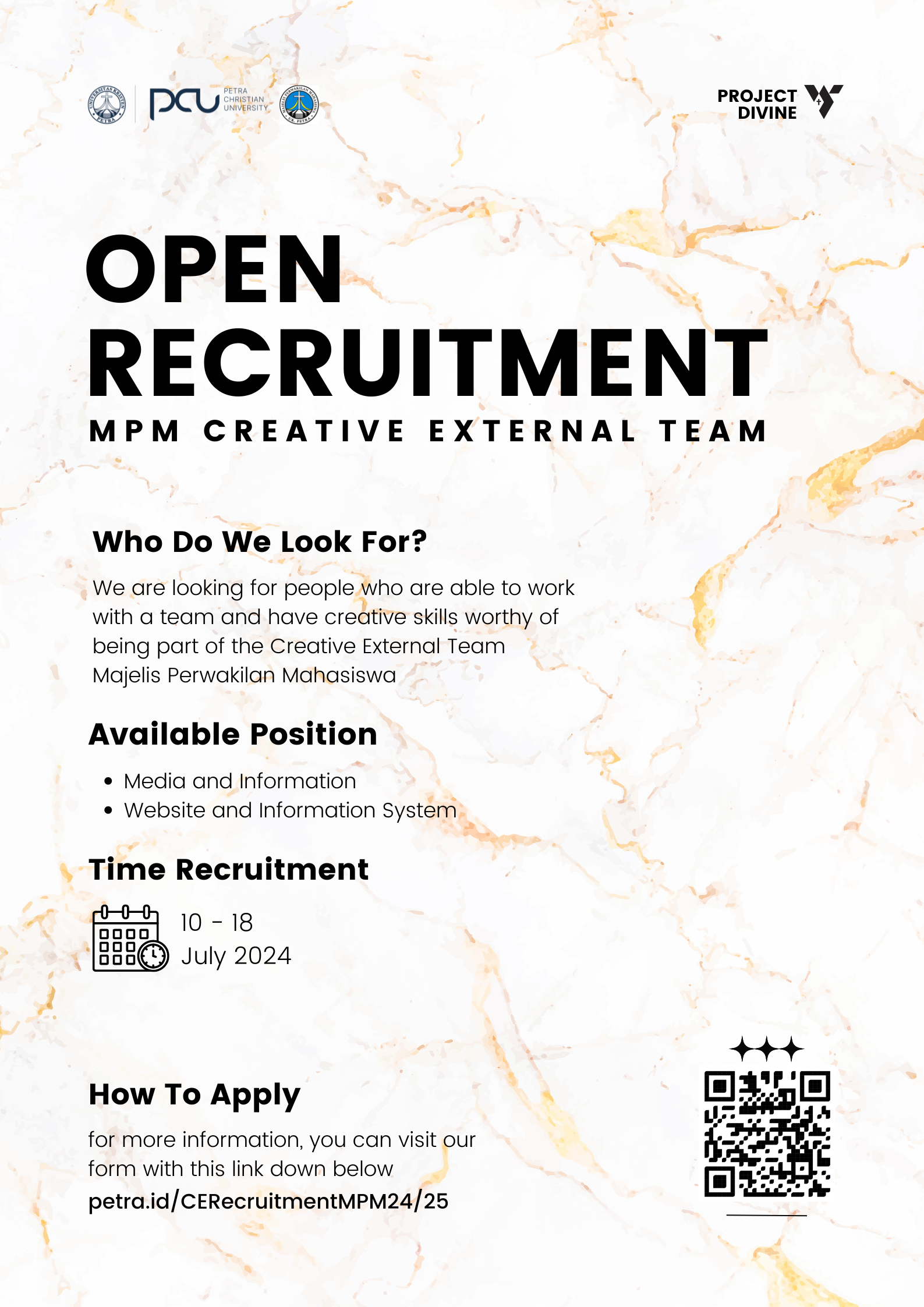 Majelis Perwakilan Mahasiswa UK Petra Surabaya membuka kesempatan bagi para mahasiswa UK Petra untuk bergabung dalam kepanitiaan di lingkup MPM. Pendaftaran dibuka pada tanggal 10-18 Juli 2024.