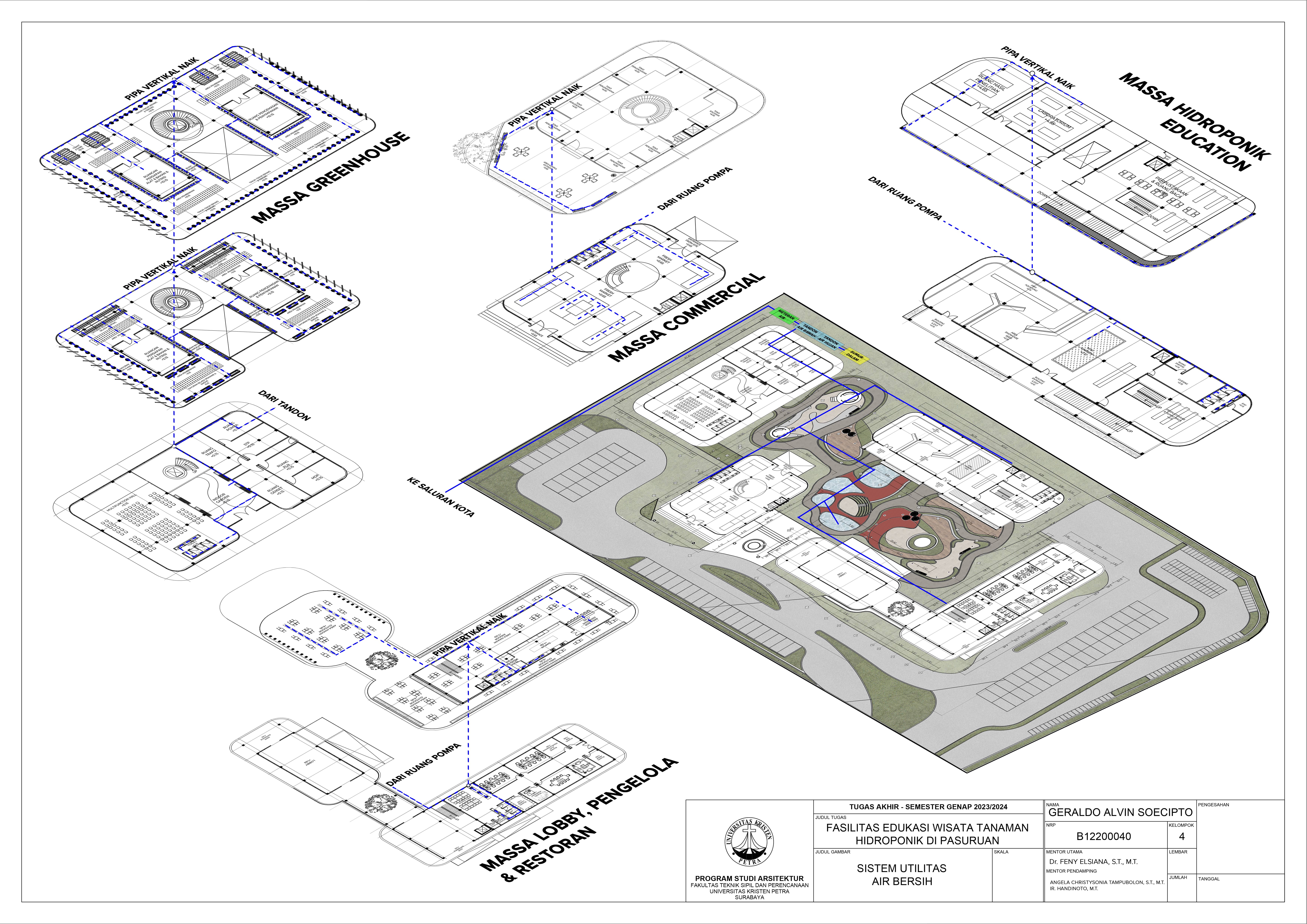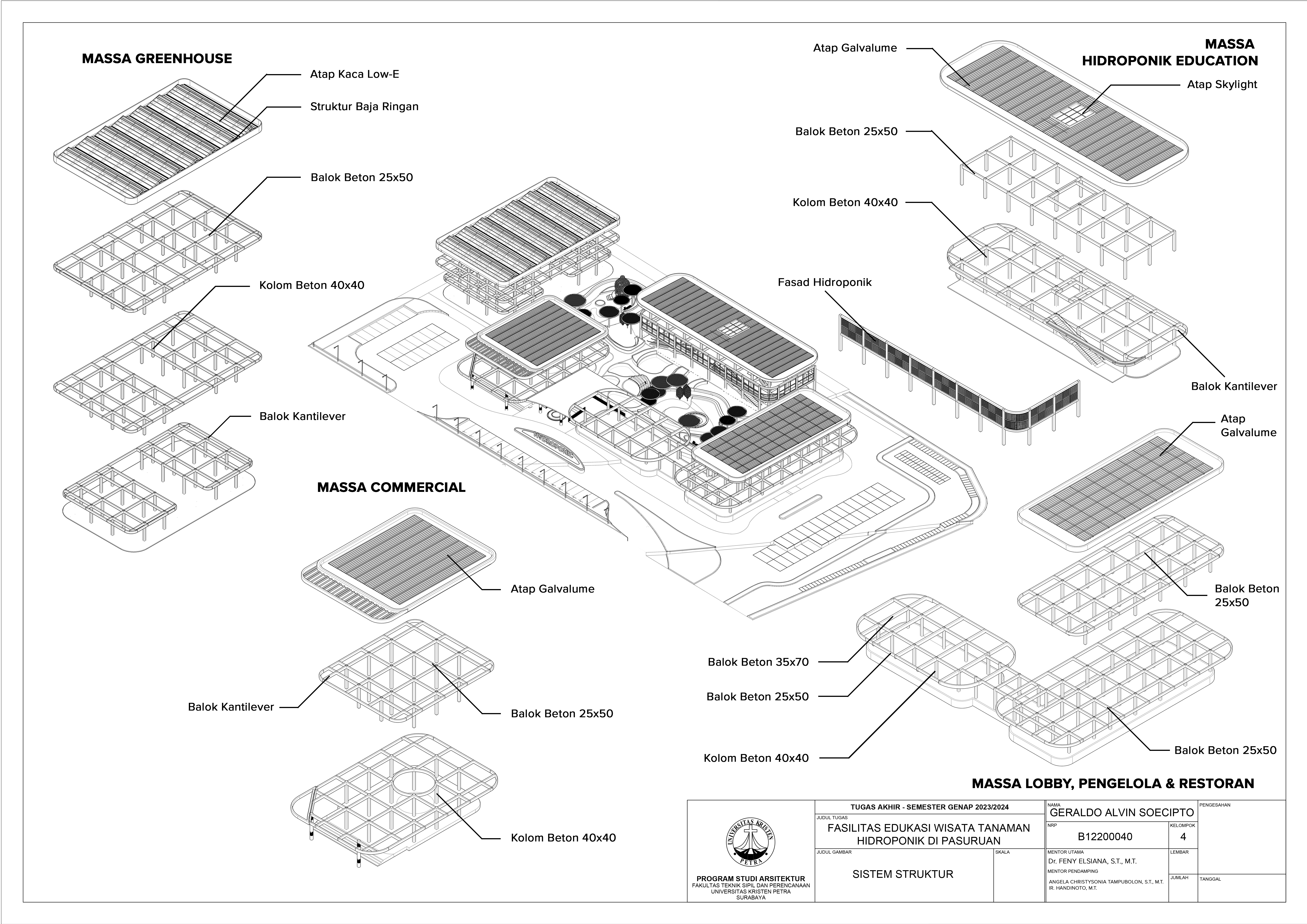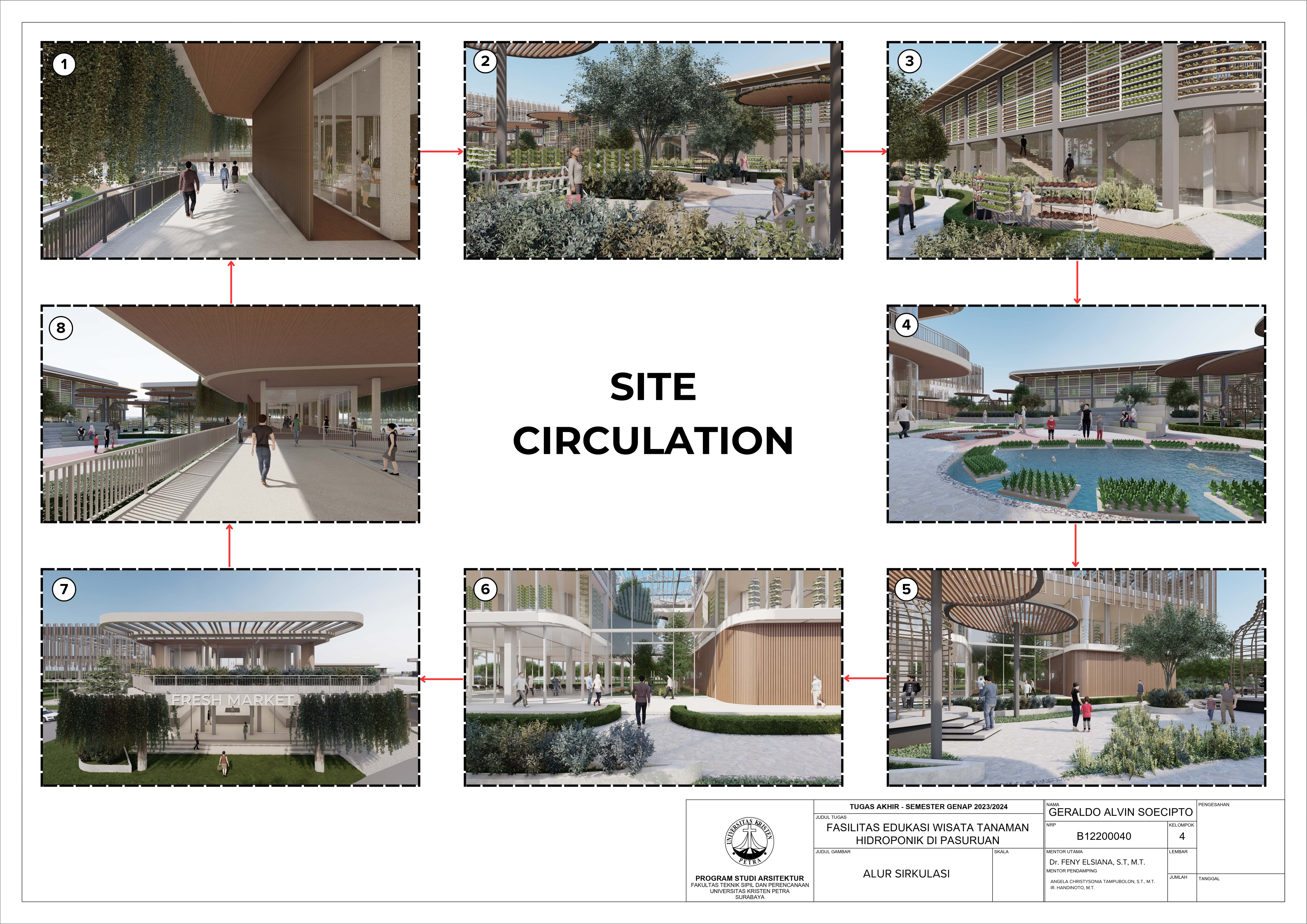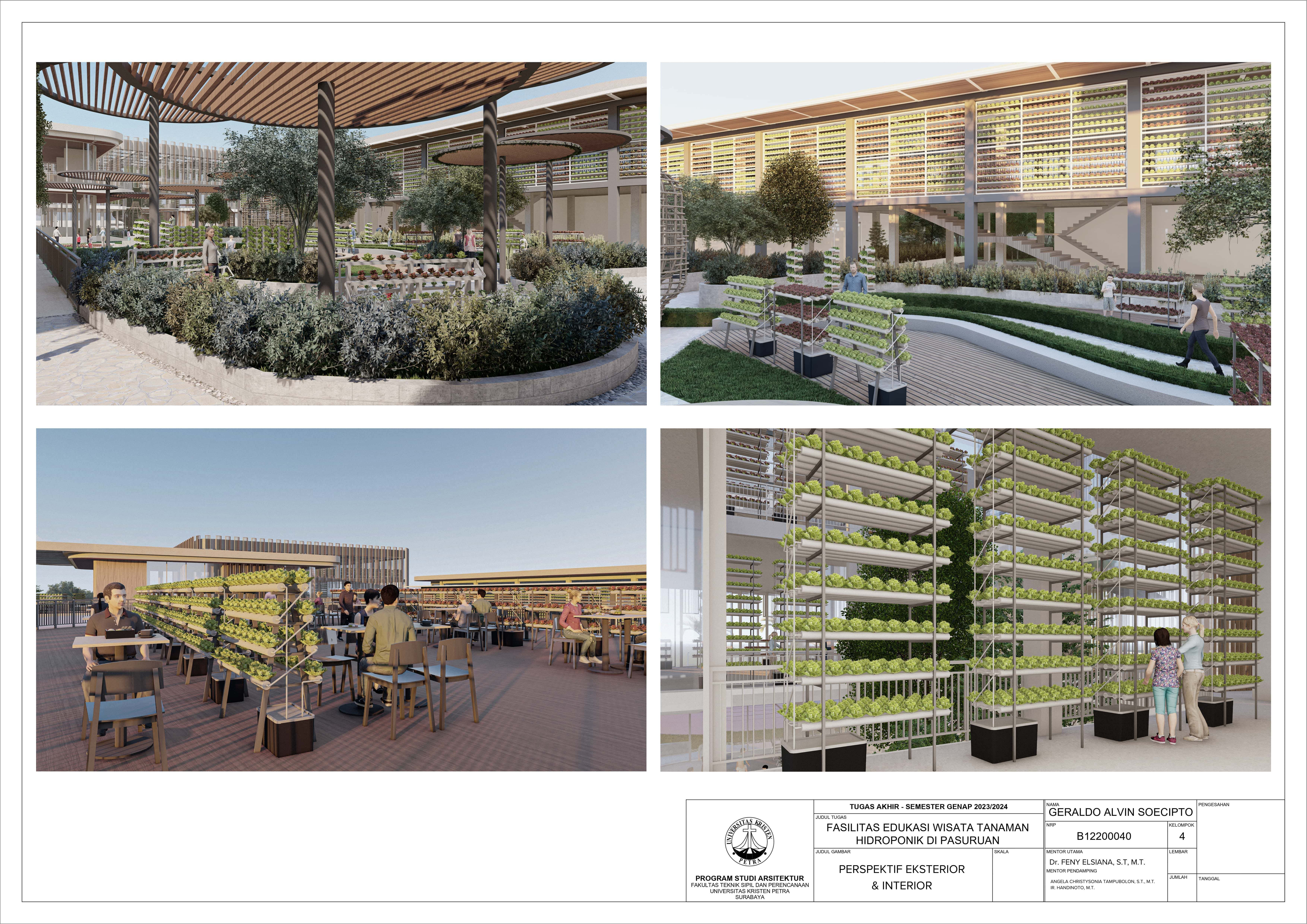 Ketahanan pangan menjadi suatu bencana yang mulai mengancam Indonesia. Hal ini dikarenakan oleh produksi bahan pangan yang rendah, tingginya alih fungsi lahan pertanian ke non-pertanian, dan pertumbuhan penduduk yang tinggi disertai dengan permintaan pangan yang terus meningkat tidak sesuai dengan produksinya. Melihat kondisi ini, budidaya tanaman hidroponik menjadi solusi yang tepat dalam mengatasi permasalahan ini karena dapat memaksimalkan lahan yang ada untuk memproduksi bahan makanan secara berkelanjutan. Namun, pengetahuan masyarakat tentang tanaman hidroponik masih tergolong rendah, sehingga dicetuskan rencana pembangunan fasilitas edukasi wisata tanaman hidroponik. Fasilitas ini memberikan edukasi yang disertai dengan praktek langsung mengenai budidaya tanaman hidroponik dan dapat menjadi destinasi wisata baru bagi masyarakat. Masyarakat akan diberikan edukasi mulai dari tahap pembenihan, pindah tanam, pemberian nutrisi, hingga panen dengan beberapa sistem hidroponik yang ada. Nantinya, fasilitas ini juga dapat meningkatkan minat masyarakat untuk berbudidaya tanaman hidroponik. Dari perencanaan desain, pendekatan yang digunakan adalah pendekatan sains menggunakan teori Arsitektur Bioklimatik. Tujuannya untuk menciptakan bangunan yang dapat beradaptasi dengan kondisi iklim dan lingkungan sehingga dapat memberikan kenyamanan bagi pengunjung. Pendekatan ini diterapkan pada elemen fasad, material, dan atap bangunan. Selain itu, pengaturan elemen alami seperti cahaya matahari, udara, pergerakan angin, dan vegetasi juga diperhatikan agar dapat mengoptimalkan pertumbuhan tanaman hidroponik.