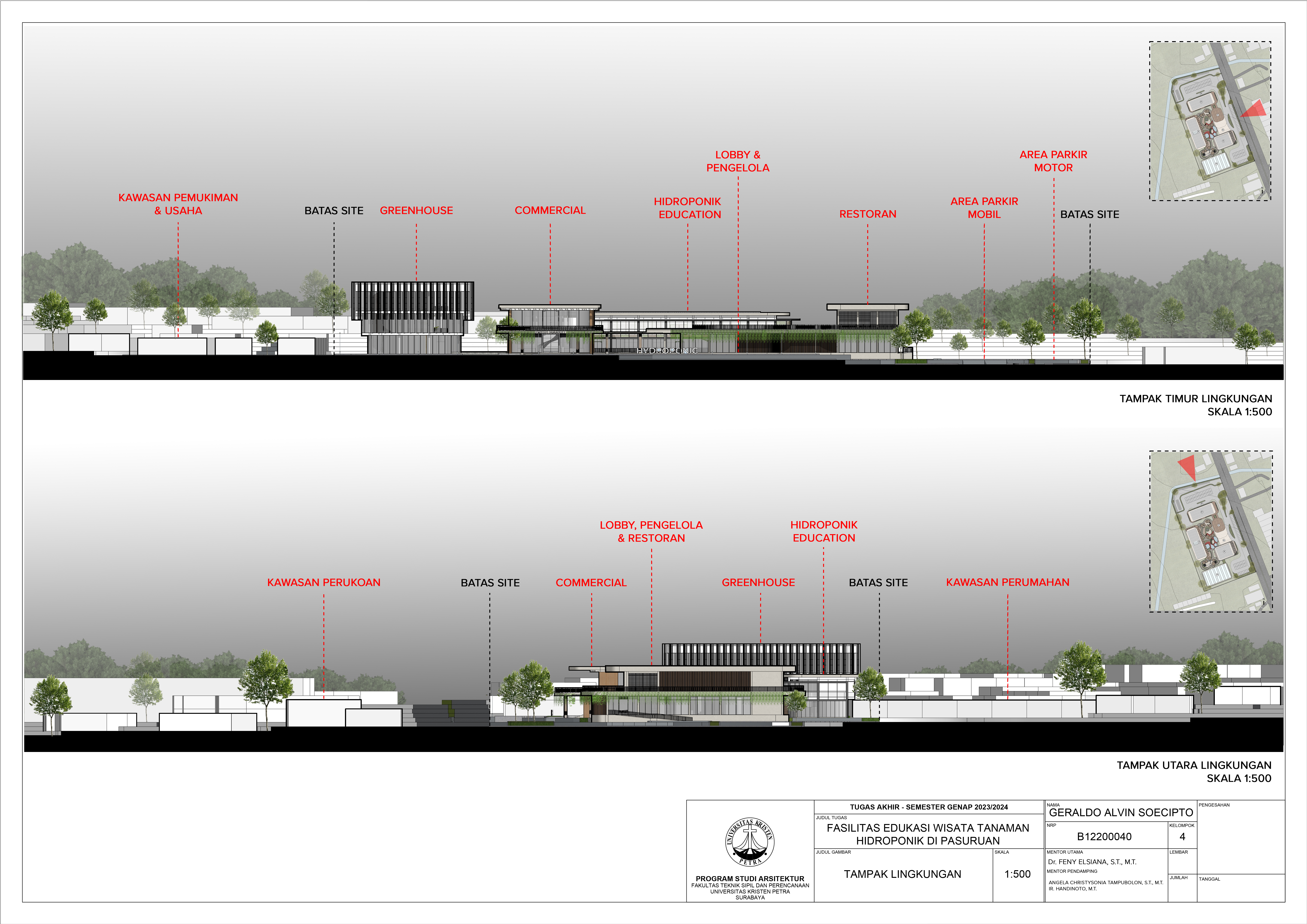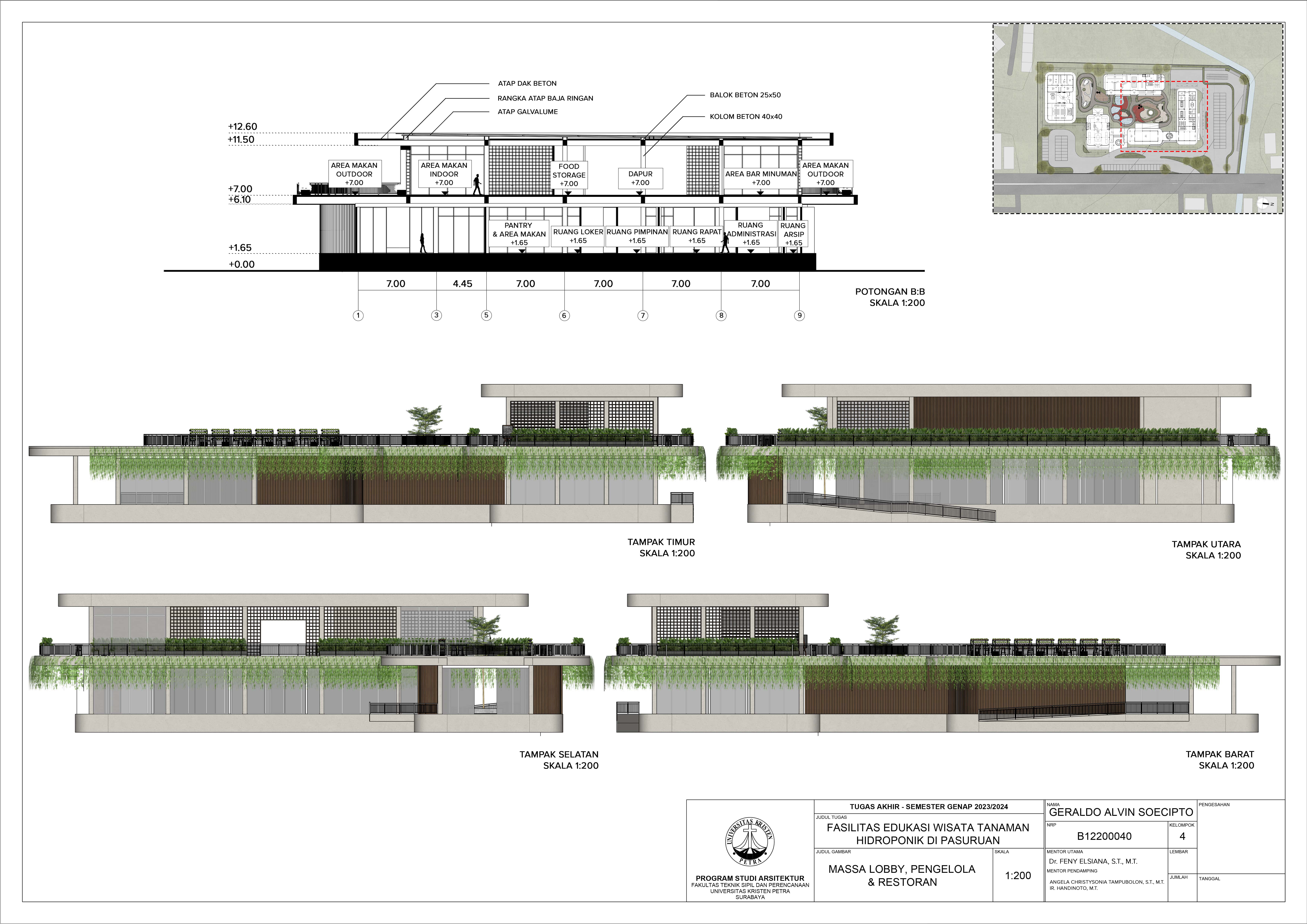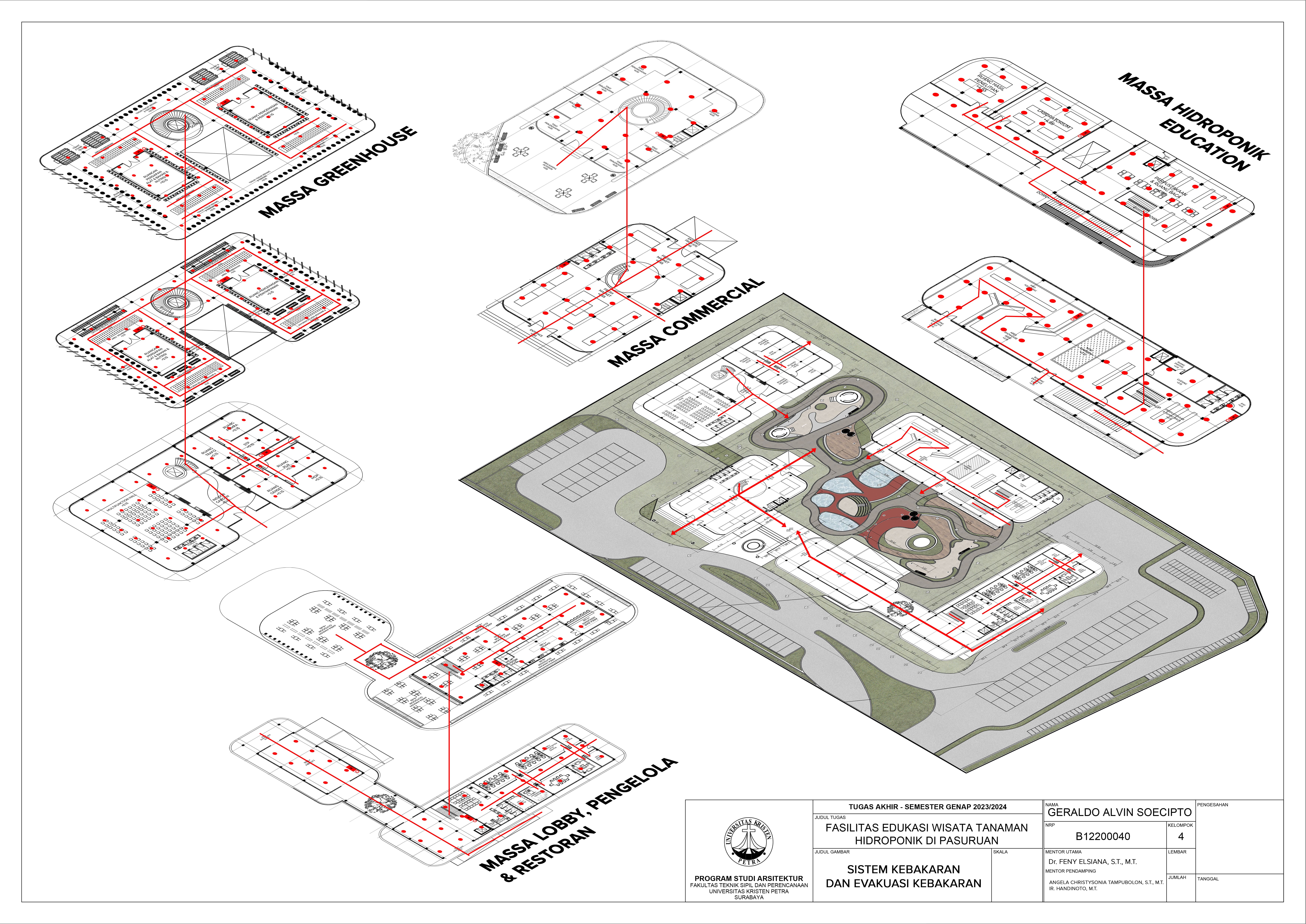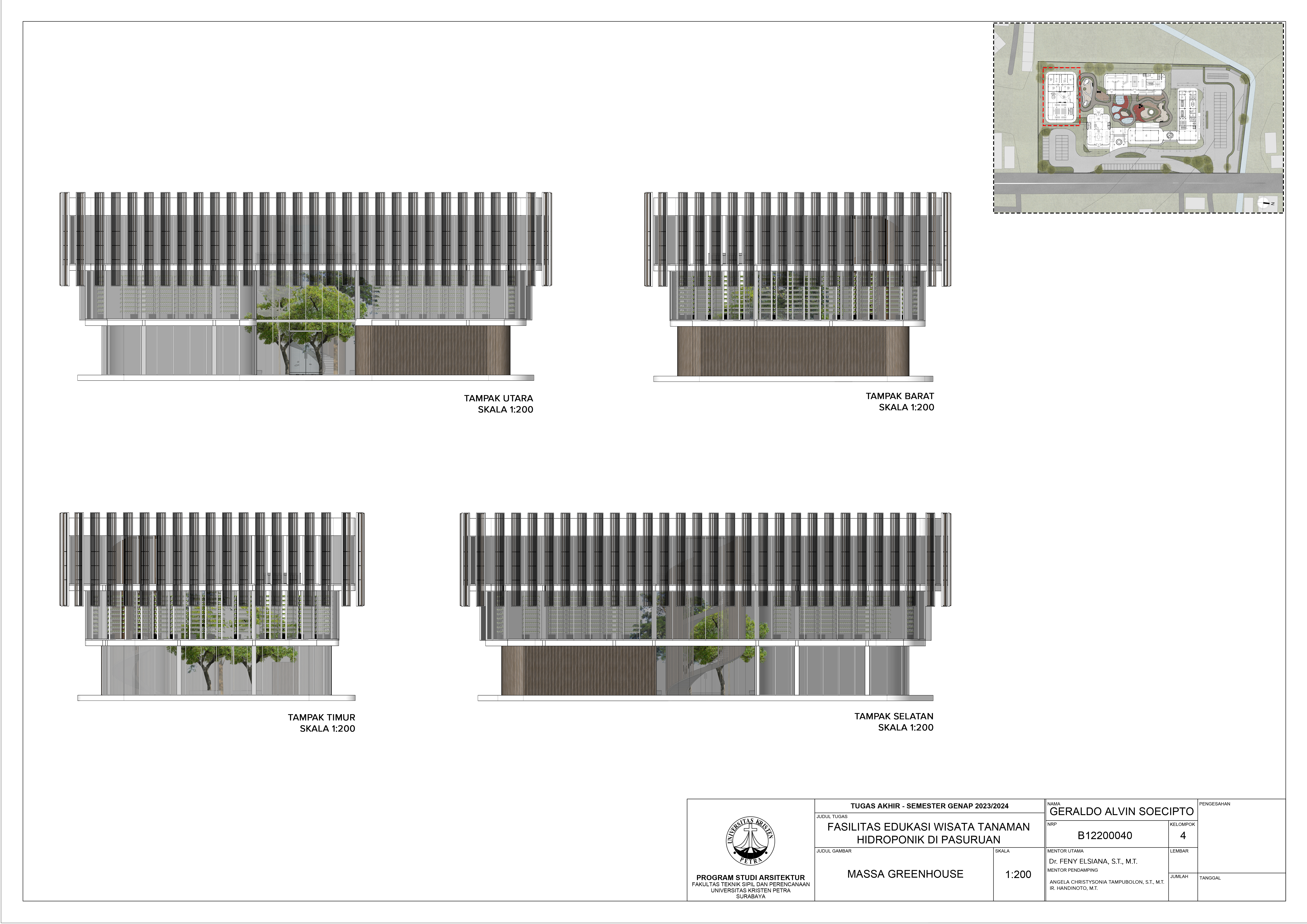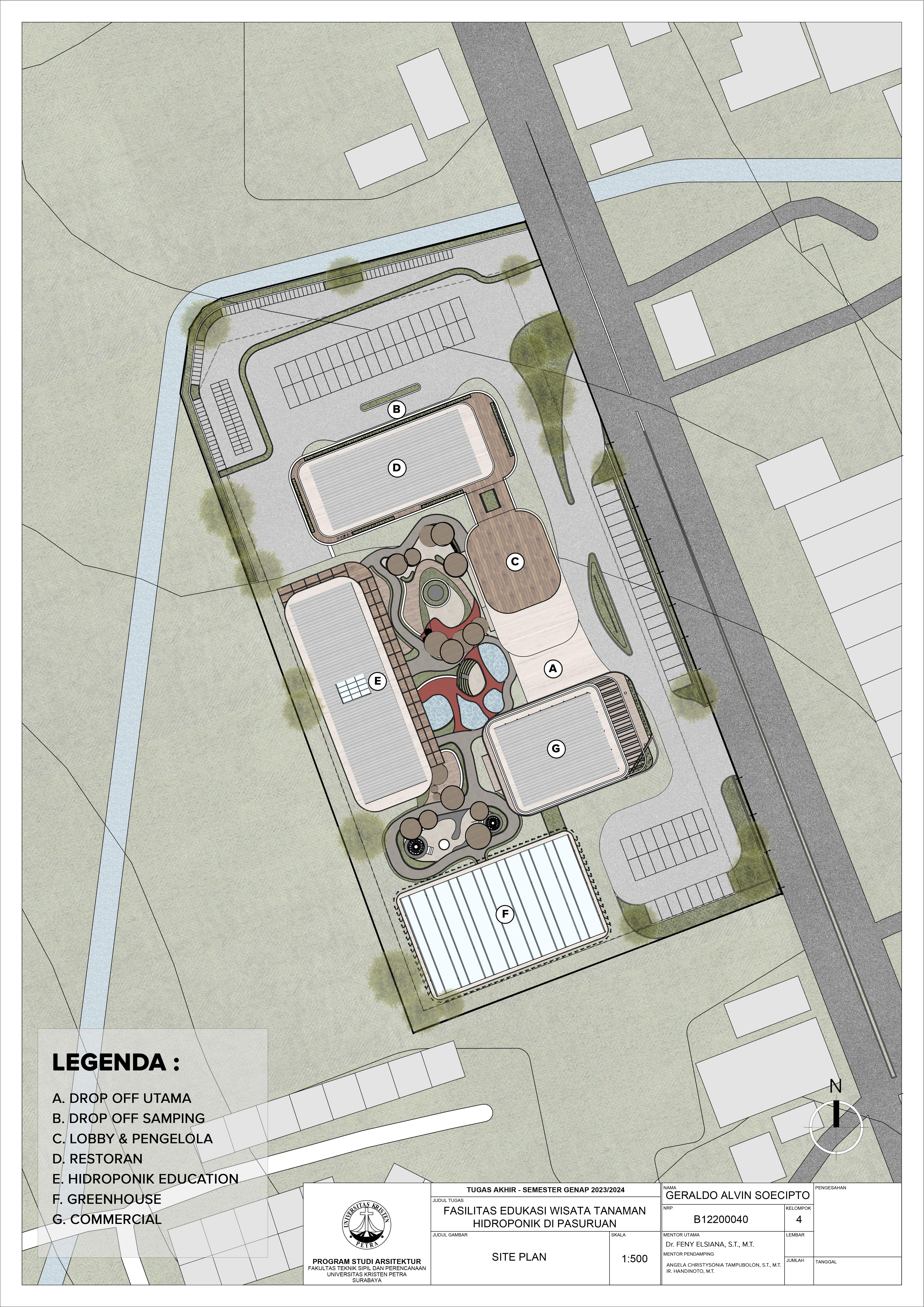 Ketahanan pangan menjadi suatu bencana yang mulai mengancam Indonesia. Hal ini dikarenakan oleh produksi bahan pangan yang rendah, tingginya alih fungsi lahan pertanian ke non-pertanian, dan pertumbuhan penduduk yang tinggi disertai dengan permintaan pangan yang terus meningkat tidak sesuai dengan produksinya. Melihat kondisi ini, budidaya tanaman hidroponik menjadi solusi yang tepat dalam mengatasi permasalahan ini karena dapat memaksimalkan lahan yang ada untuk memproduksi bahan makanan secara berkelanjutan. Namun, pengetahuan masyarakat tentang tanaman hidroponik masih tergolong rendah, sehingga dicetuskan rencana pembangunan fasilitas edukasi wisata tanaman hidroponik. Fasilitas ini memberikan edukasi yang disertai dengan praktek langsung mengenai budidaya tanaman hidroponik dan dapat menjadi destinasi wisata baru bagi masyarakat. Masyarakat akan diberikan edukasi mulai dari tahap pembenihan, pindah tanam, pemberian nutrisi, hingga panen dengan beberapa sistem hidroponik yang ada. Nantinya, fasilitas ini juga dapat meningkatkan minat masyarakat untuk berbudidaya tanaman hidroponik. Dari perencanaan desain, pendekatan yang digunakan adalah pendekatan sains menggunakan teori Arsitektur Bioklimatik. Tujuannya untuk menciptakan bangunan yang dapat beradaptasi dengan kondisi iklim dan lingkungan sehingga dapat memberikan kenyamanan bagi pengunjung. Pendekatan ini diterapkan pada elemen fasad, material, dan atap bangunan. Selain itu, pengaturan elemen alami seperti cahaya matahari, udara, pergerakan angin, dan vegetasi juga diperhatikan agar dapat mengoptimalkan pertumbuhan tanaman hidroponik.