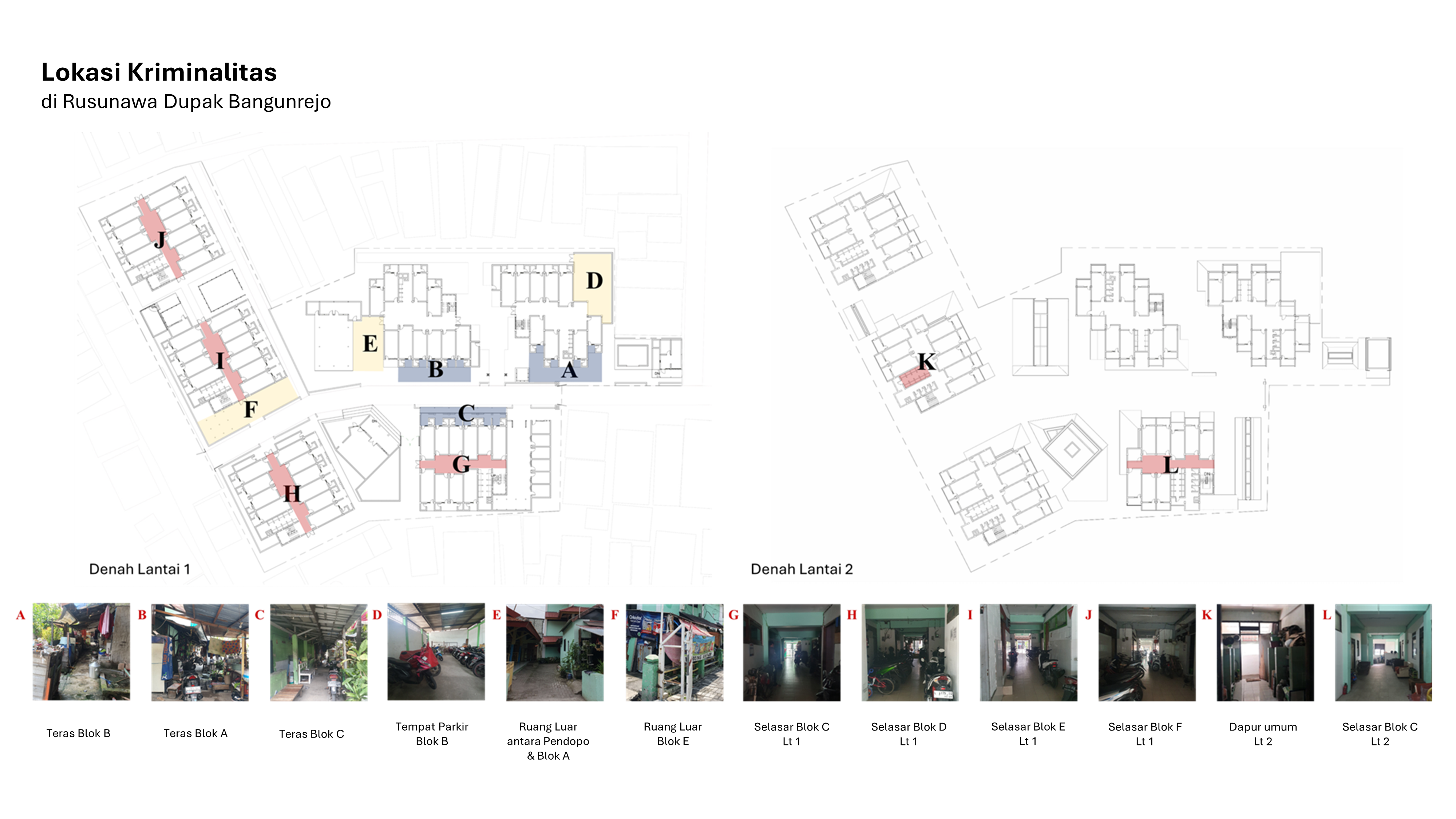 Banyaknya permasalahan mengenai isu kriminalitas di hunian, khususnya hunian bersama membuat hidup warganya menjadi kurang sejahtera. Di Surabaya, terdapat Rusunawa Dupak Bangunrejo yang memiliki kejahatan pencurian yang cukup sering berdasarkan dari data kepolisian setempat dan juga penelitian sebelumnya jika dibandingkan dengan rusunawa sejenis. Dalam mencegah terjadinya kejahatan yang ada di rusunawa, penelitian ini akan mencari hubungan antara penceahan kriminalitas dengan kualitas ruang di Rusunawa Dupak Bnagunrejo. Tujuannya adalah untuk memperoleh kualitas ruang yang berperan terhadap terjadinya kejahatan di Rusunawa Dupak Bangunrejo dan memberikan usulan desain yang dapat meningkatkan kualitas ruang rawan tersebut. Metode yang digunakan adalah metode deskriptif dengan bantuan studi kasus. Hasilnya menunjukkan bahwa adanya hubungan antara kualitas ruang dengan parameter pencegahan kriminalitas. Dalam konteksnya dalam Rusunawa Dupak Bangunrejo, di lokasi tersebut ditemukan adanya tiga ruang dari pengelompokan ruang terjadi kriminalitas yang elemen kualitas ruangnya tidak berperan terhadap pencegahan kriminalitas di lokasi. Ruang-ruang yang memiliki elemen kualitas ruang yang paling buruk terhadap pencegahan kriminalitas yang ada di Rusunawa Dupak Bangunrejo kemudian dibuat prototype dan saran desain berdasarkan elemen-elemen yang masih kurang untuk dapat ditingkatkan.