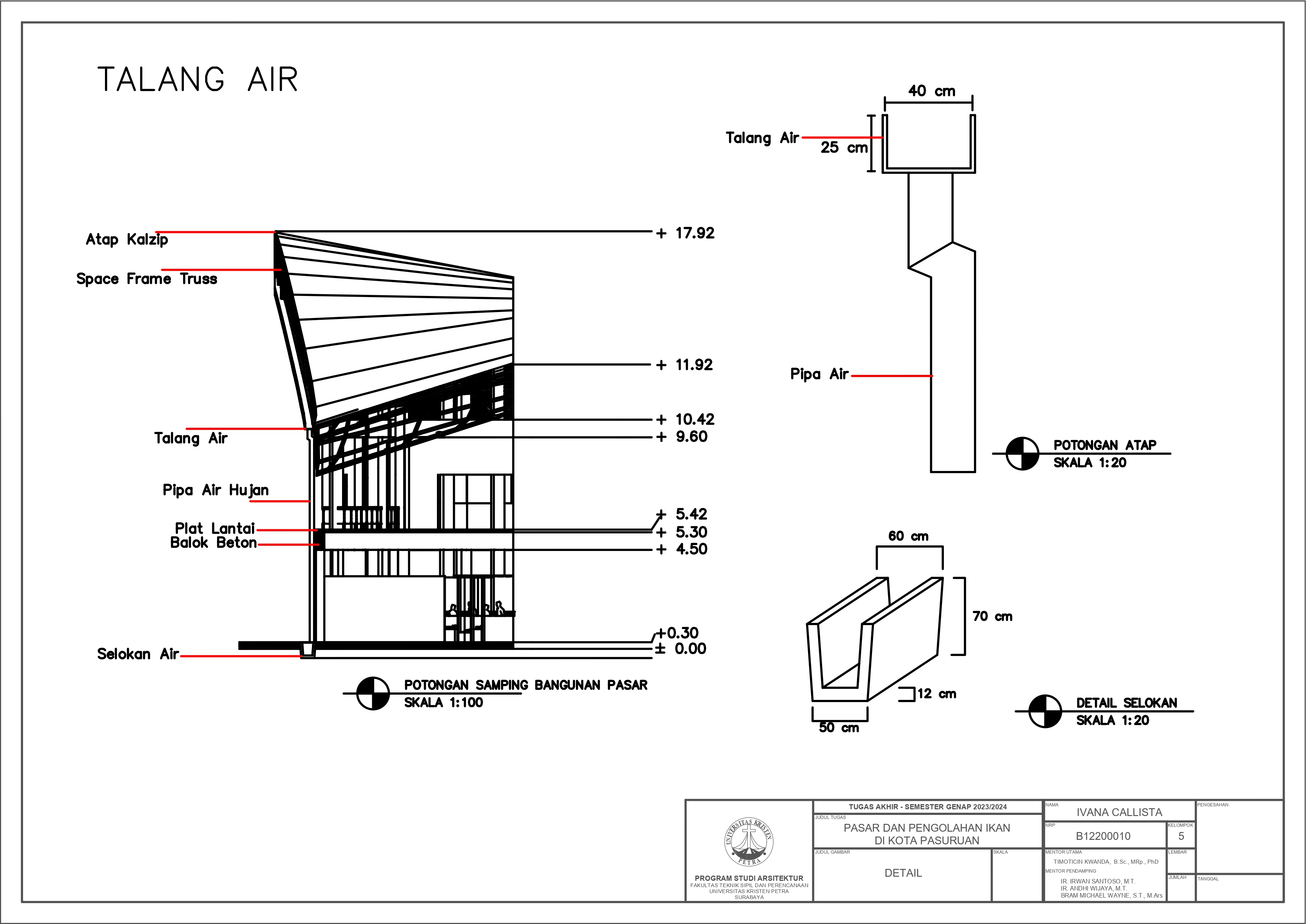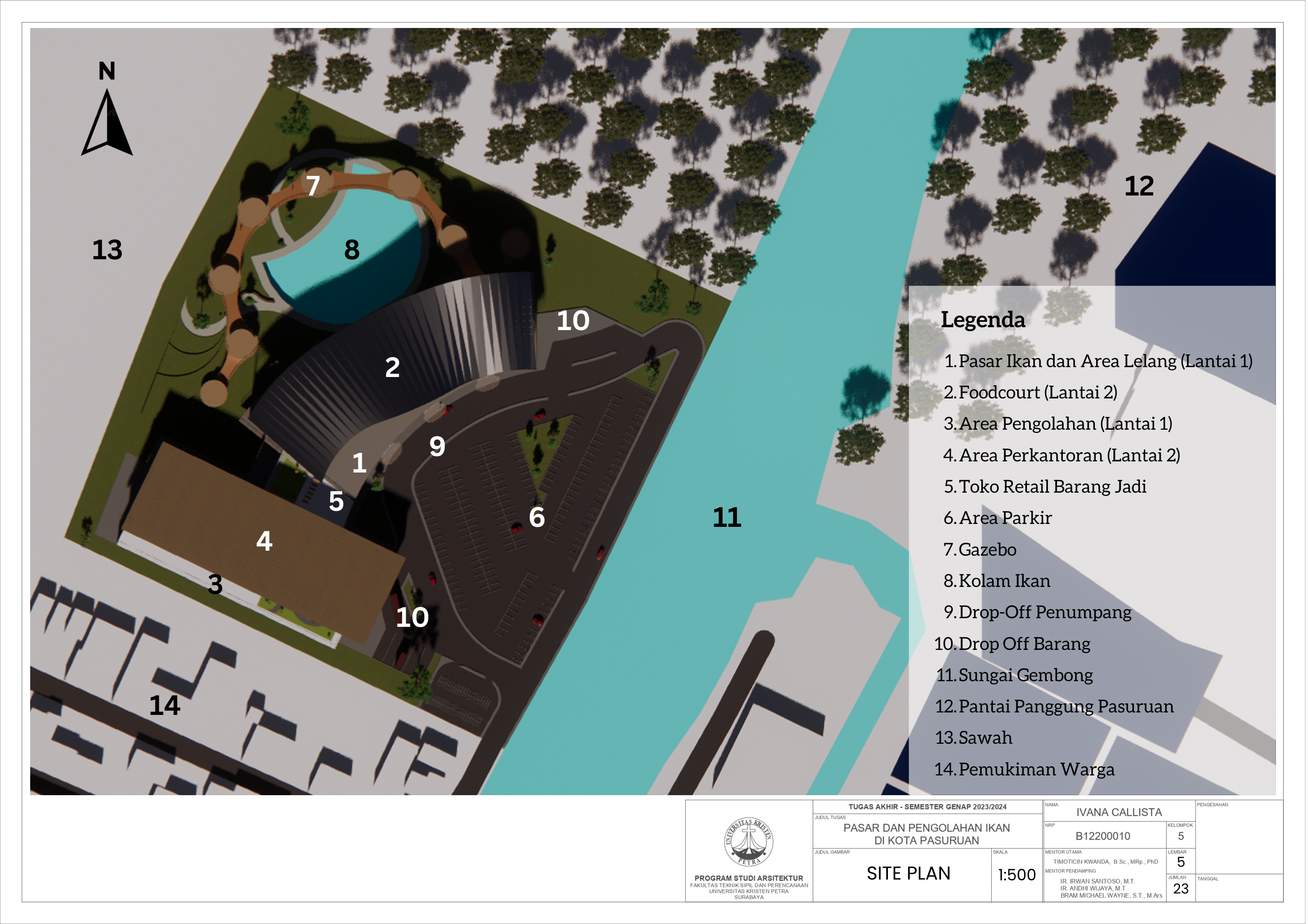 Kota Pasuruan adalah sebuah kota kecil yang terletak di Provinsi Jawa Timur. Karena lokasinya yang berada tepat di tepian laut, Kota Pasuruan cukup terkenal akan potensi dan komoditas laut dan perikanan. Namun, fasilitas eksisting sekarang tidak dapat mendukung tersebut untuk mencapai potensi maksimalnya; dapat dilihat dari pelabuhan perikanan yang kapasitasnya kurang untuk menampung hasil tangkapan rata-rata 7 ton per hari, dermaga dan area tautan perahu yang rusak dan sempit, dan tidak adanya pasar ikan atau di mana para masyarakat dapat membeli ikan. Perencanaan ini ditujukan untuk mengembangkan potensi perikanan kota Pasuruan serta memberikan lebih banyak lowongan pekerjaan untuk masyarakat sekitar. Fasilitas ini akan mempunyai dua fungsi utama, yang pertama adalah sebagai area lelang dan pasar ikan, kedua adalah gudang penyimpanan dan area pengolahan ikan, beserta beberapa fungsi penunjang seperti food court, area perkantoran, serta toko retail. Pendekatan yang diambil untuk menyelesaikan masalah tersebut adalah pendekatan sirkulasi dengan mengambil teori dari buku Francis DK Ching yaitu Pencapaian Sirkulasi, Pola Sirkulasi, dan Konfigurasi Jalur Sirkulasi. Dengan demikian, diharapkan perencanaan ini dapat membantu meningkatkan potensi perikanan di kota Pasuruan dengan mempermudah akses masyarakat menuju ikan segar serta hasil olahan ikan lainnya.
