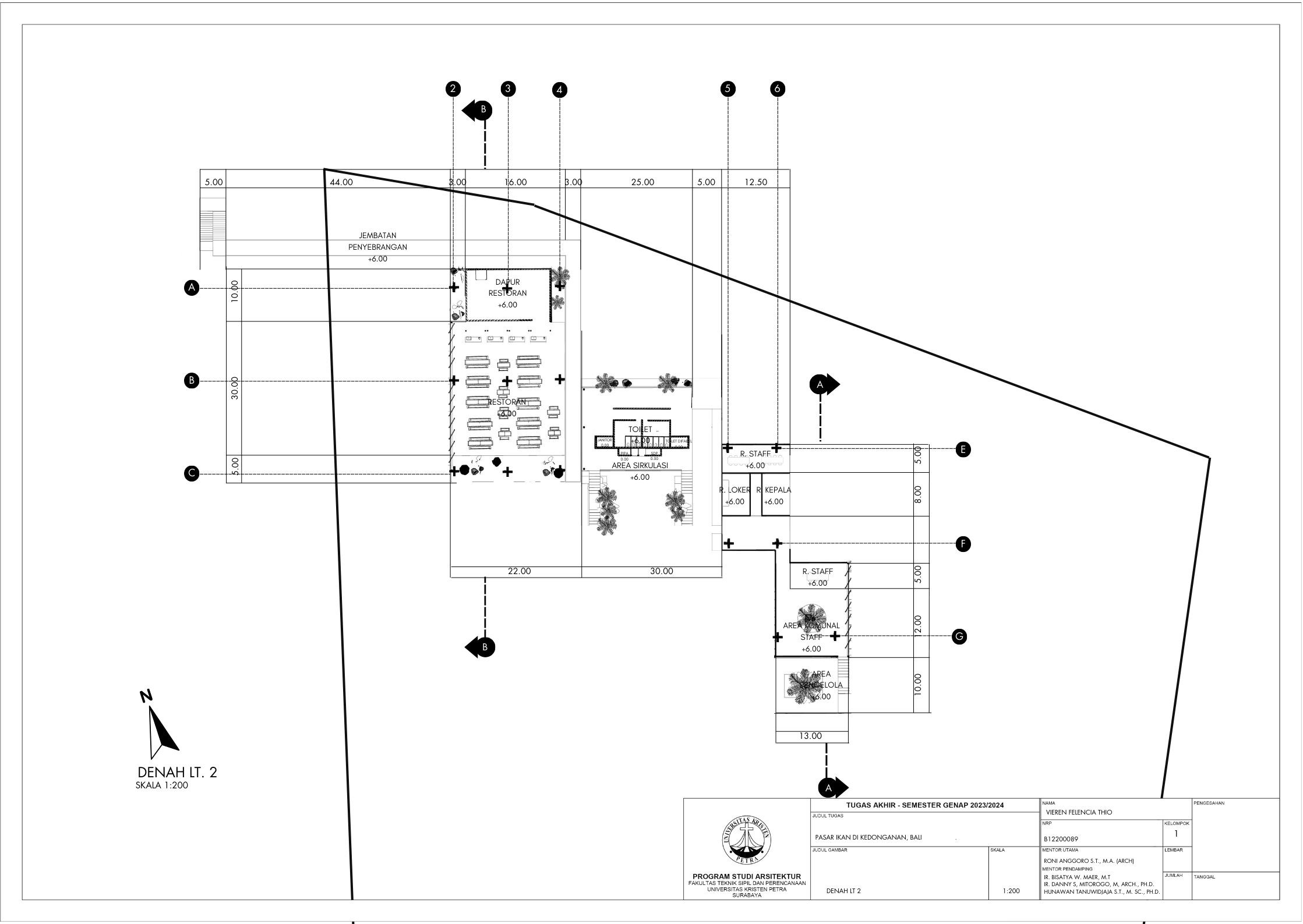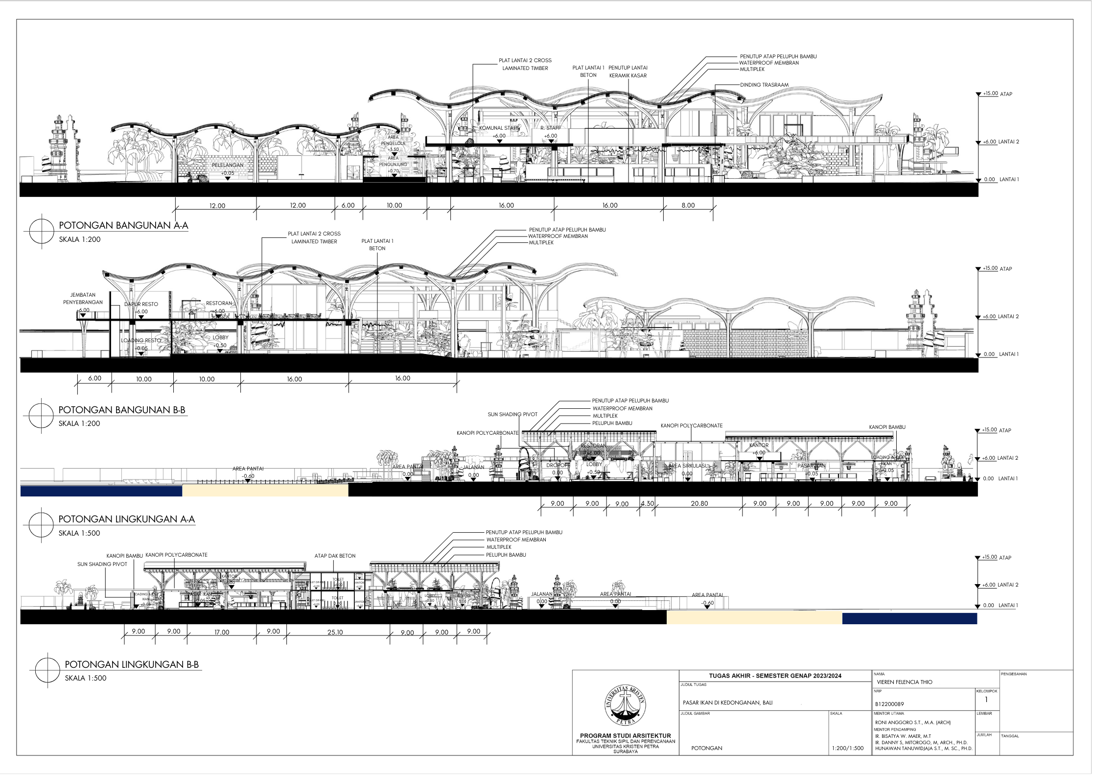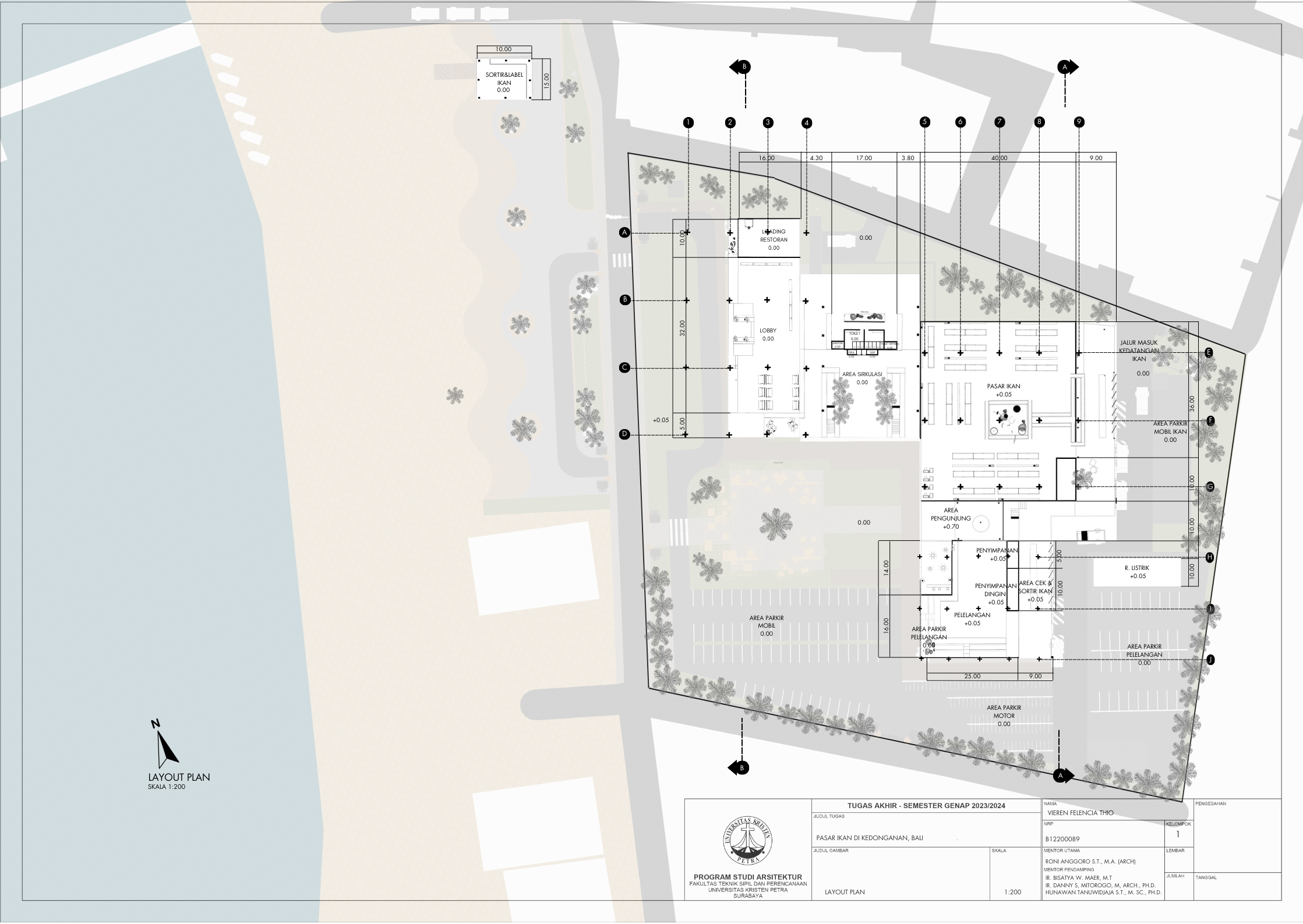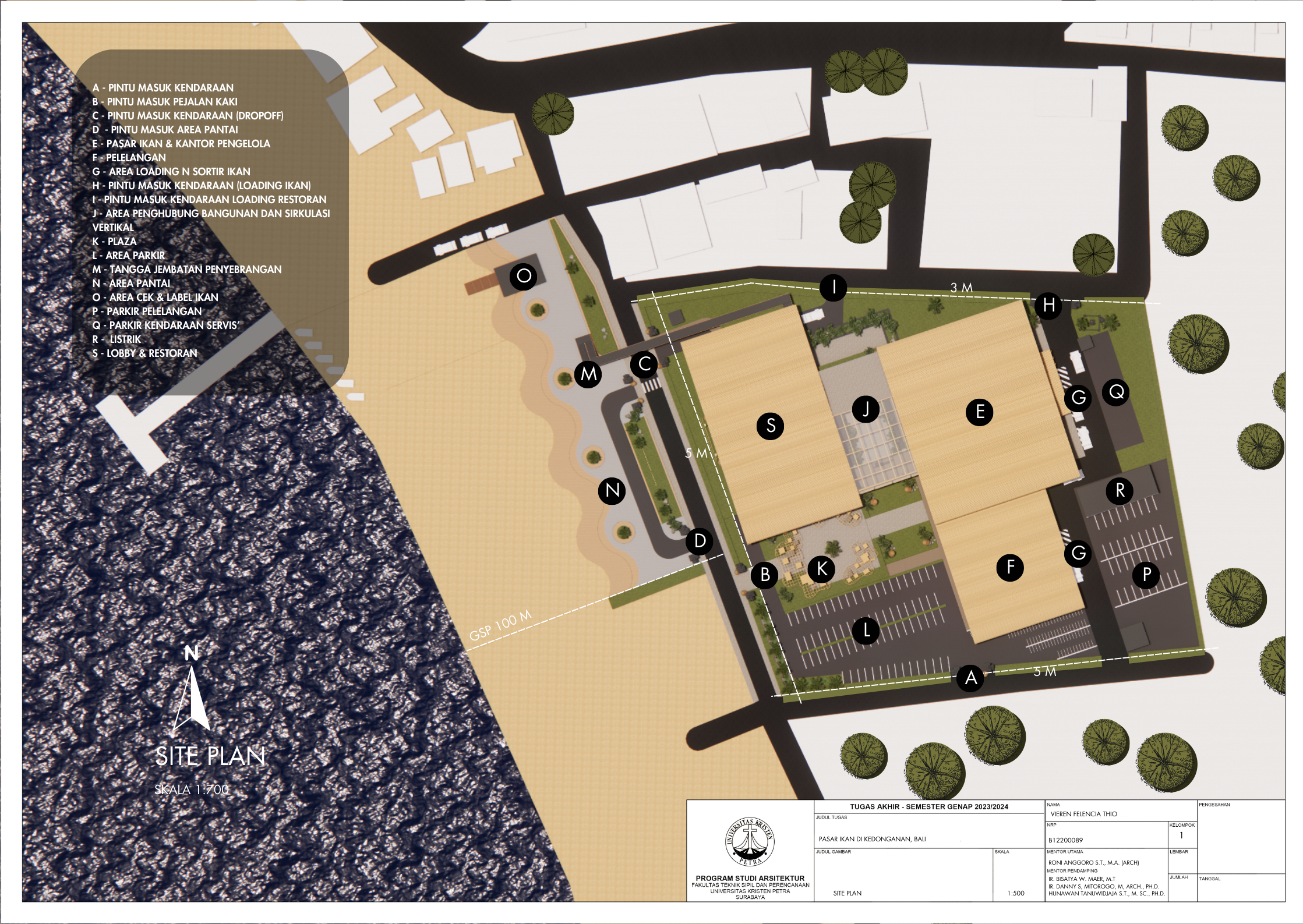 Pasar ikan Kedonganan merupakan salah satu pusat perolehan hasil panen laut oleh nelayan yang merupakan elemen penting bagi penyediaan pangan untuk masyarakat. Kedonganan terkenal dengan makanan lautnya dan merupakan salah satu pusat kuliner makanan laut terbesar di Bali. Kedonganan memegang peran penting bagi perekonomian pulau Bali. Banyak wisatawan lokal maupun asing mengunjungi pasar ikan di Kedonganan. Tetapi area tersebut merupakan pasar ikan yang tradisional dan tergolong kumuh, sehingga tempat tersebut kerap memiliki masalah dan tantangan terutama dalam segi fasilitasnya yang kurang memadai dan telah berusia lama terutama dari segi kenyamanan bangunan, pada sirkulasi, baik bangunan maupun penghawaannya. Mengingat fungsi utama adalah pasar, di mana akan terdapat pengunjung dalam jumlah banyak dalam suatu ruang. Masalah seperti aksesbilitas dan penataan massa yang buruk sangat memengaruhi kenyamanan. Karena itu, untuk mendukung dan mengembangkan area pasar ikan di Kedonganan, dilakukan perencanaan perancangan fasilitas pasar ikan yang lebih modern yang akan berdampak baik. Dengan perencanaan desain pendekatan sistem sirkulasi, fasilitas dirancang sesuai dengan kebutuhan berdasarkan analisa fungsi ruang, tapak, dan pengguna bangunan. Fasilitas akan mencakup pasar ikan itu sendiri, pasar pelelangan ikan, area sortir dan distribusi ikan, serta jasa memasak ikan dan restoran.