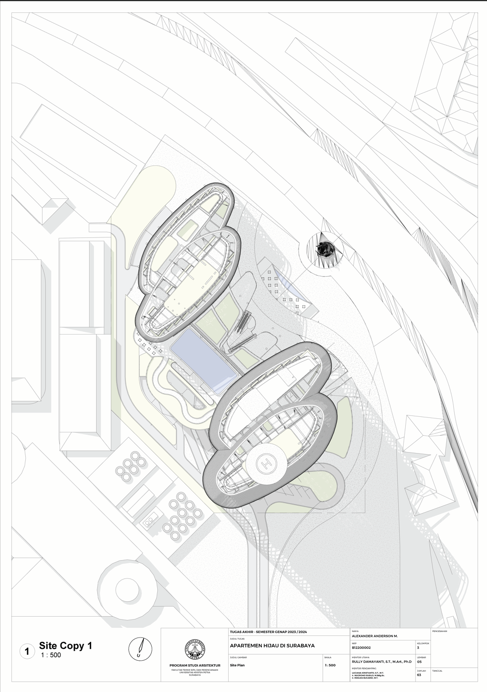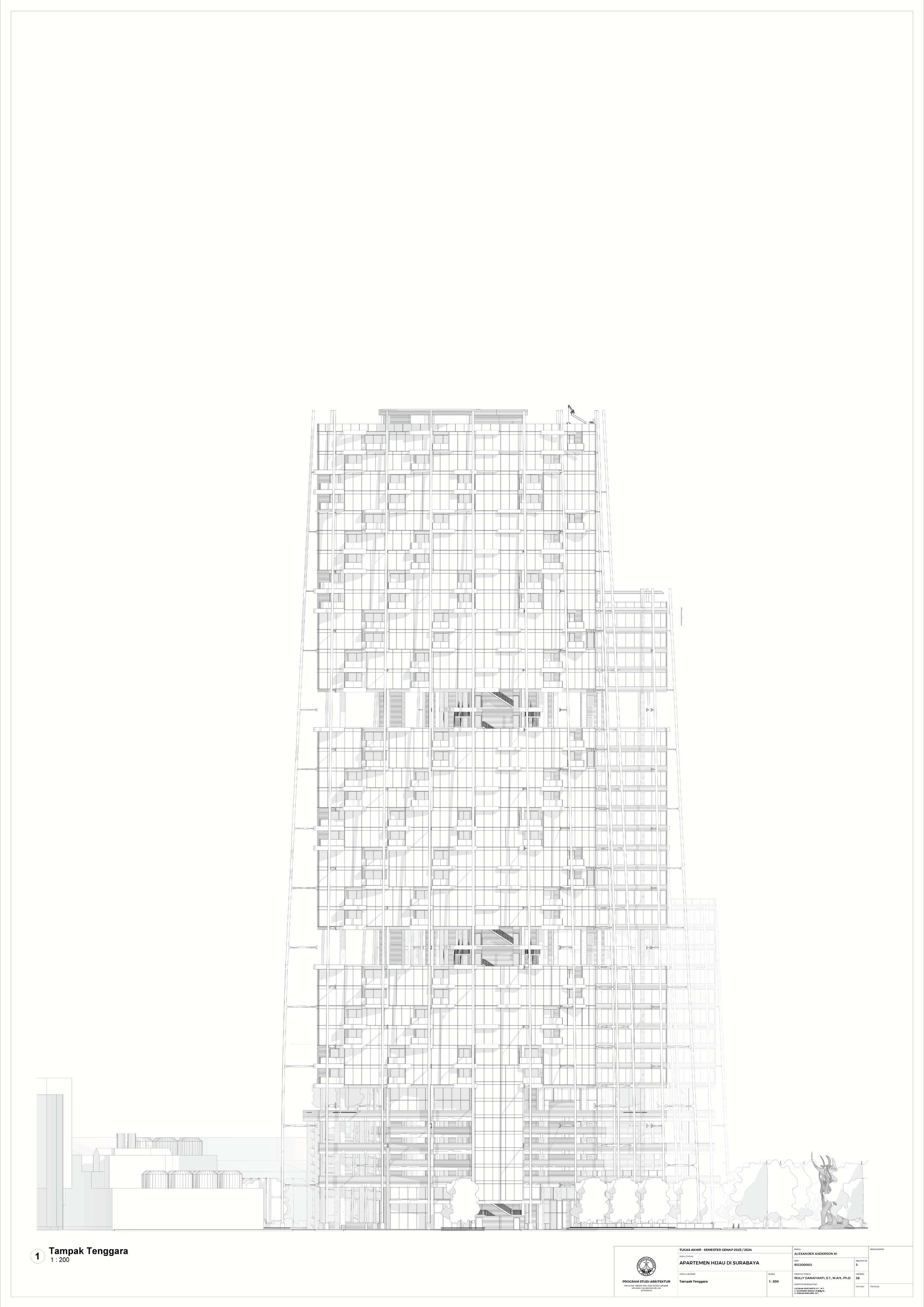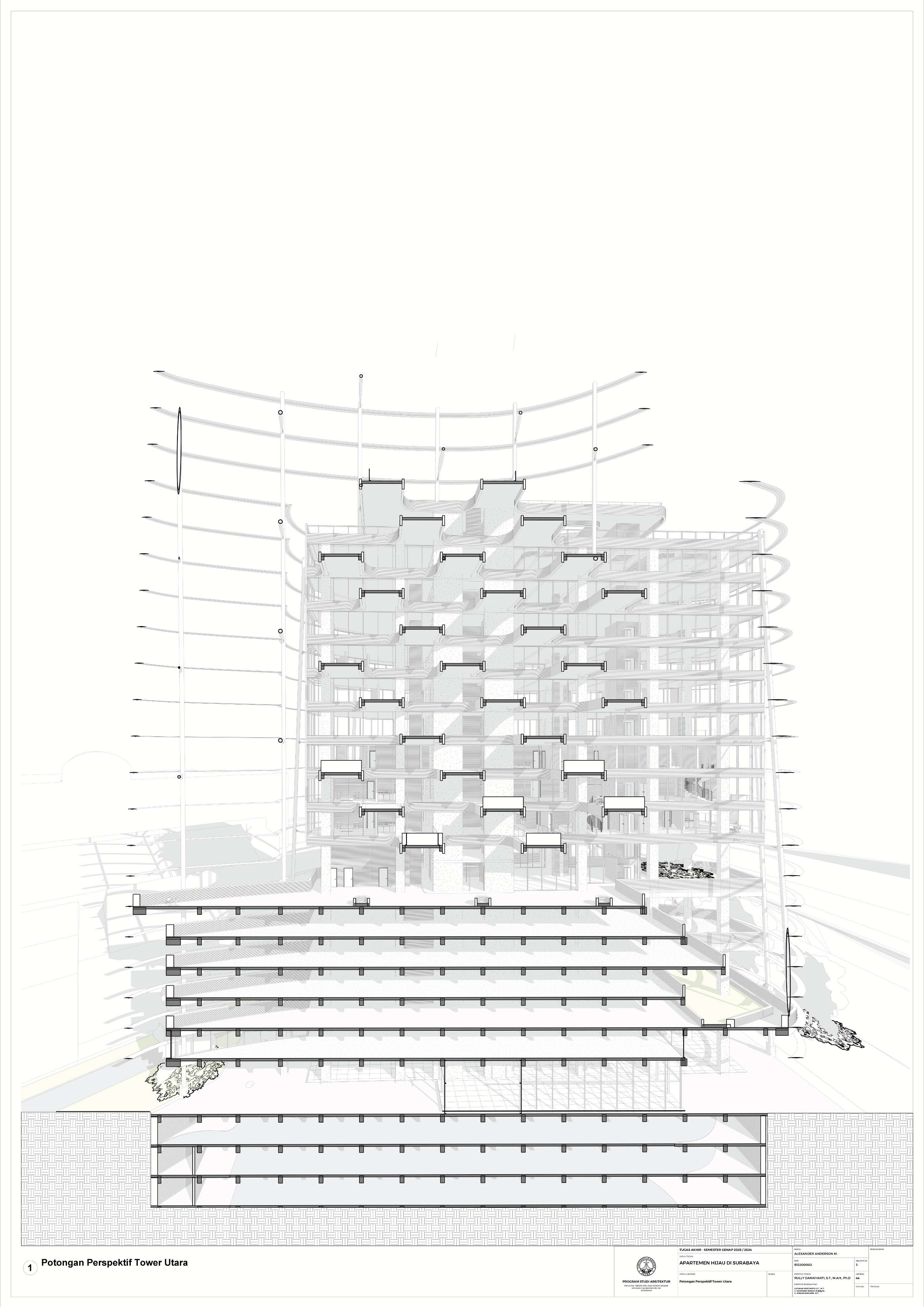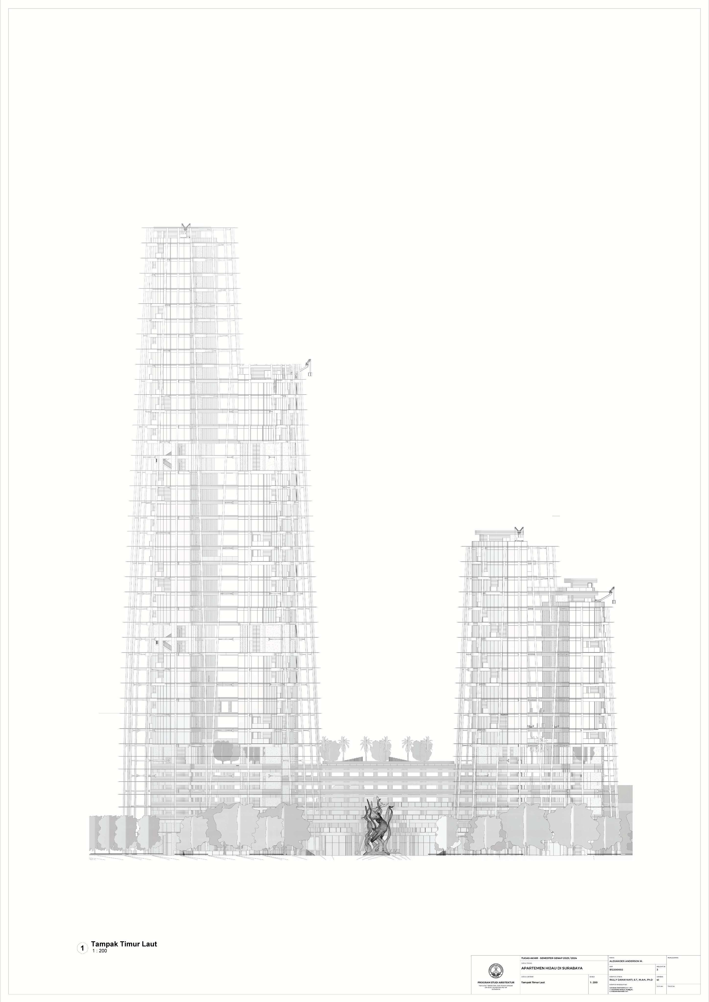 Kota Surabaya merupakan pusat perekonomian regional yang mengalami pertumbuhan populasi dan ekonomi setiap tahunnya. Meskipun telah bertumbuh meluas, Surabaya Pusat tetap merupakan salah satu pusat kegiatan terpenting di Kota Surabaya; hal ini ditunjukkan oleh kehadiran pengembangan-pengembangan baru di Surabaya Pusat. Namun, Surabaya Pusat sedang menghadapi tantangan tersembunyi, yakni kenaikan suhu area urban yang disebabkan oleh konstruksi serta minimnya ruang hijau terbuka. Fenomena yang diberi nama efek Urban Heat Island (UHI) ini semakin diperparah dengan pertumbuhan kota yang menimbulkan banyak pengembangan baru; menciptakan sebuah lingkaran umpan balik positif yang semakin memperparah efek UHI di Surabaya Pusat. Pengembangan-pengembangan baru sebaiknya mampu merespons pertumbuhan kota, namun dalam waktu yang sama, sekaligus merespons UHI. Proyek ini menawarkan sebuah pengembangan mixed-use berbasis hunian yang mengintegrasikan alam (cahaya, udara, vista, air, vegetasi) melalui pendekatan Nature-based Placemaking (NBP). Analisis pergerakan udara (CFD) mendasari orientasi dan bentuk bangunan untuk memperoleh penghawaan yang optimal. Dua buah tower hunian dengan segala fasilitas penunjangnya dihubungkan dengan podium komersil. Celah yang menerus secara diagonal pada setiap tower mempermudah laluan vista, cahaya dan udara; dan taman-taman gantung menyediakan ruang-ruang bagi penghijauan vertikal dan aktivitas luar ruangan di seluruh bangunan. Desain ini menciptakan sebuah kompleks baru yang merespons pertumbuhan kota sekaligus permasalahan iklim.