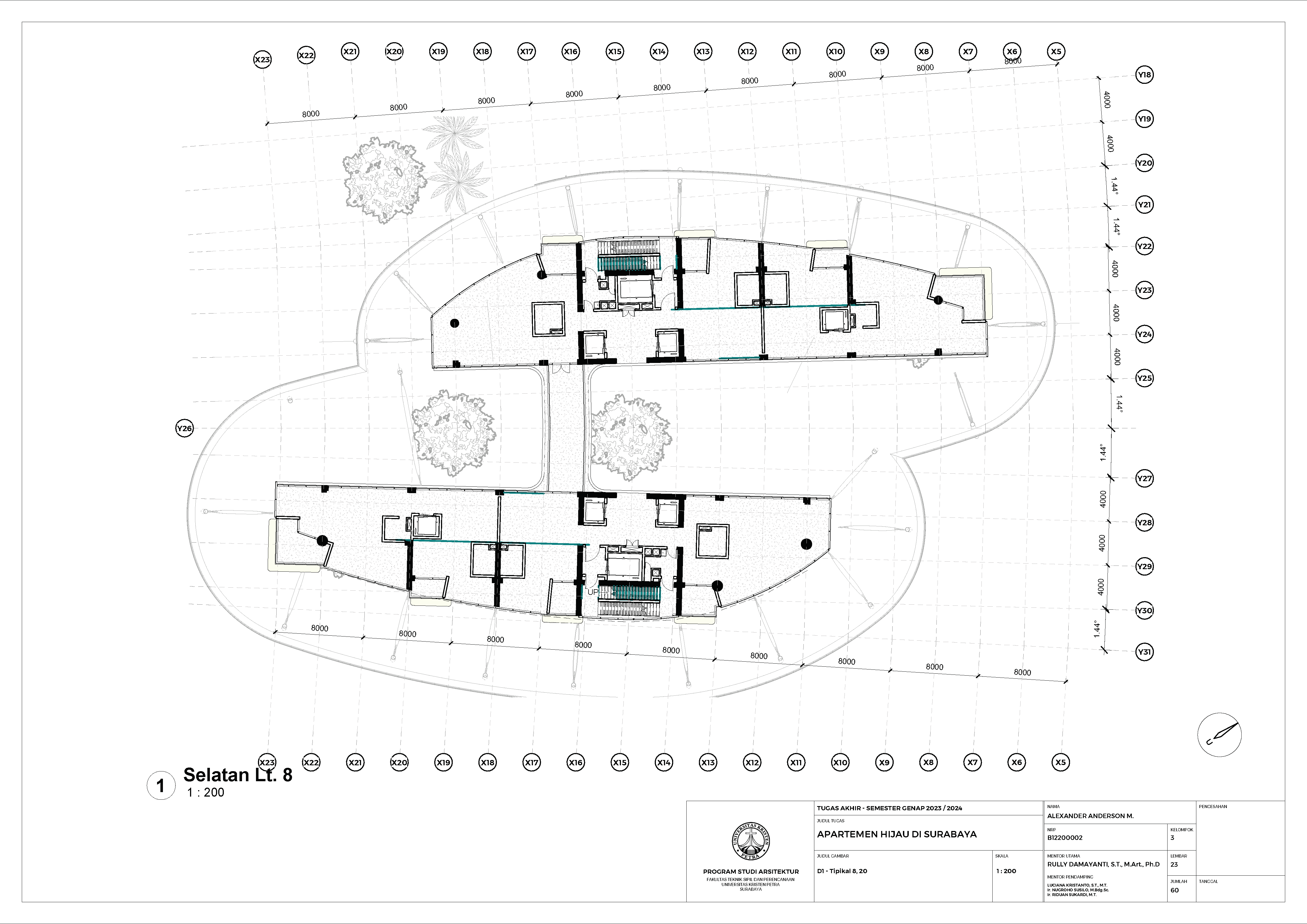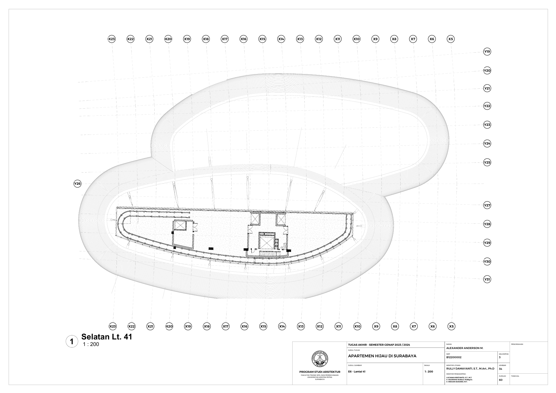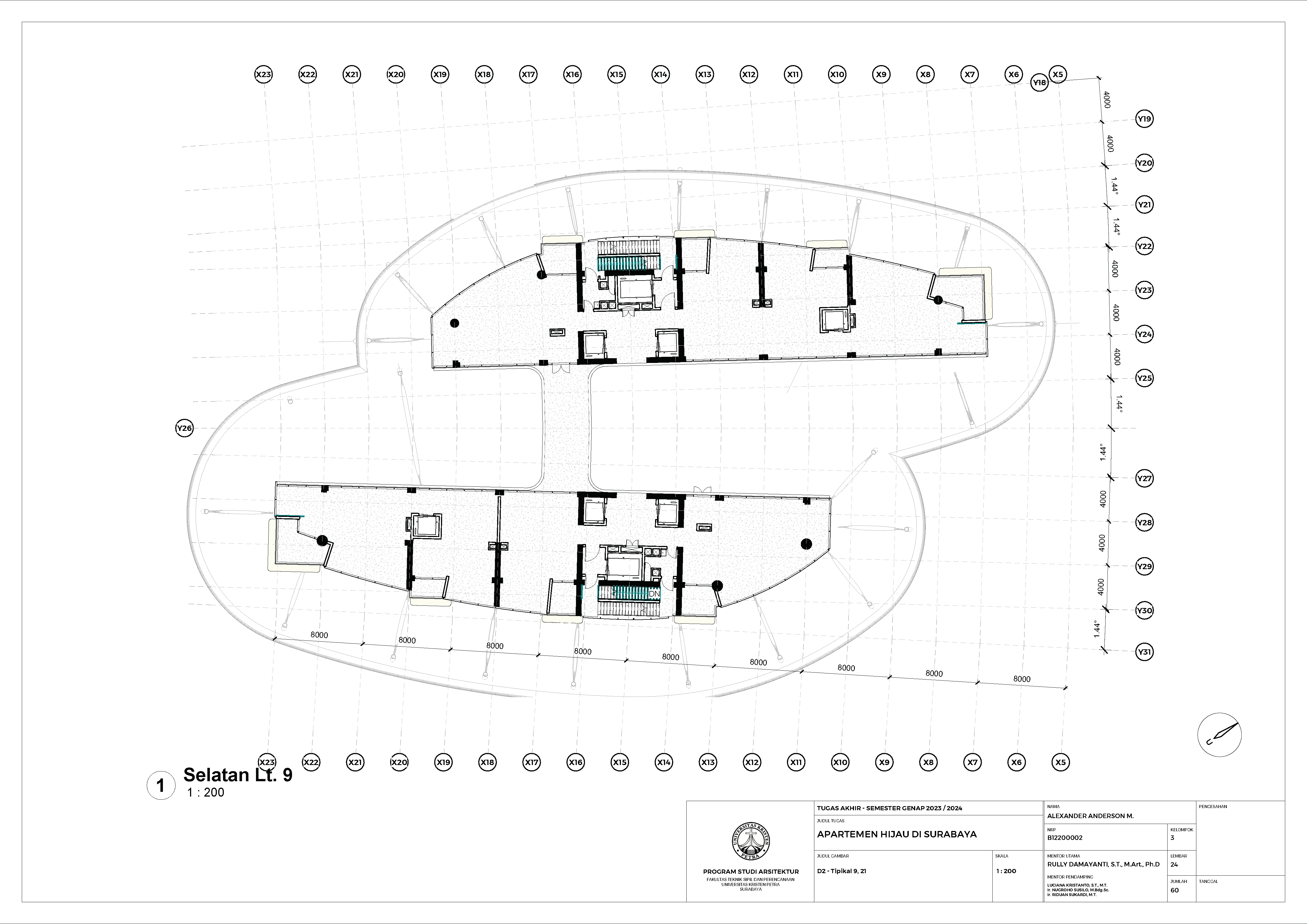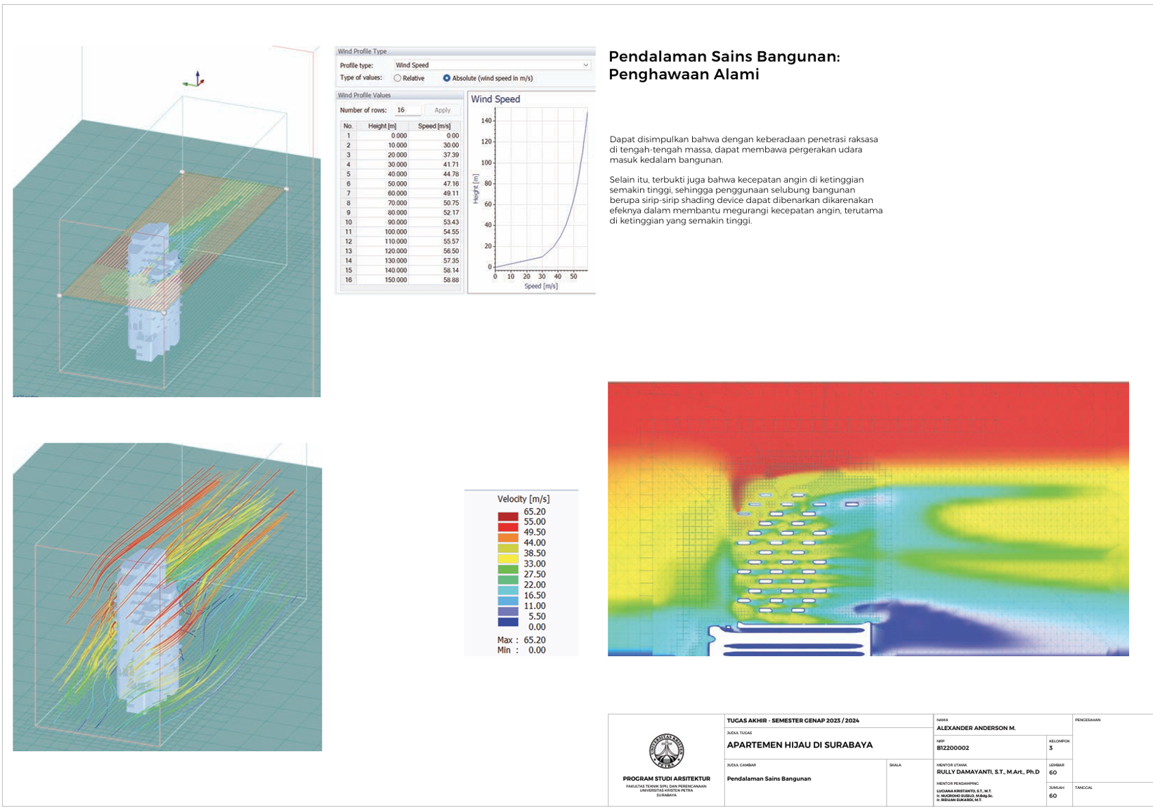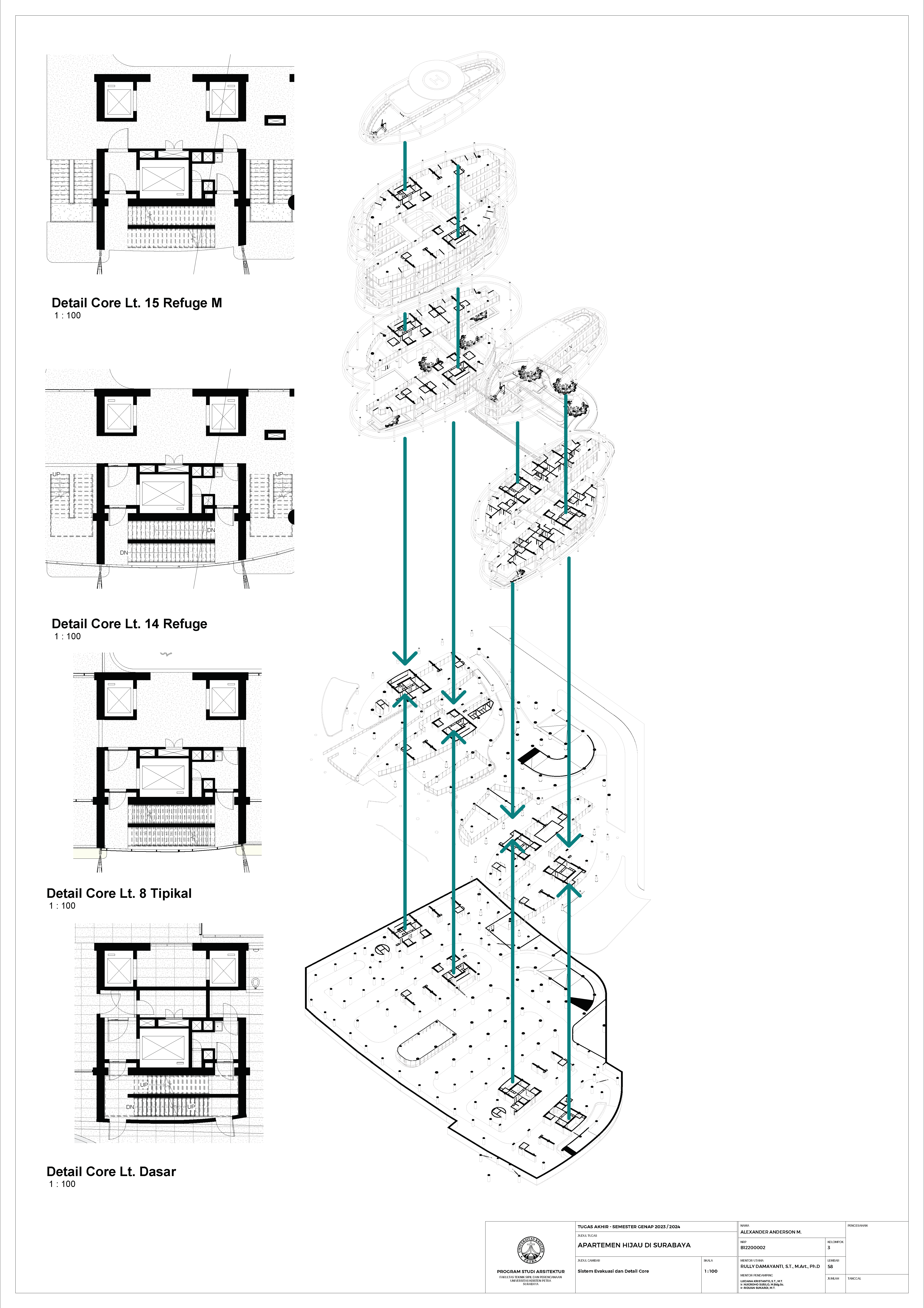 Kota Surabaya merupakan pusat perekonomian regional yang mengalami pertumbuhan populasi dan ekonomi setiap tahunnya. Meskipun telah bertumbuh meluas, Surabaya Pusat tetap merupakan salah satu pusat kegiatan terpenting di Kota Surabaya; hal ini ditunjukkan oleh kehadiran pengembangan-pengembangan baru di Surabaya Pusat. Namun, Surabaya Pusat sedang menghadapi tantangan tersembunyi, yakni kenaikan suhu area urban yang disebabkan oleh konstruksi serta minimnya ruang hijau terbuka. Fenomena yang diberi nama efek Urban Heat Island (UHI) ini semakin diperparah dengan pertumbuhan kota yang menimbulkan banyak pengembangan baru; menciptakan sebuah lingkaran umpan balik positif yang semakin memperparah efek UHI di Surabaya Pusat. Pengembangan-pengembangan baru sebaiknya mampu merespons pertumbuhan kota, namun dalam waktu yang sama, sekaligus merespons UHI. Proyek ini menawarkan sebuah pengembangan mixed-use berbasis hunian yang mengintegrasikan alam (cahaya, udara, vista, air, vegetasi) melalui pendekatan Nature-based Placemaking (NBP). Analisis pergerakan udara (CFD) mendasari orientasi dan bentuk bangunan untuk memperoleh penghawaan yang optimal. Dua buah tower hunian dengan segala fasilitas penunjangnya dihubungkan dengan podium komersil. Celah yang menerus secara diagonal pada setiap tower mempermudah laluan vista, cahaya dan udara; dan taman-taman gantung menyediakan ruang-ruang bagi penghijauan vertikal dan aktivitas luar ruangan di seluruh bangunan. Desain ini menciptakan sebuah kompleks baru yang merespons pertumbuhan kota sekaligus permasalahan iklim.