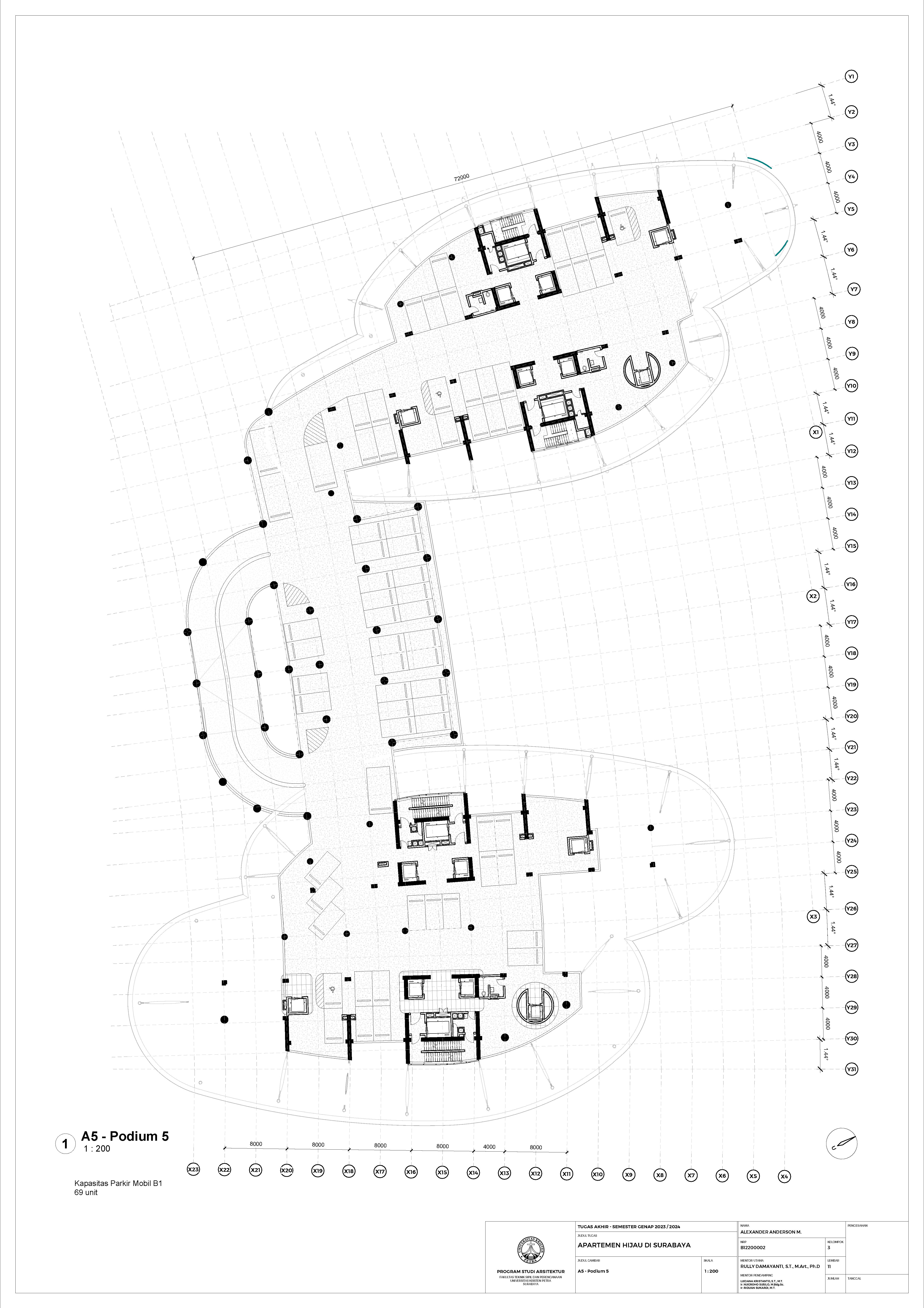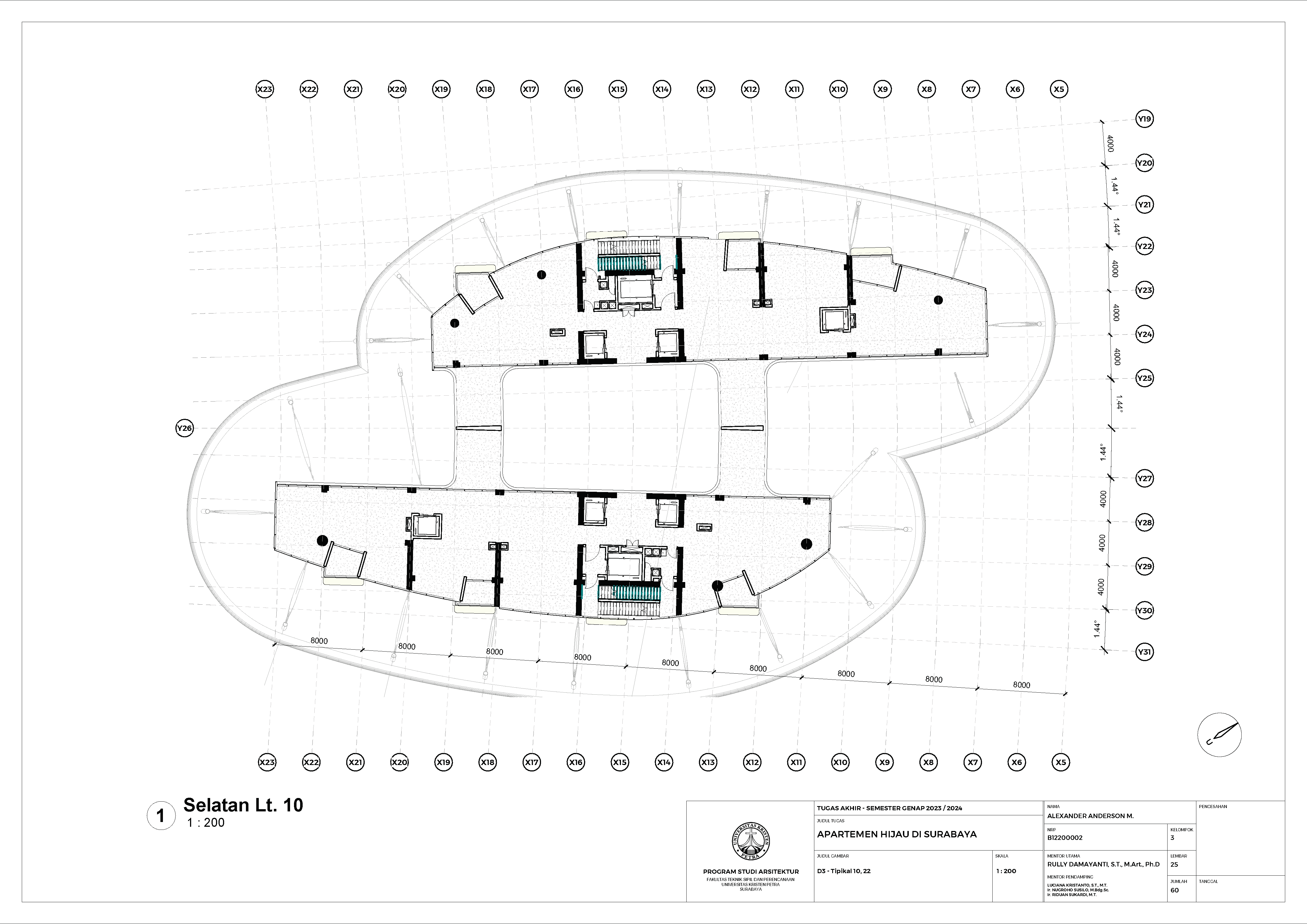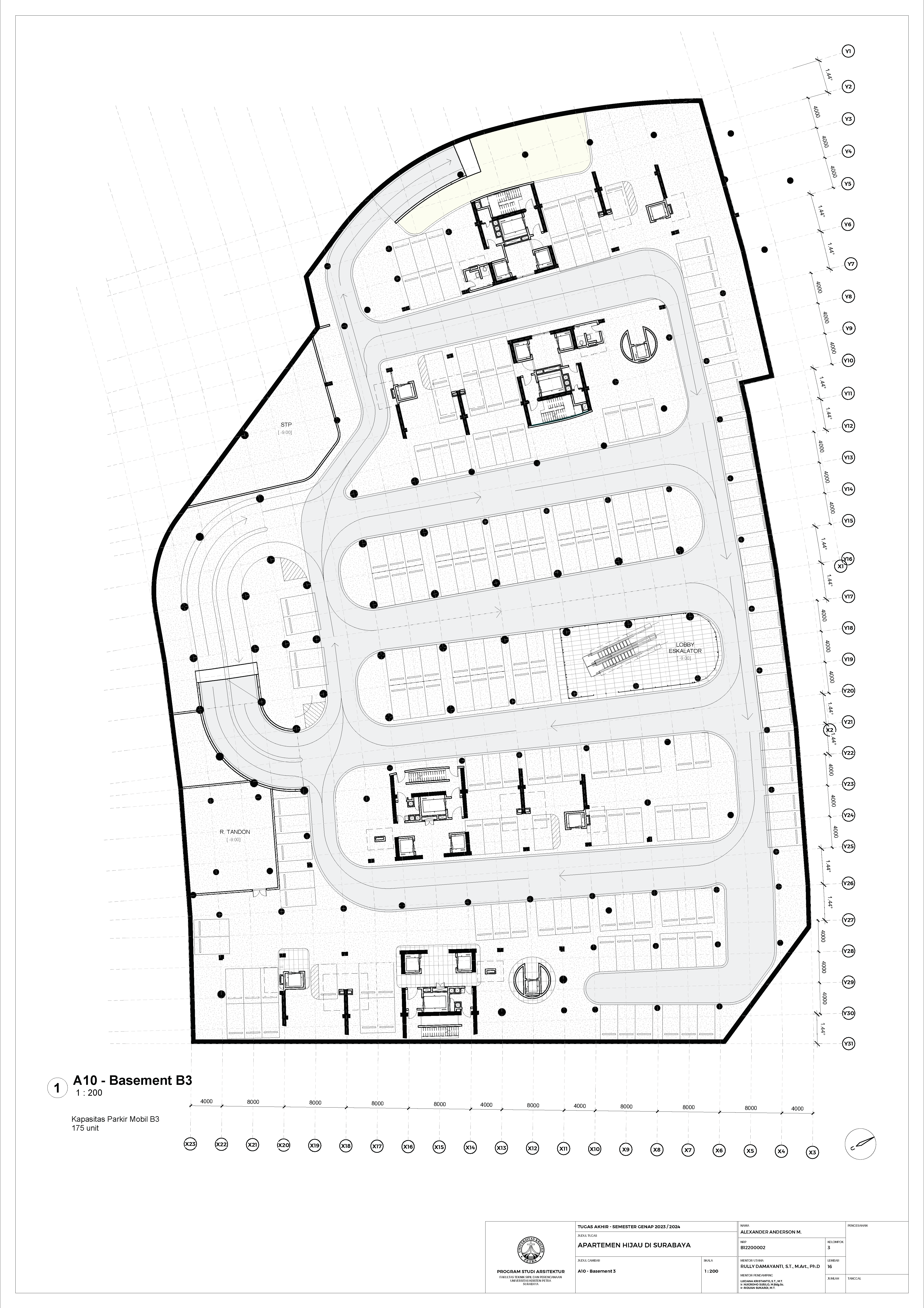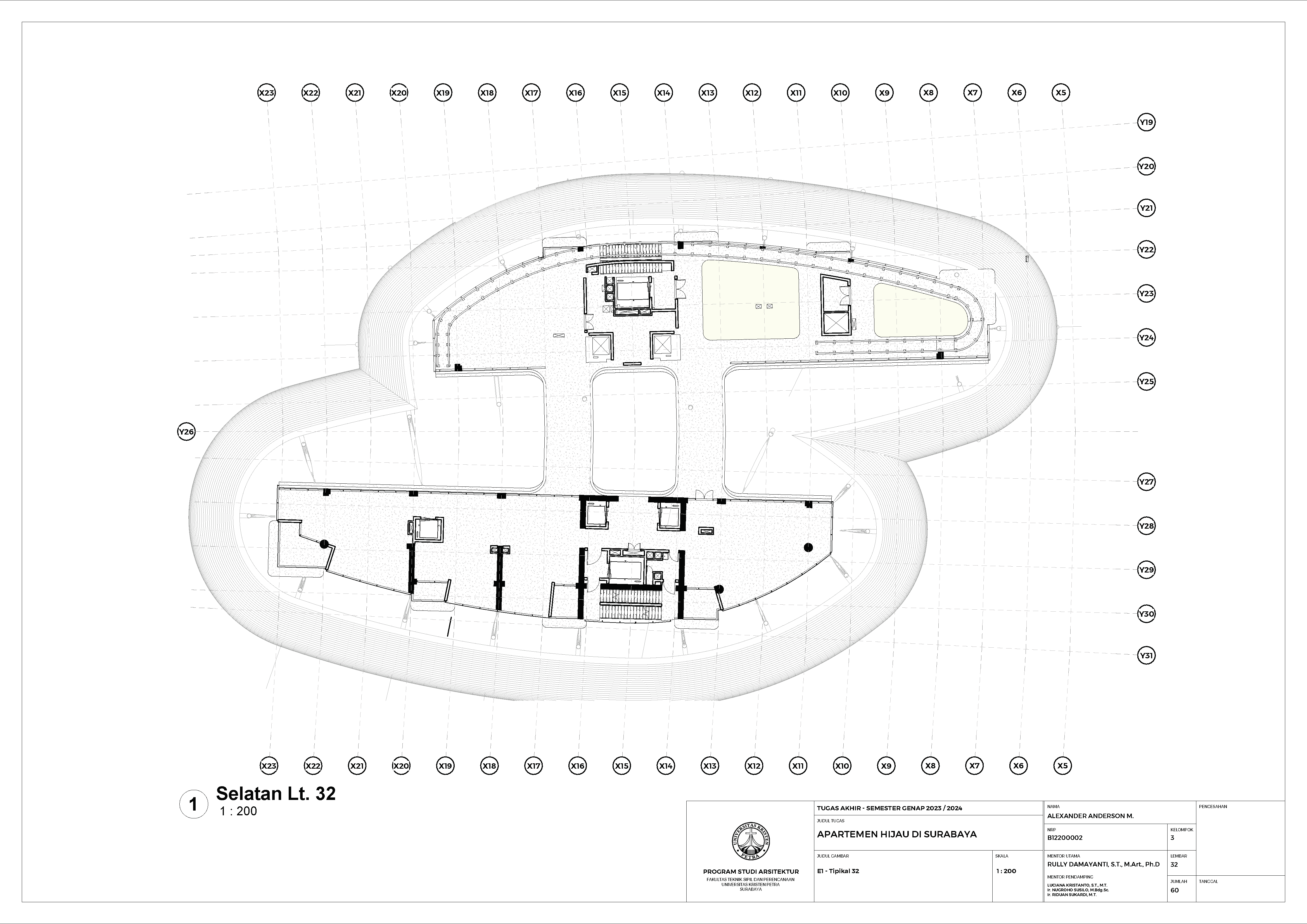 Kota Surabaya merupakan pusat perekonomian regional yang mengalami pertumbuhan populasi dan ekonomi setiap tahunnya. Meskipun telah bertumbuh meluas, Surabaya Pusat tetap merupakan salah satu pusat kegiatan terpenting di Kota Surabaya; hal ini ditunjukkan oleh kehadiran pengembangan-pengembangan baru di Surabaya Pusat. Namun, Surabaya Pusat sedang menghadapi tantangan tersembunyi, yakni kenaikan suhu area urban yang disebabkan oleh konstruksi serta minimnya ruang hijau terbuka. Fenomena yang diberi nama efek Urban Heat Island (UHI) ini semakin diperparah dengan pertumbuhan kota yang menimbulkan banyak pengembangan baru; menciptakan sebuah lingkaran umpan balik positif yang semakin memperparah efek UHI di Surabaya Pusat. Pengembangan-pengembangan baru sebaiknya mampu merespons pertumbuhan kota, namun dalam waktu yang sama, sekaligus merespons UHI. Proyek ini menawarkan sebuah pengembangan mixed-use berbasis hunian yang mengintegrasikan alam (cahaya, udara, vista, air, vegetasi) melalui pendekatan Nature-based Placemaking (NBP). Analisis pergerakan udara (CFD) mendasari orientasi dan bentuk bangunan untuk memperoleh penghawaan yang optimal. Dua buah tower hunian dengan segala fasilitas penunjangnya dihubungkan dengan podium komersil. Celah yang menerus secara diagonal pada setiap tower mempermudah laluan vista, cahaya dan udara; dan taman-taman gantung menyediakan ruang-ruang bagi penghijauan vertikal dan aktivitas luar ruangan di seluruh bangunan. Desain ini menciptakan sebuah kompleks baru yang merespons pertumbuhan kota sekaligus permasalahan iklim.
