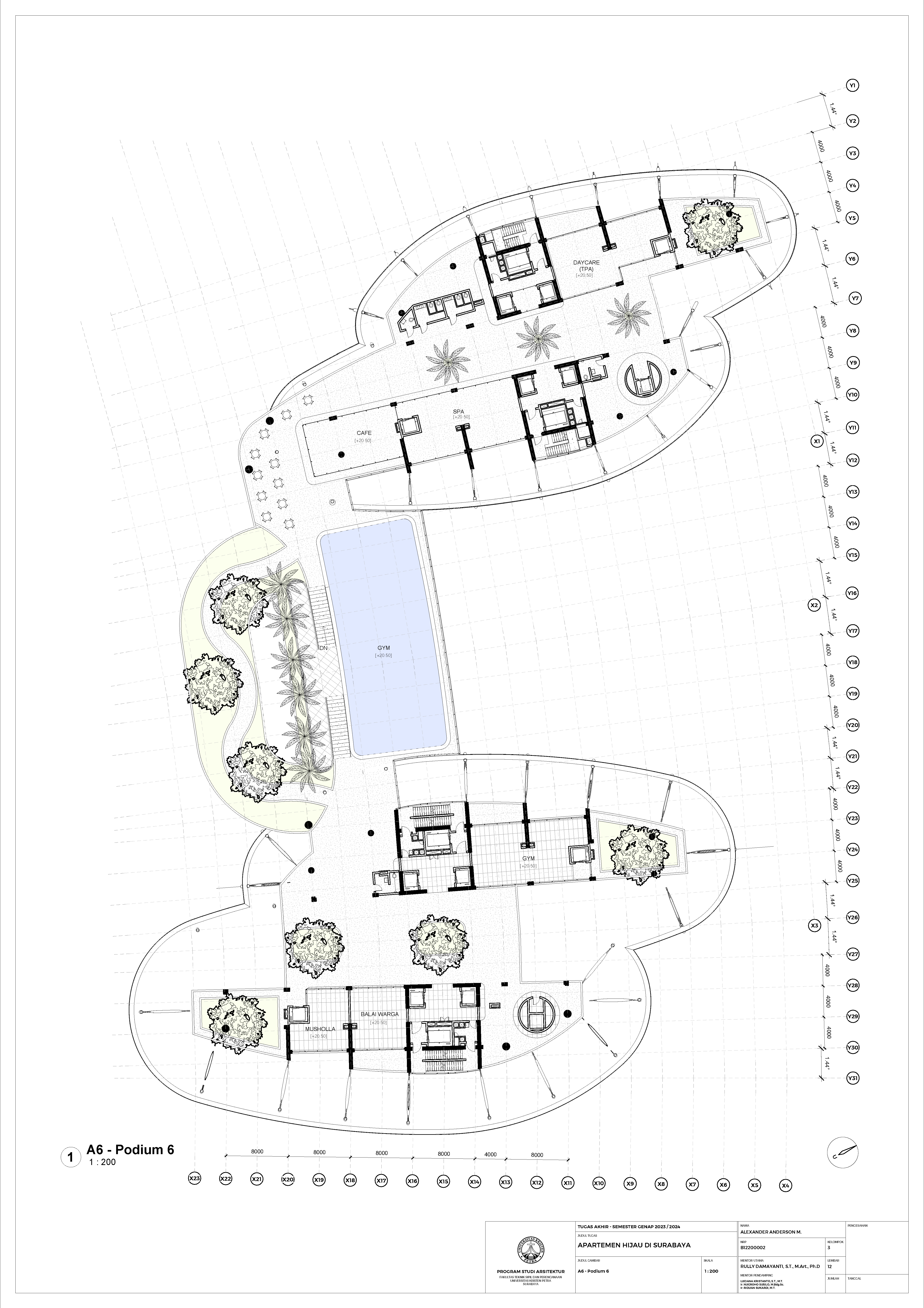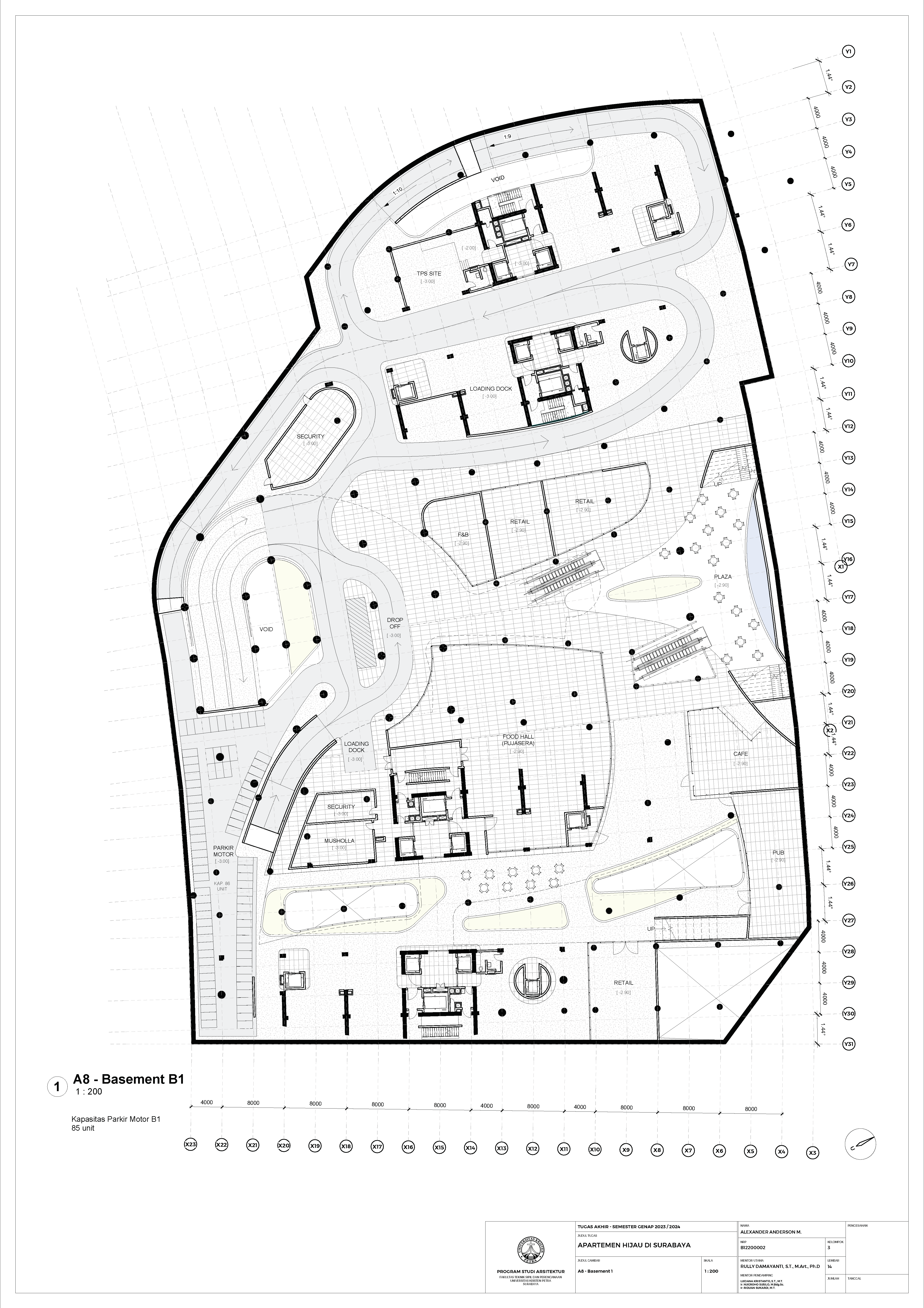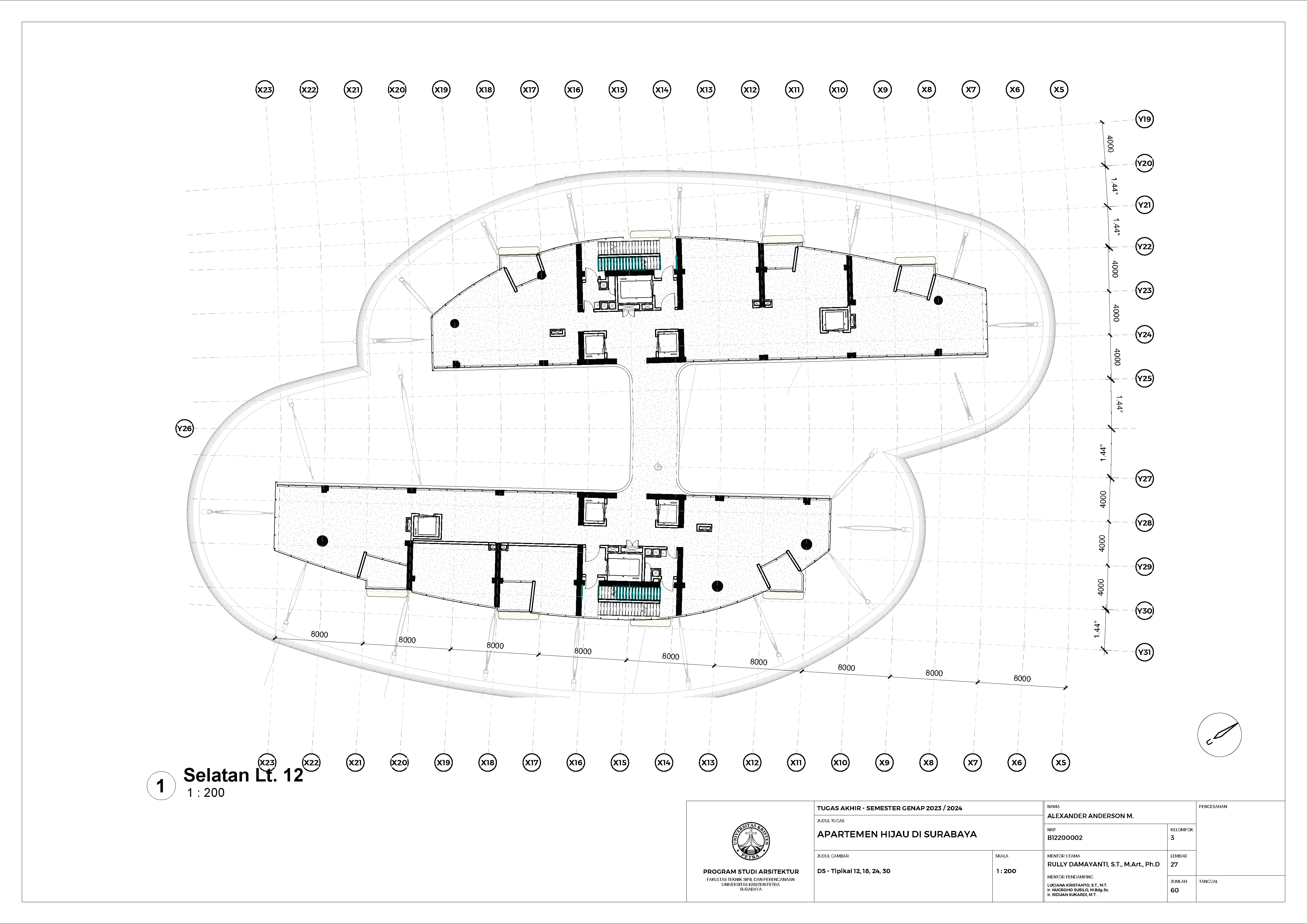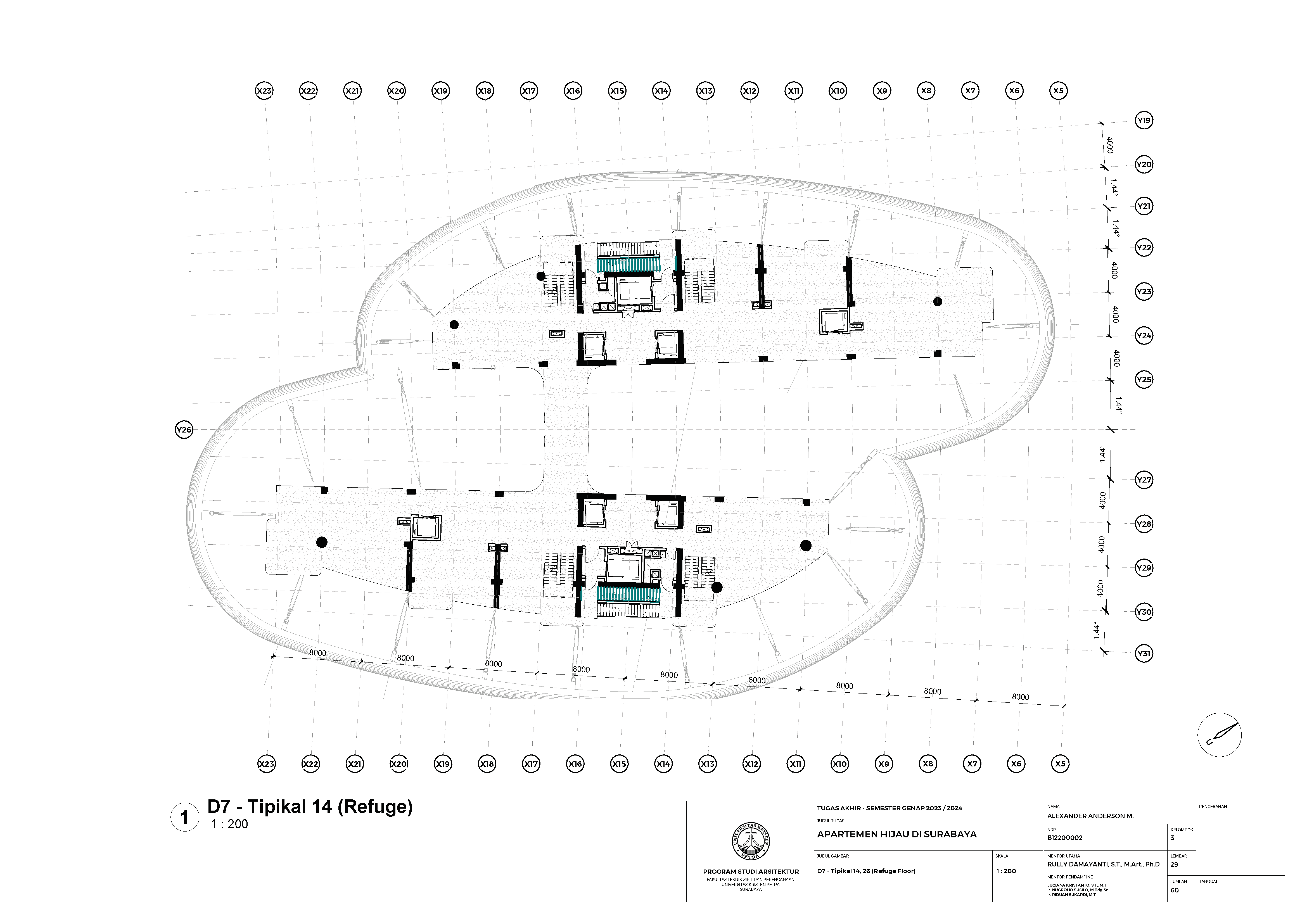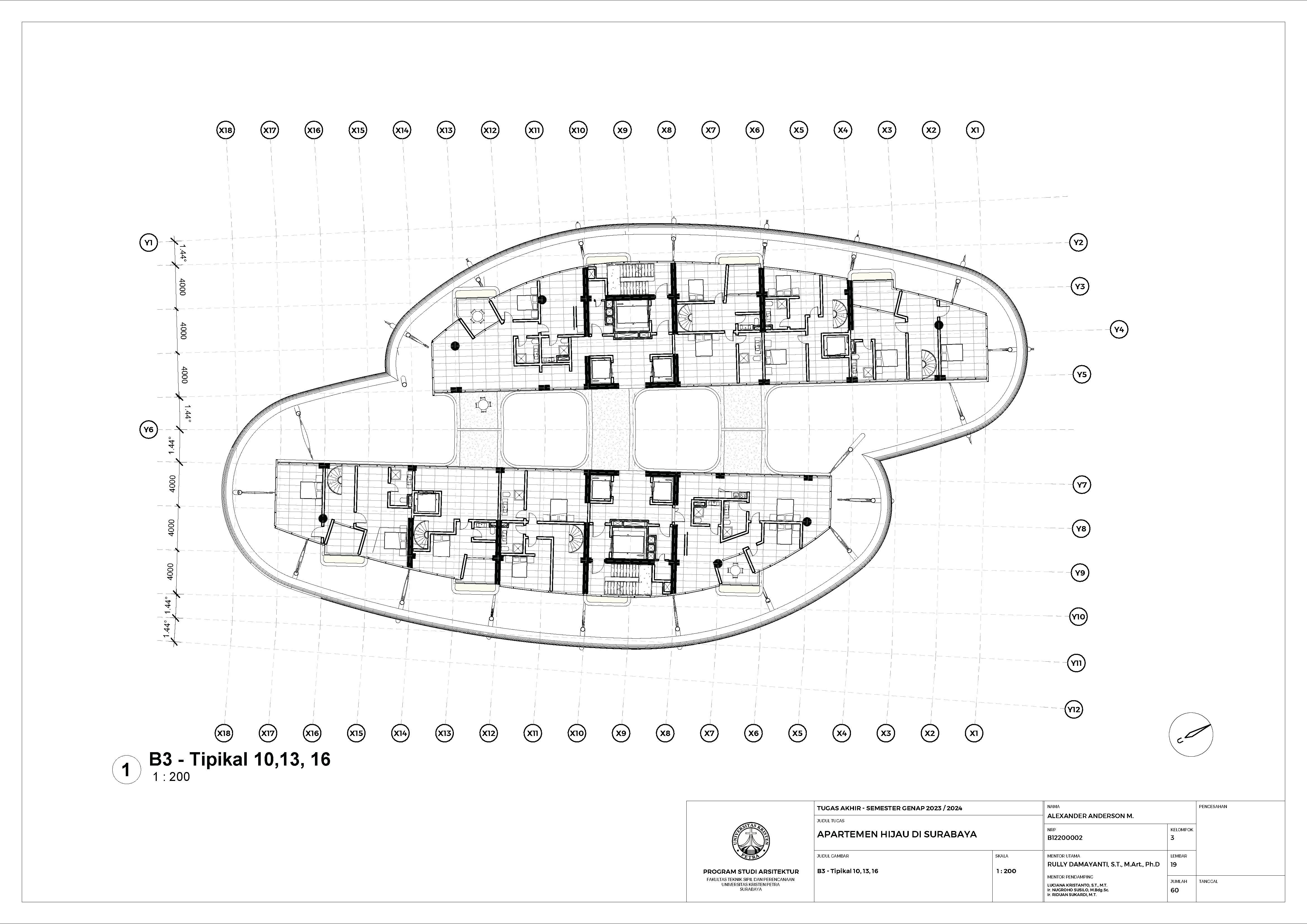 Kota Surabaya merupakan pusat perekonomian regional yang mengalami pertumbuhan populasi dan ekonomi setiap tahunnya. Meskipun telah bertumbuh meluas, Surabaya Pusat tetap merupakan salah satu pusat kegiatan terpenting di Kota Surabaya; hal ini ditunjukkan oleh kehadiran pengembangan-pengembangan baru di Surabaya Pusat. Namun, Surabaya Pusat sedang menghadapi tantangan tersembunyi, yakni kenaikan suhu area urban yang disebabkan oleh konstruksi serta minimnya ruang hijau terbuka. Fenomena yang diberi nama efek Urban Heat Island (UHI) ini semakin diperparah dengan pertumbuhan kota yang menimbulkan banyak pengembangan baru; menciptakan sebuah lingkaran umpan balik positif yang semakin memperparah efek UHI di Surabaya Pusat. Pengembangan-pengembangan baru sebaiknya mampu merespons pertumbuhan kota, namun dalam waktu yang sama, sekaligus merespons UHI. Proyek ini menawarkan sebuah pengembangan mixed-use berbasis hunian yang mengintegrasikan alam (cahaya, udara, vista, air, vegetasi) melalui pendekatan Nature-based Placemaking (NBP). Analisis pergerakan udara (CFD) mendasari orientasi dan bentuk bangunan untuk memperoleh penghawaan yang optimal. Dua buah tower hunian dengan segala fasilitas penunjangnya dihubungkan dengan podium komersil. Celah yang menerus secara diagonal pada setiap tower mempermudah laluan vista, cahaya dan udara; dan taman-taman gantung menyediakan ruang-ruang bagi penghijauan vertikal dan aktivitas luar ruangan di seluruh bangunan. Desain ini menciptakan sebuah kompleks baru yang merespons pertumbuhan kota sekaligus permasalahan iklim.