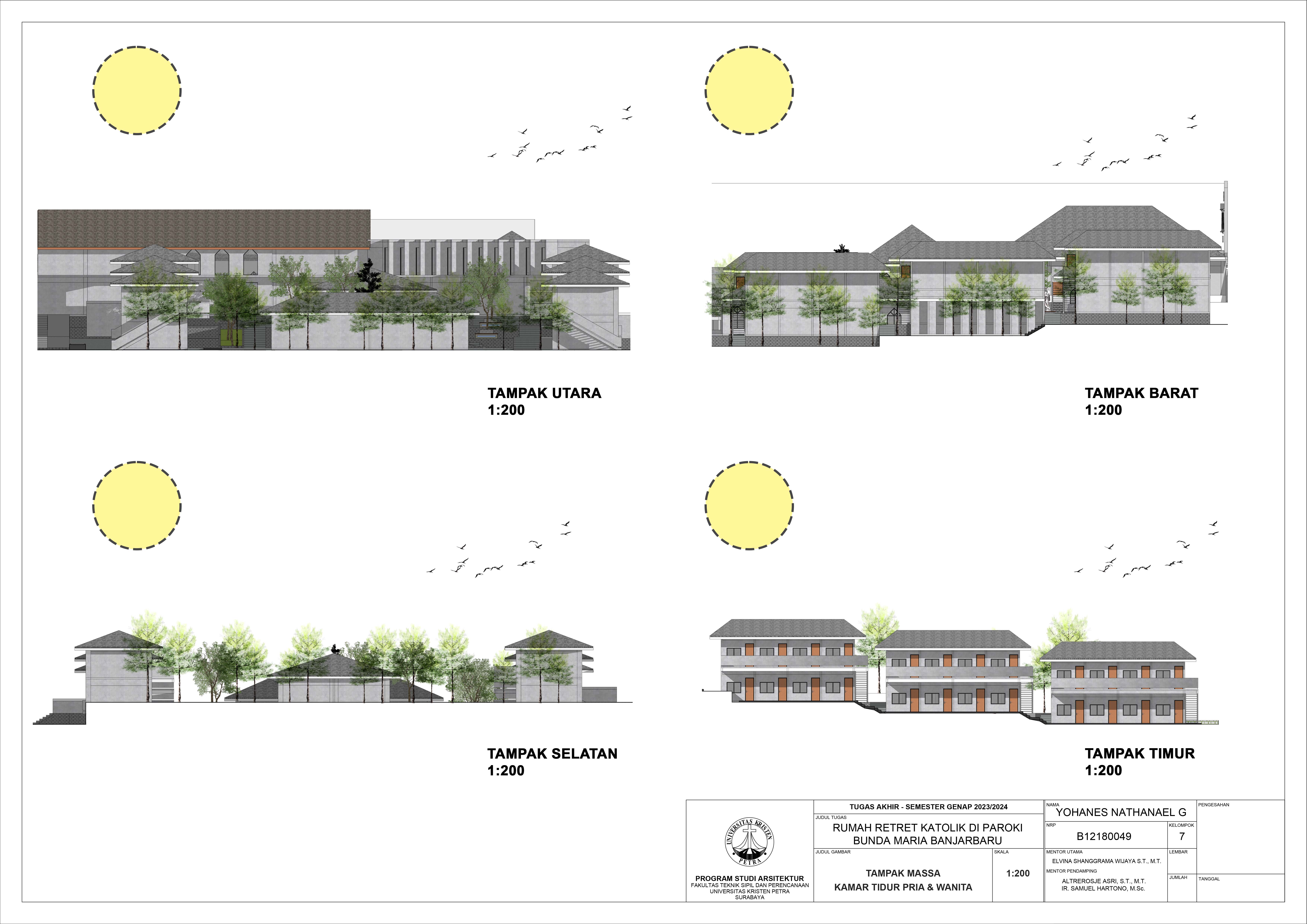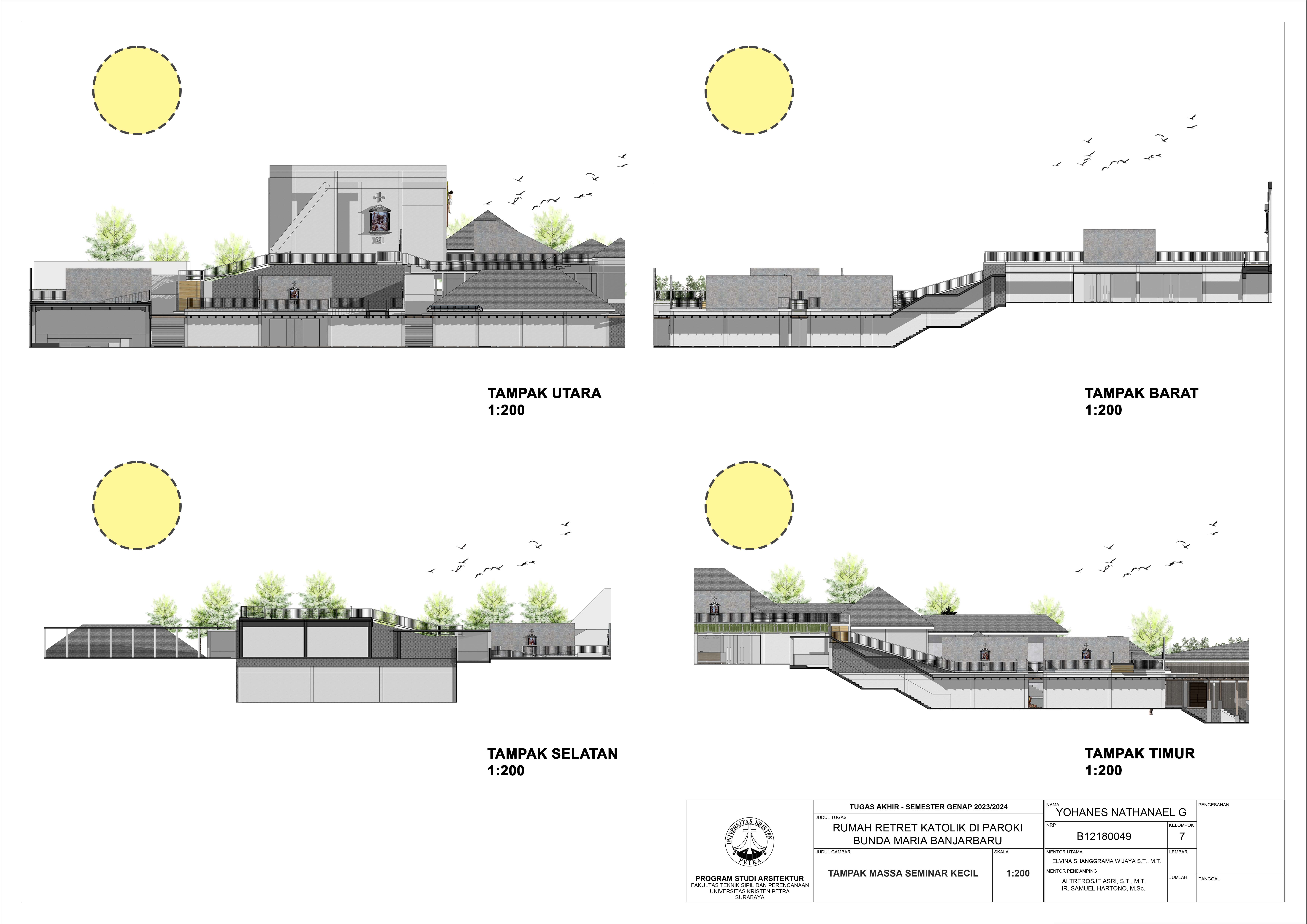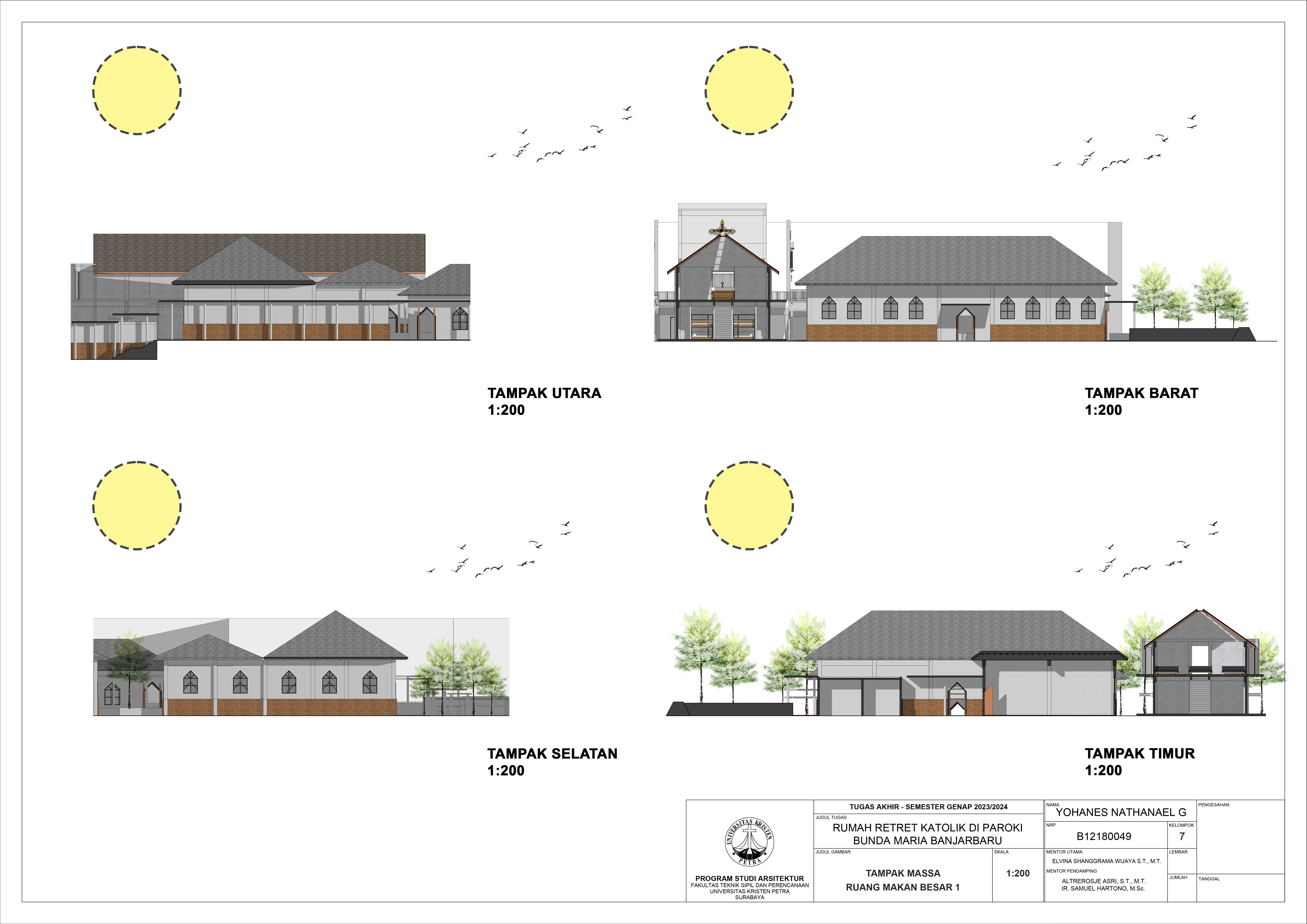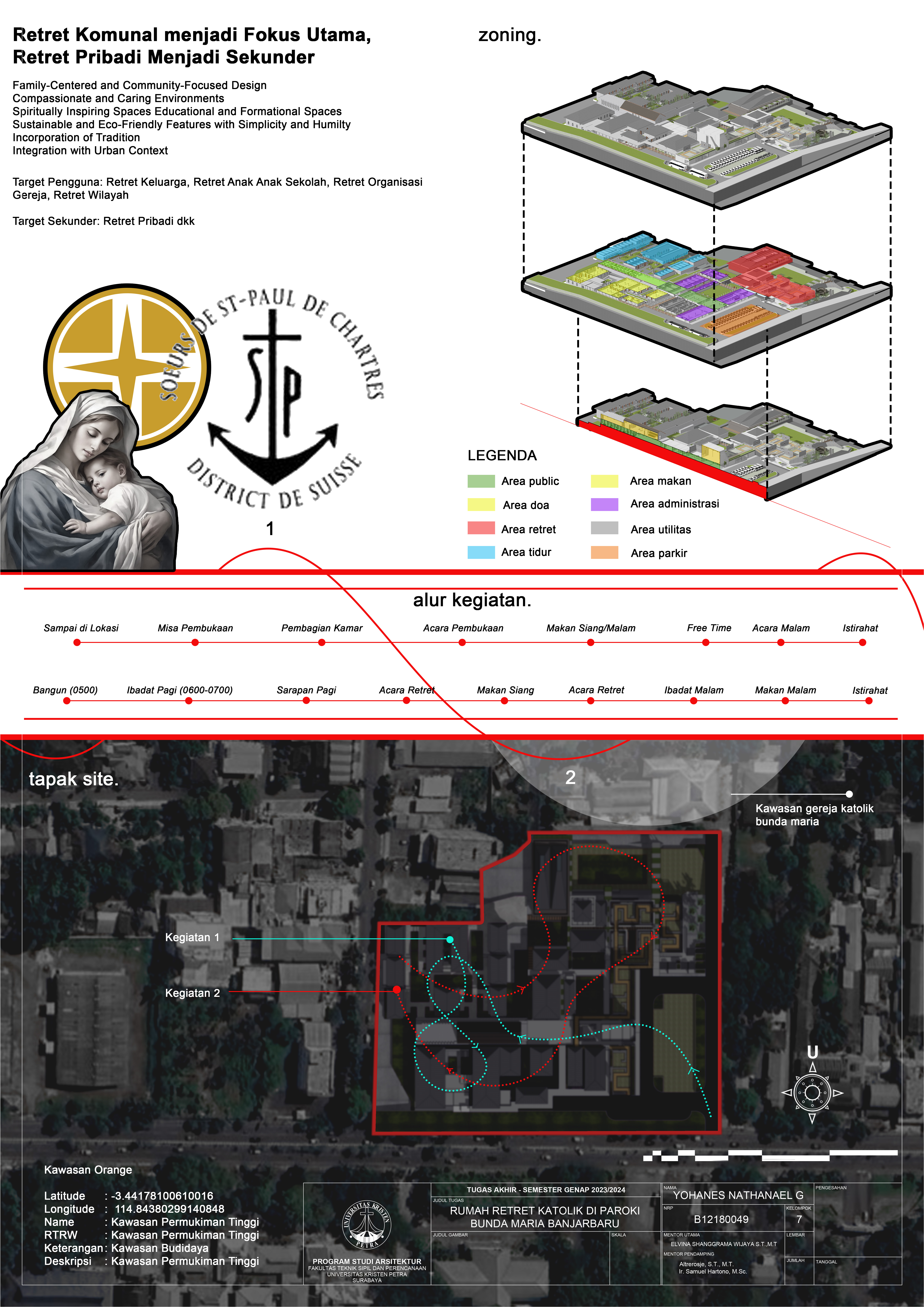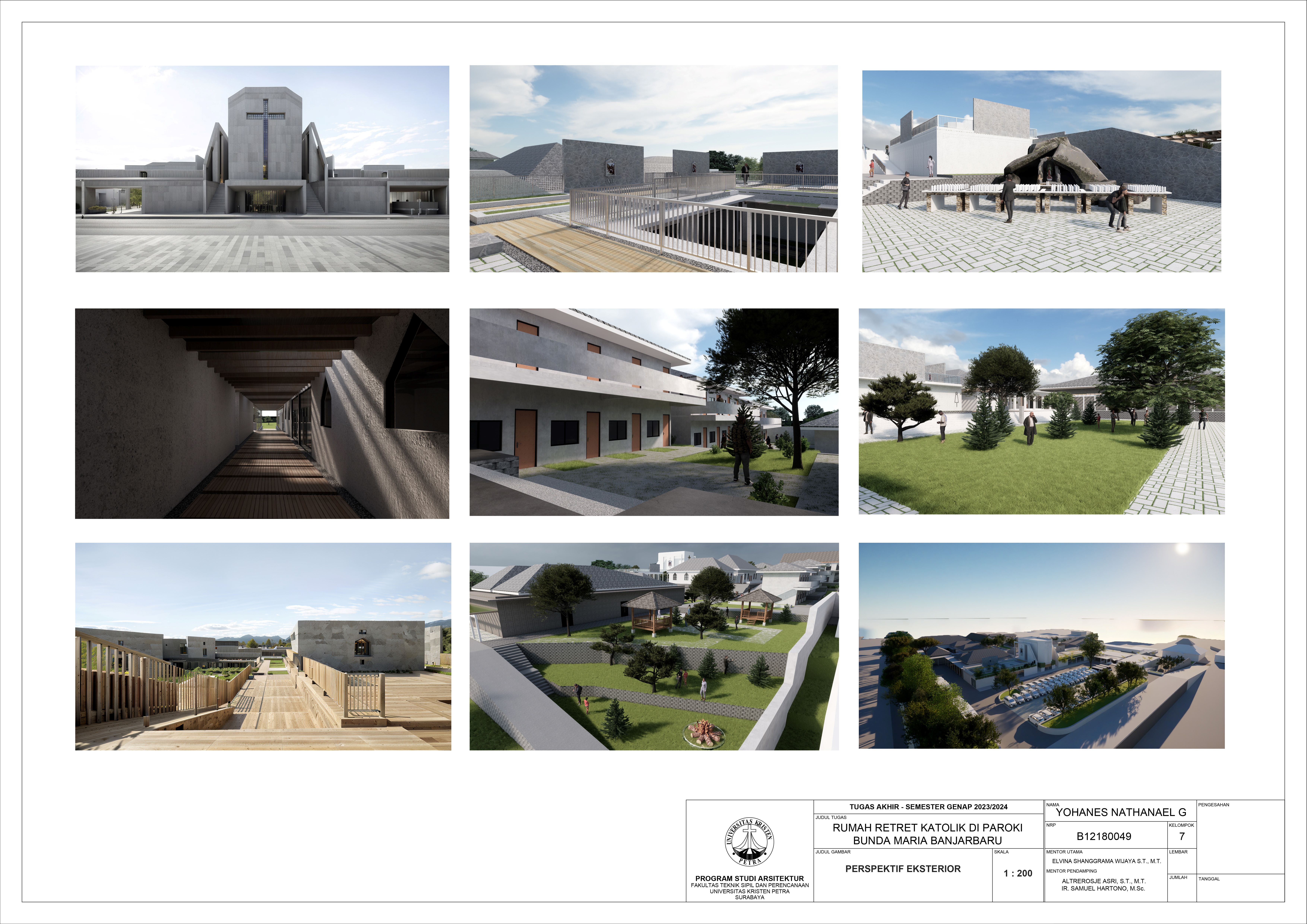 dan juga dihadapkan pada tantangan Ekonomi yang meningkat. Situasi ini menyoroti perlunya ruang-ruang suciuntuk memperdalam iman dan spiritualitas di tengah kesibukan dan tekanan kehidupan modern. Rumah RetretKatolik di Paroki Bunda Maria Banjarbaru adalah sebuah respons kebutuhan mendalam komunitas Katolik diKalimantan Selatan untuk memiliki tempat refleksi spiritual yang tenang dan mendalam. Perancangan RumahRetret ini menawarkan solusi dengan menyediakan fasilitas komprehensif termasuk kapel, ruang doa, aula, areahunian, ruang makan, serta fasilitas pendukung lainnya seperti toilet umum dan area parkir. Desainnyamengutamakan kesakralan dan kenyamanan personal dengan pendekatan holistik melalui penggunaan pencahayaan alami, lanskap yang terintegrasi, dan akustik yang mendukung. Penggunaan material yang dipilih dengan hati-hati dan penempatan strategis elemen religius juga memperkuat konsep desain yang mengutamakan kontemplasi dan interaksi spiritual. Inisiatif ini bertujuan untuk memperbarui dan memodernisasi fasilitas spiritual, yang ditunjukkan dengan transformasi dari Wisma Sikhar yang sudah tua menjadi Rumah Retret modern yang memenuhi kebutuhan spiritual saat ini sambil mempertahankan signifikansi historis dan spiritualnya.