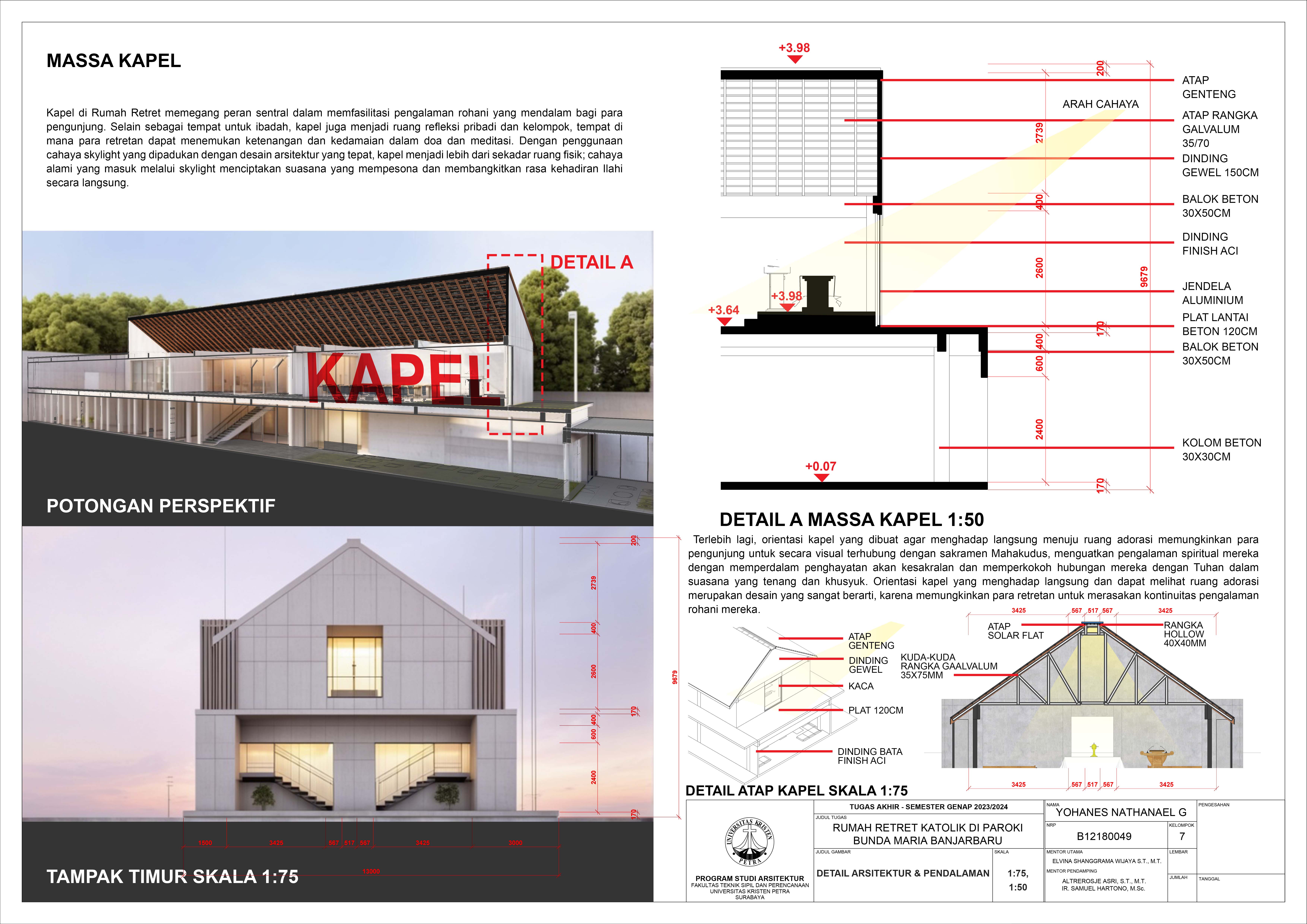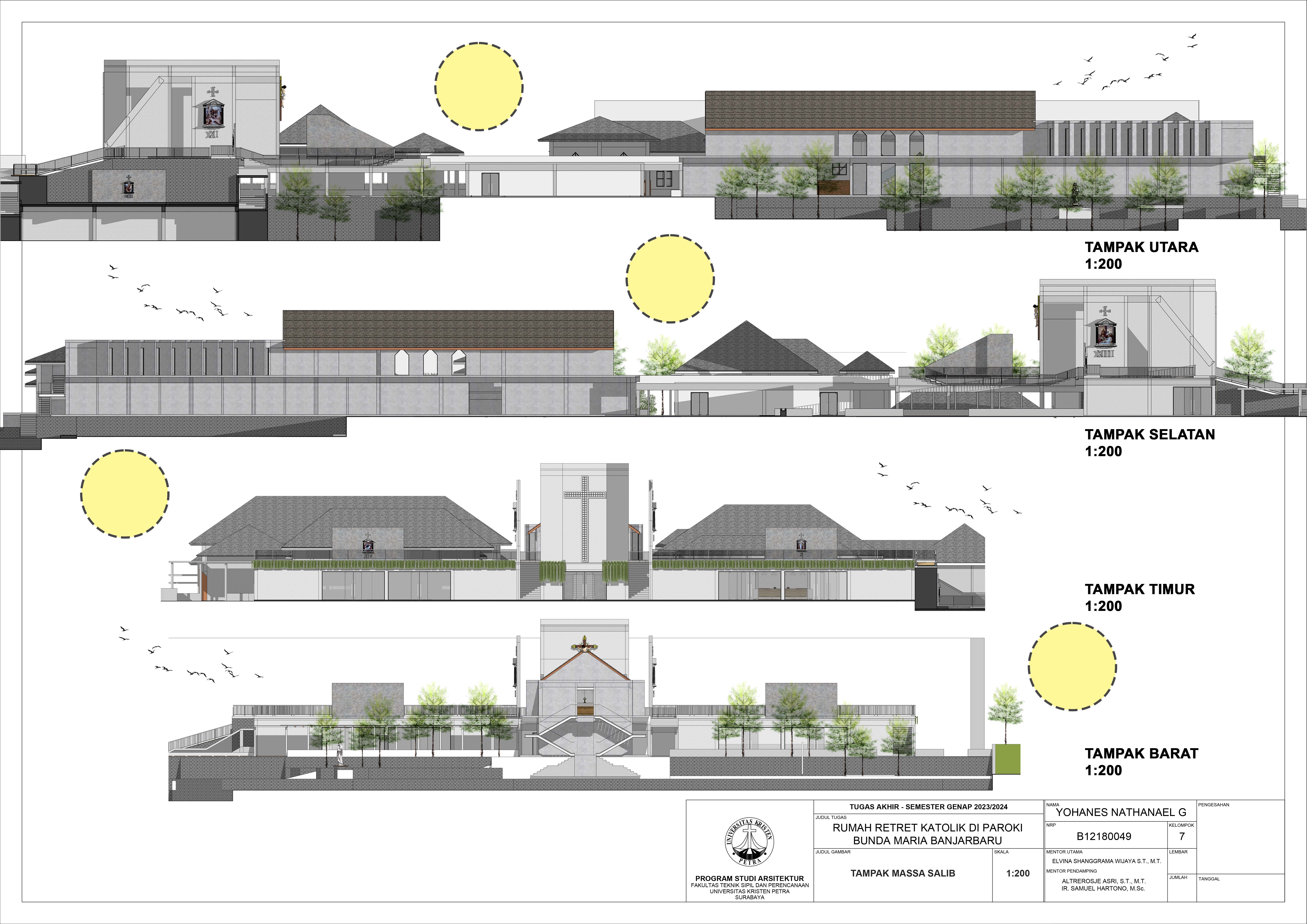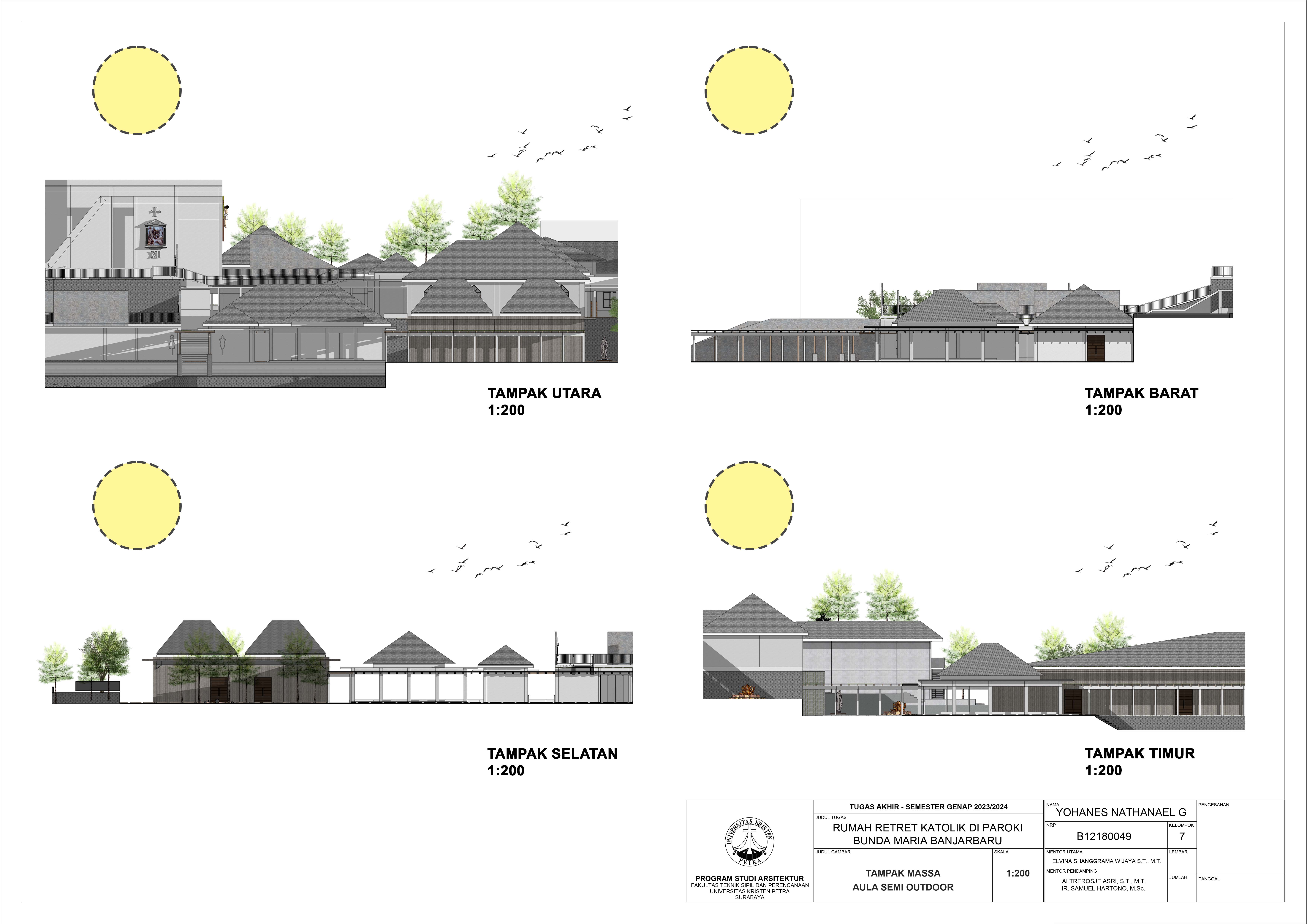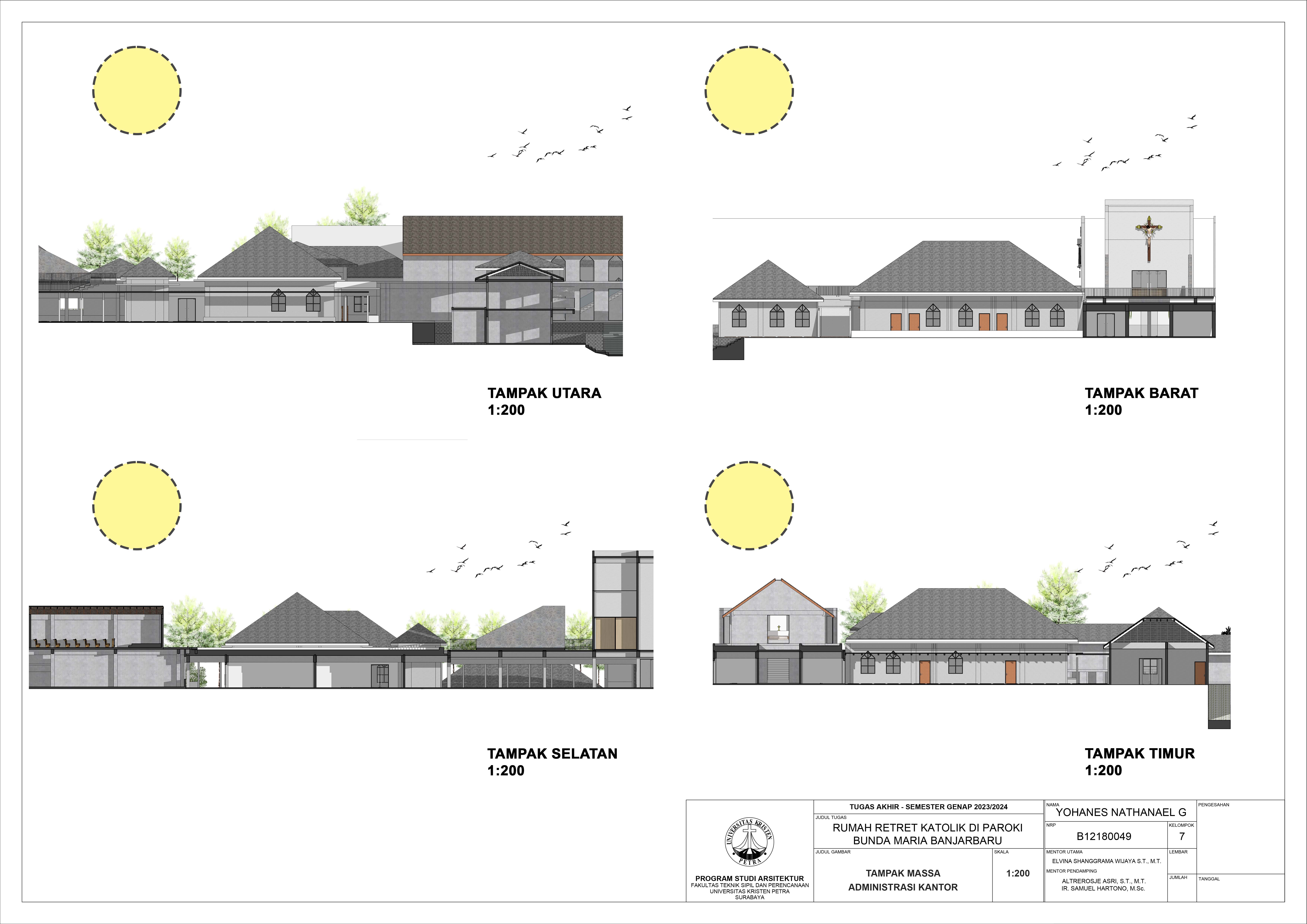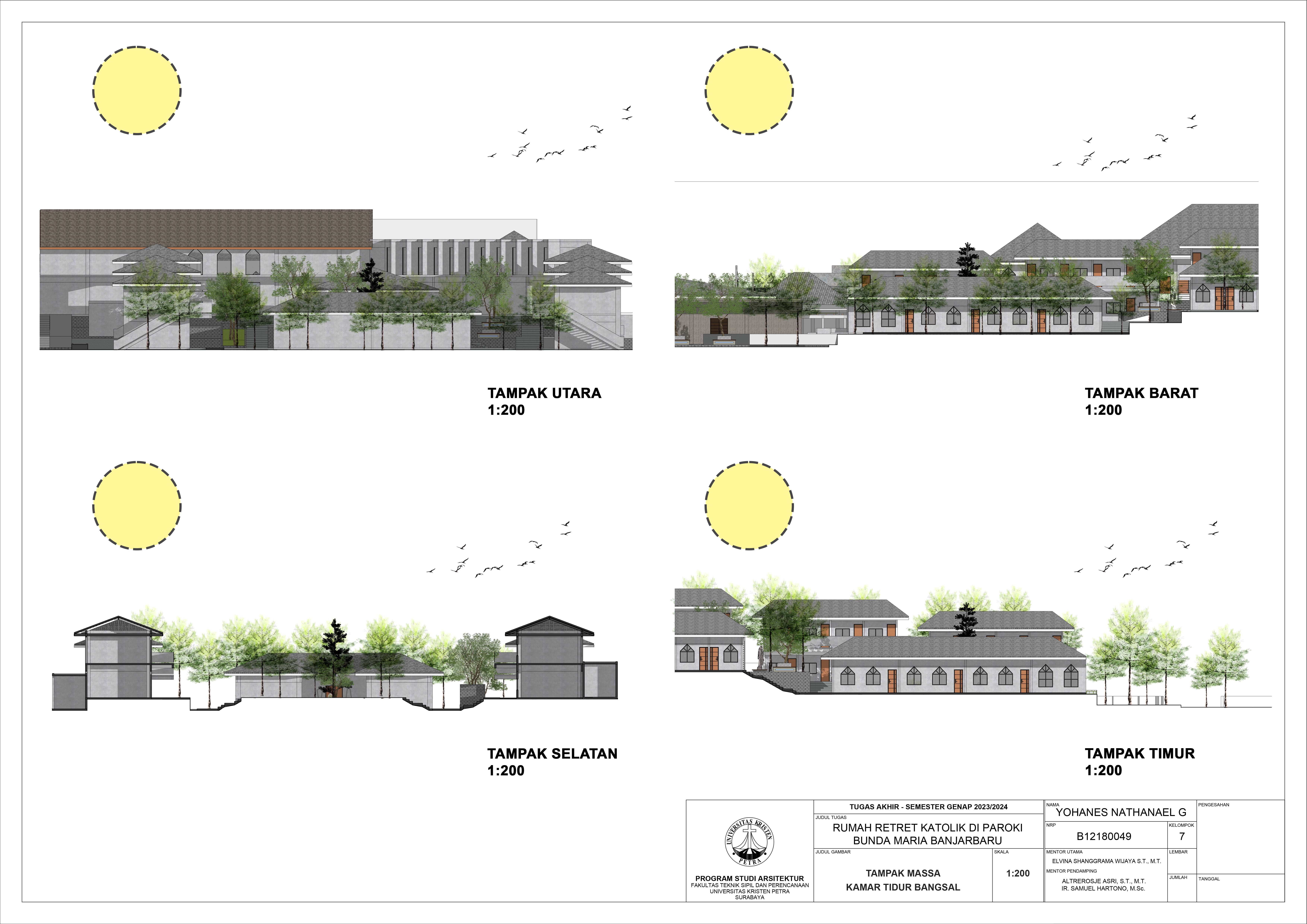 dan juga dihadapkan pada tantangan Ekonomi yang meningkat. Situasi ini menyoroti perlunya ruang-ruang suciuntuk memperdalam iman dan spiritualitas di tengah kesibukan dan tekanan kehidupan modern. Rumah RetretKatolik di Paroki Bunda Maria Banjarbaru adalah sebuah respons kebutuhan mendalam komunitas Katolik diKalimantan Selatan untuk memiliki tempat refleksi spiritual yang tenang dan mendalam. Perancangan RumahRetret ini menawarkan solusi dengan menyediakan fasilitas komprehensif termasuk kapel, ruang doa, aula, areahunian, ruang makan, serta fasilitas pendukung lainnya seperti toilet umum dan area parkir. Desainnyamengutamakan kesakralan dan kenyamanan personal dengan pendekatan holistik melalui penggunaan pencahayaan alami, lanskap yang terintegrasi, dan akustik yang mendukung. Penggunaan material yang dipilih dengan hati-hati dan penempatan strategis elemen religius juga memperkuat konsep desain yang mengutamakan kontemplasi dan interaksi spiritual. Inisiatif ini bertujuan untuk memperbarui dan memodernisasi fasilitas spiritual, yang ditunjukkan dengan transformasi dari Wisma Sikhar yang sudah tua menjadi Rumah Retret modern yang memenuhi kebutuhan spiritual saat ini sambil mempertahankan signifikansi historis dan spiritualnya.